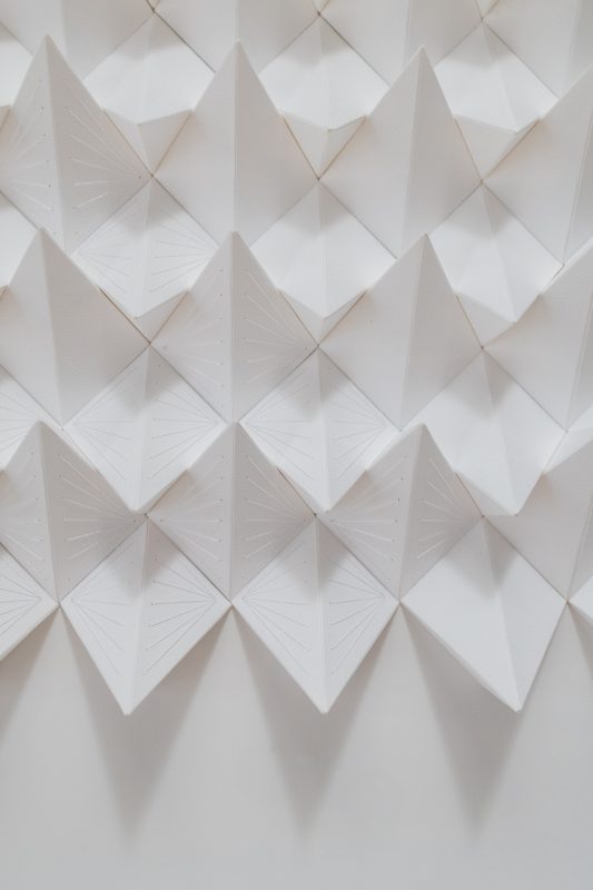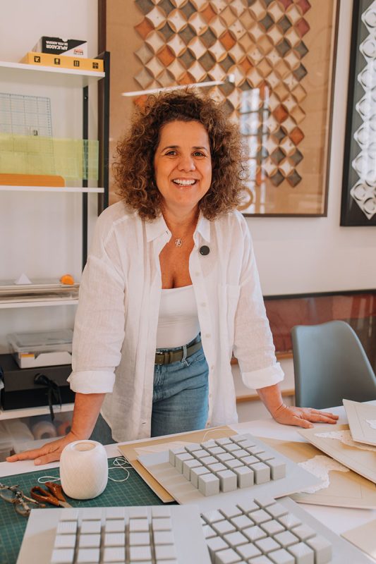 Com um percurso de vida marcado pela dedicação à família e aos estudos, Adriana encontrou na arte uma forma de se resgatar a si mesma. Formada em Matemática, Comunicação Visual e Artes Plásticas, reúne em seu processo criativo a exatidão da geometria, o apuro estético do design e a liberdade sensível das artes manuais. Tudo isso traduzido em composições que brincam com dobras, bordados, tramas e linhas. Sempre carregadas de delicadeza, significado e movimento.