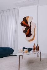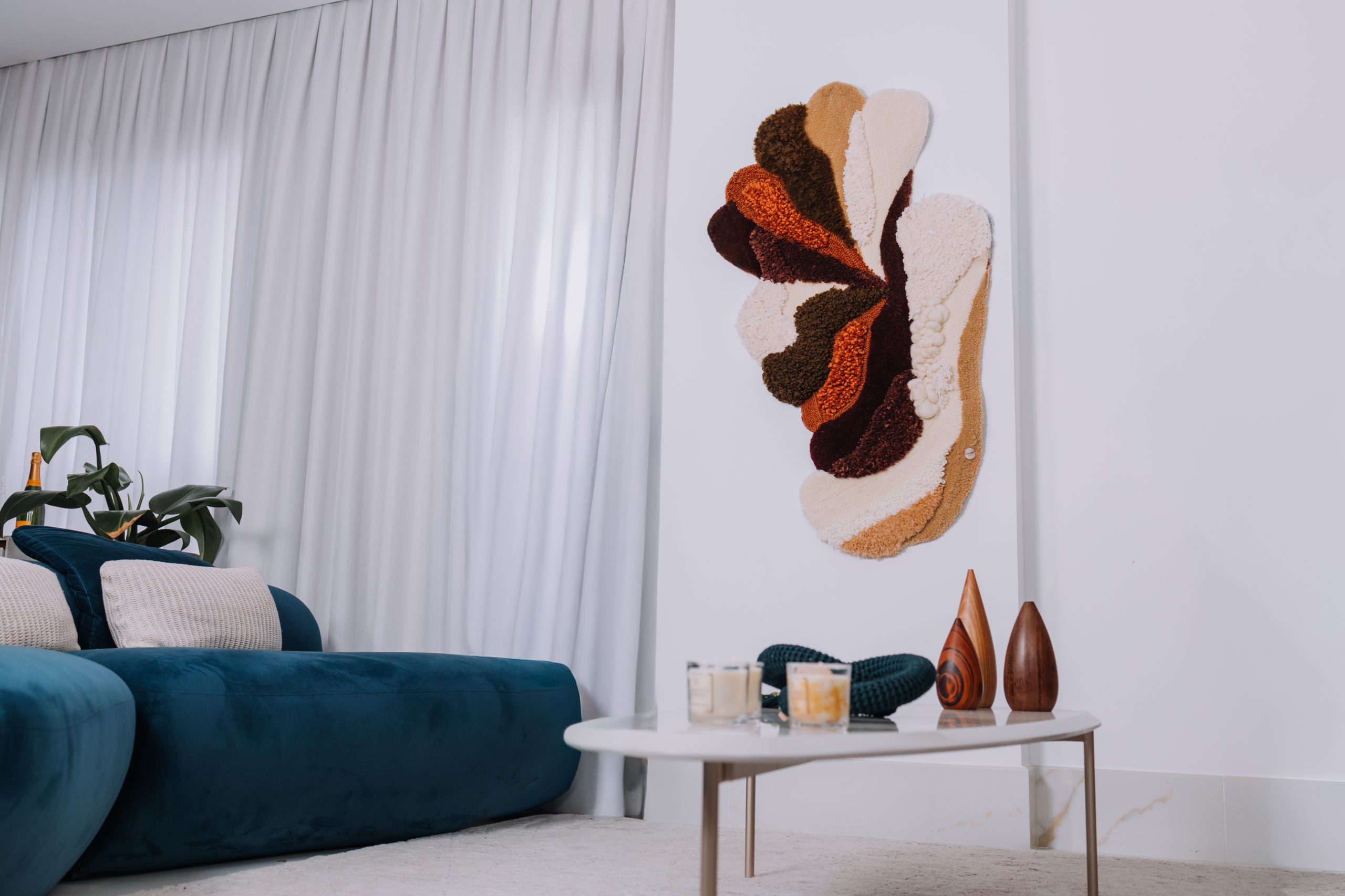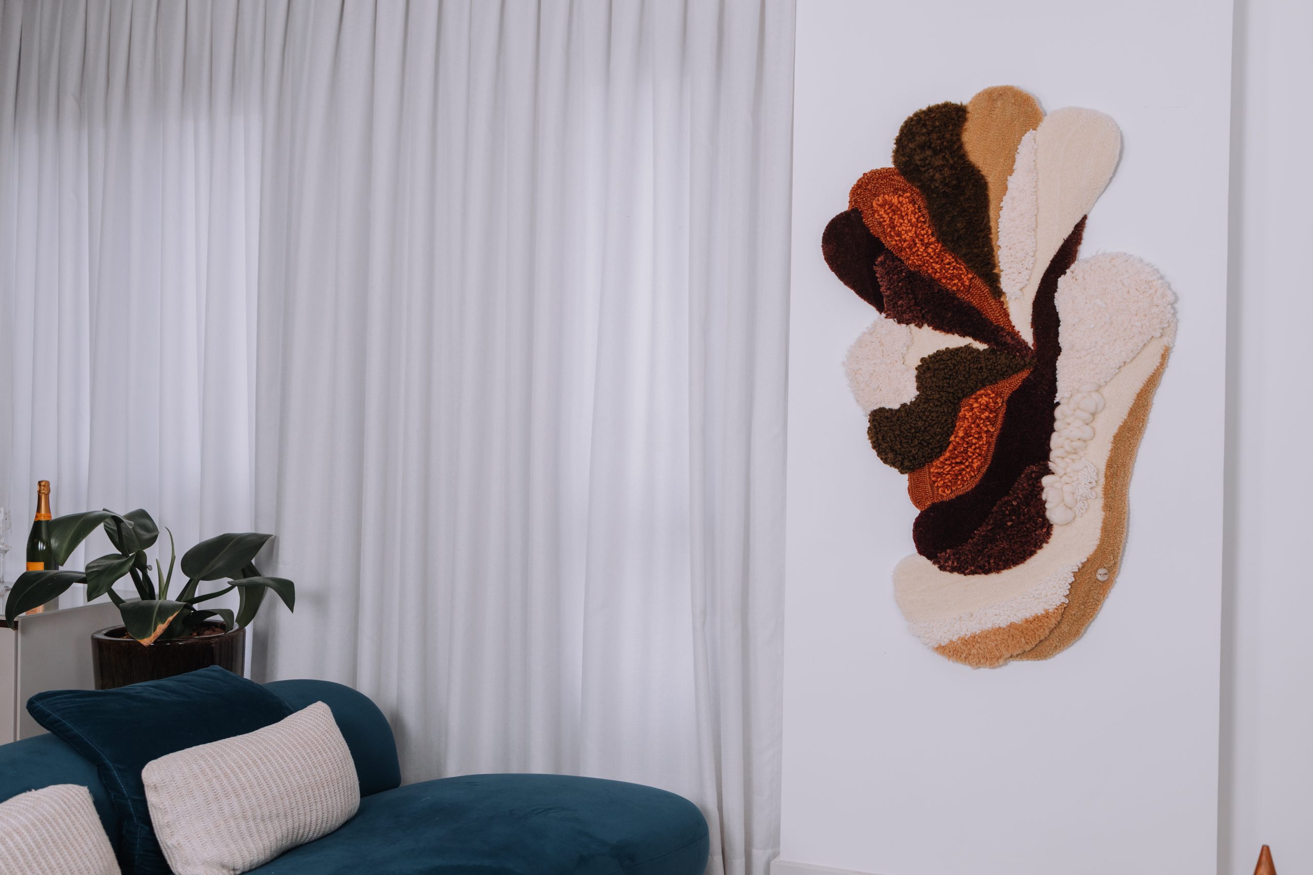 Inspirada nas formas, cores e texturas da natureza, a Flor é uma tapeçaria que transforma matéria-prima em poesia visual. Criada através das técnicas de tufting e latch hook, a obra combina lãs naturais de carneiro e fibras sintéticas em tons off white, beges e terrosos, resultando em uma composição que transmite conforto, organicidade e calor.