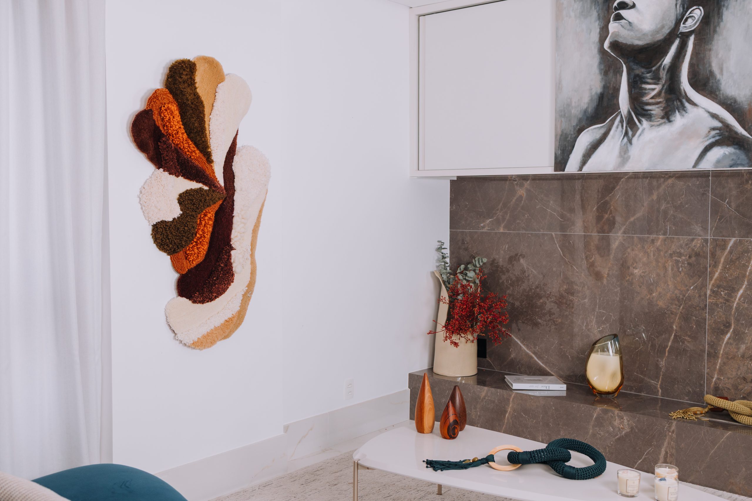 Com dimensões de 1,35 x 0,81 m, a Flor é uma tapeçaria densa e expressiva, ideal para quem busca uma obra autoral que una textura, forma e sensações.