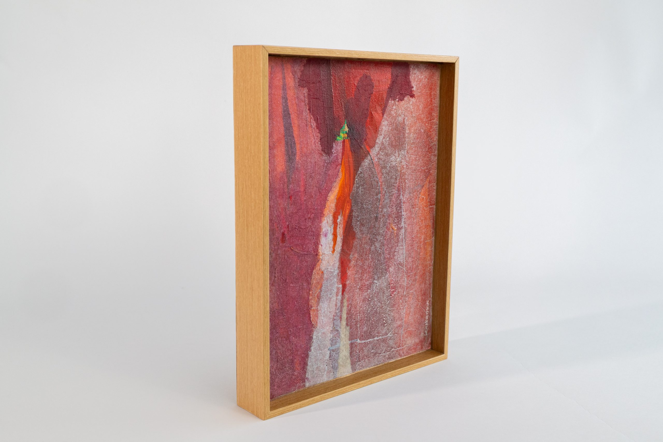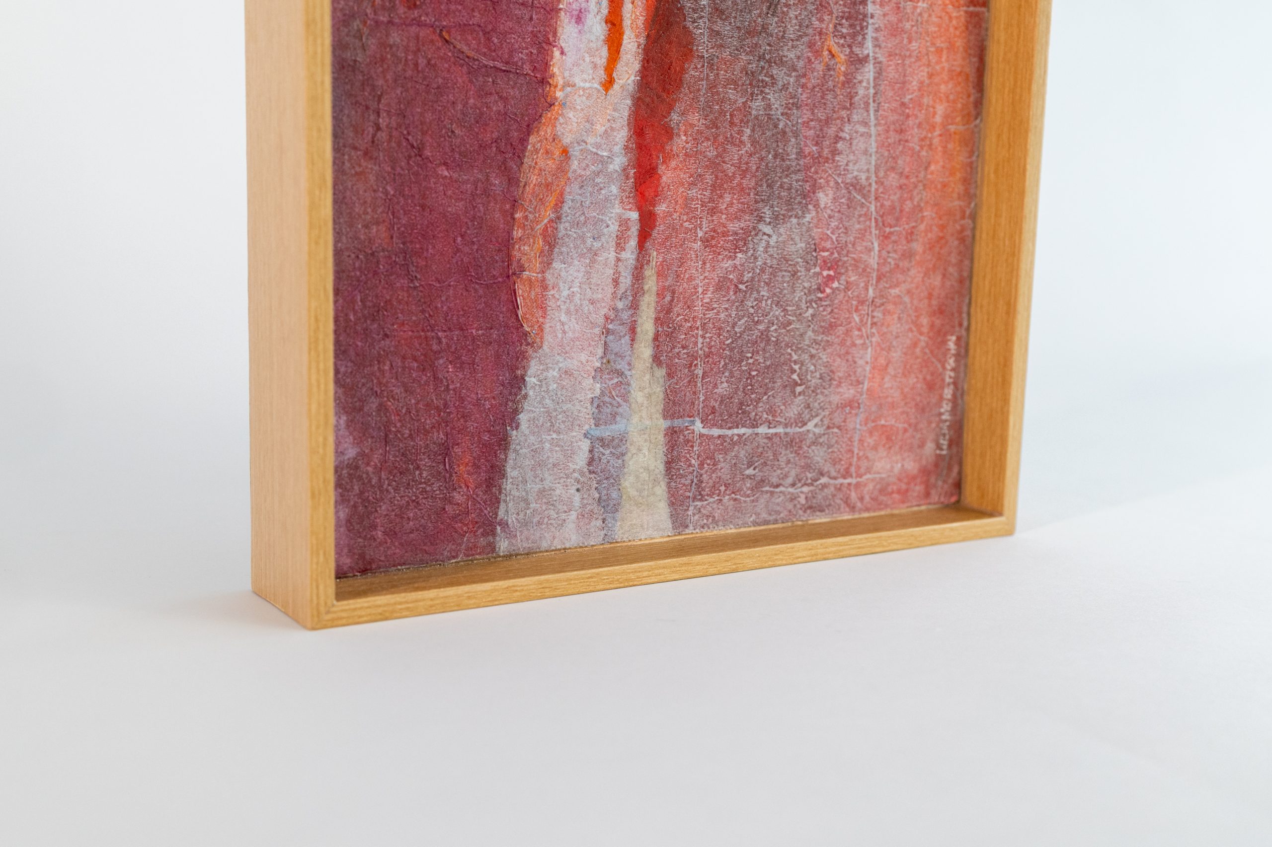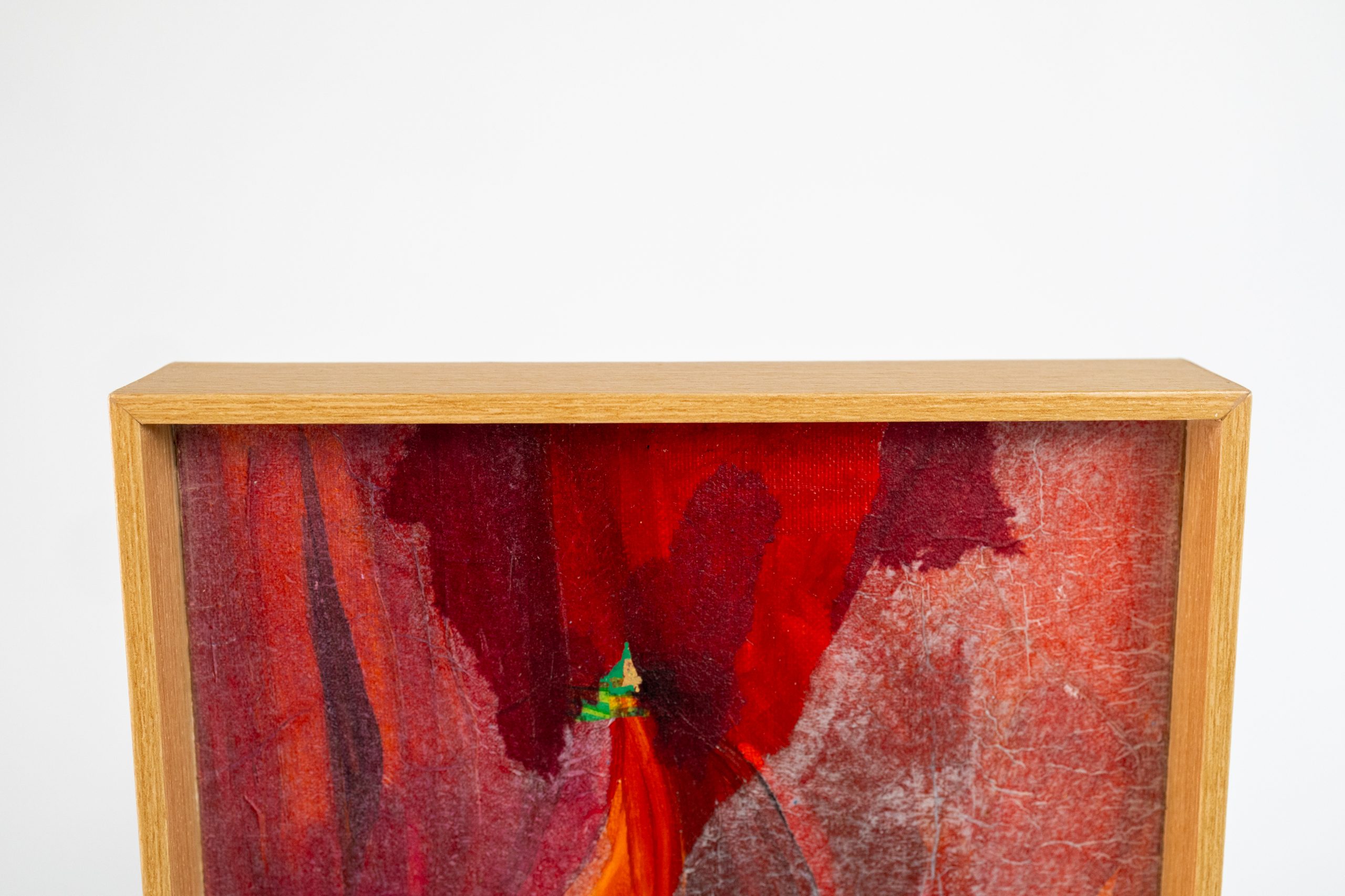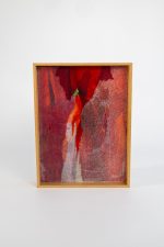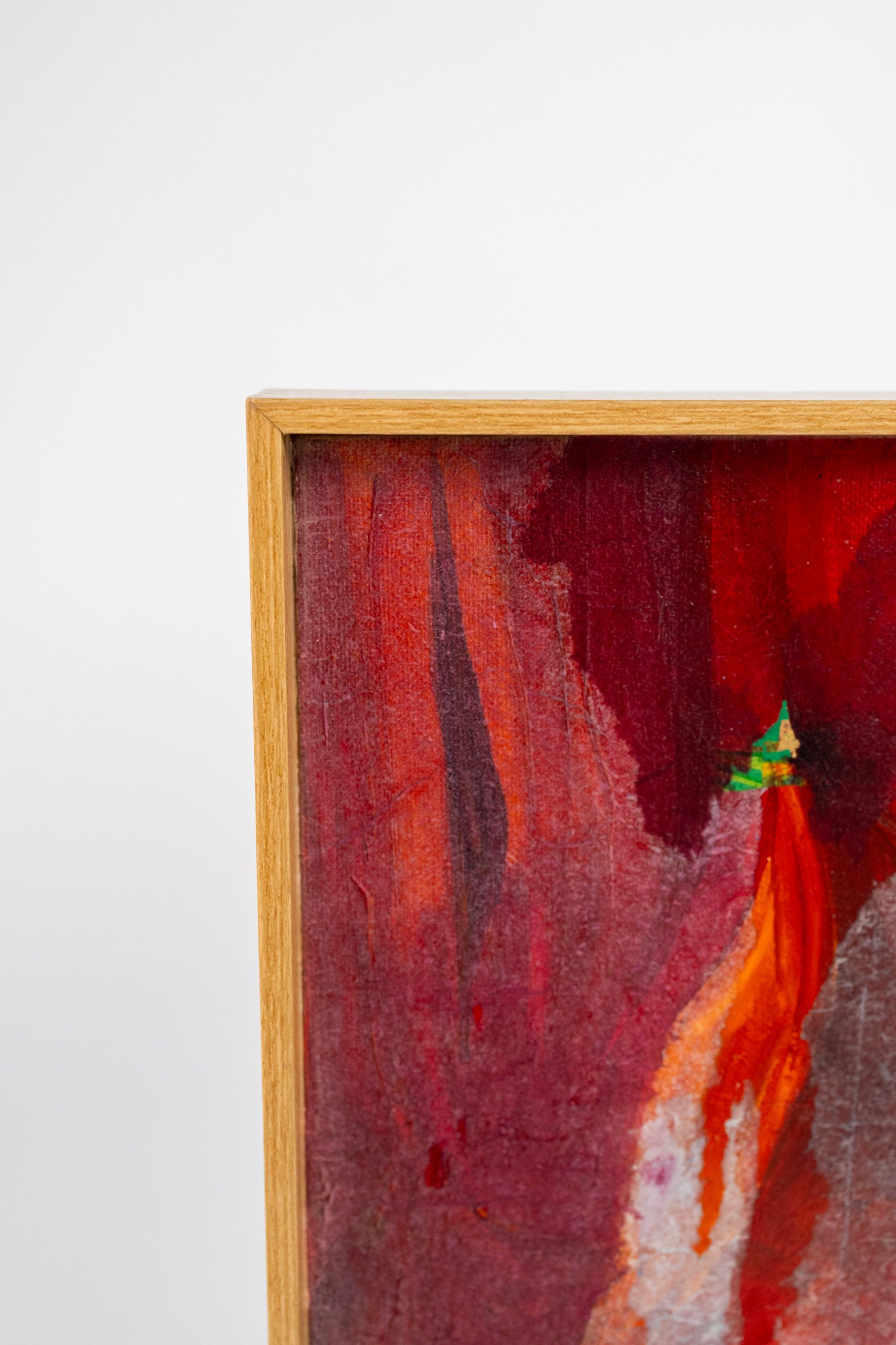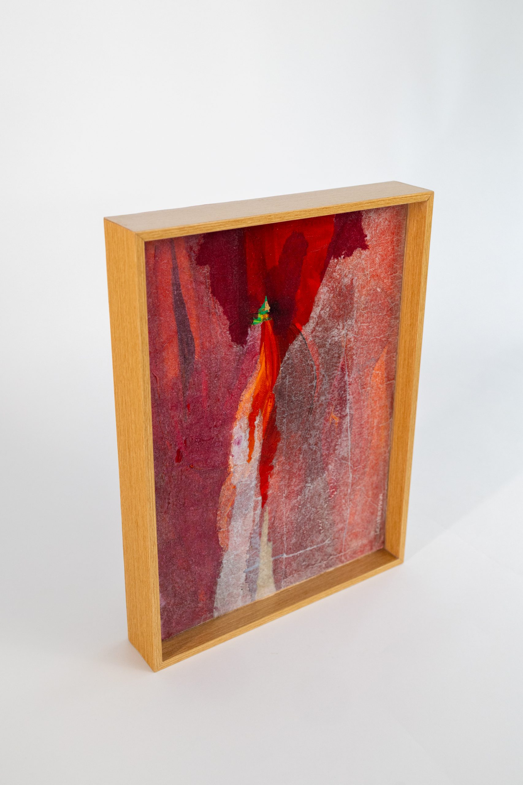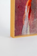 Utilizando sobreposição de papéis e tinta acrílica, constrói camadas que evocam fragmentos da inconsciência, revelados em texturas, transparências e tons de vermelho intenso.