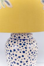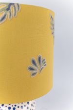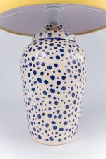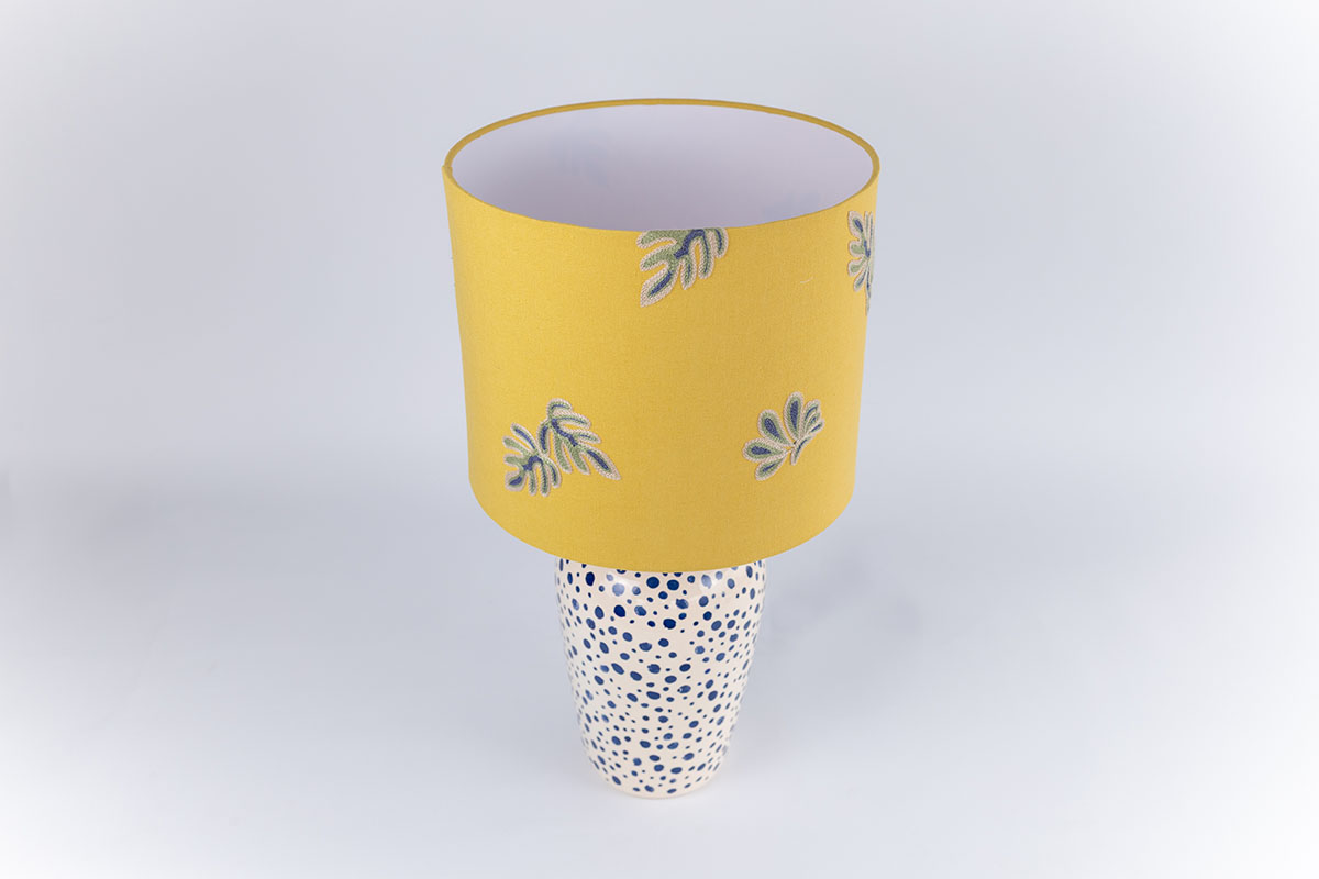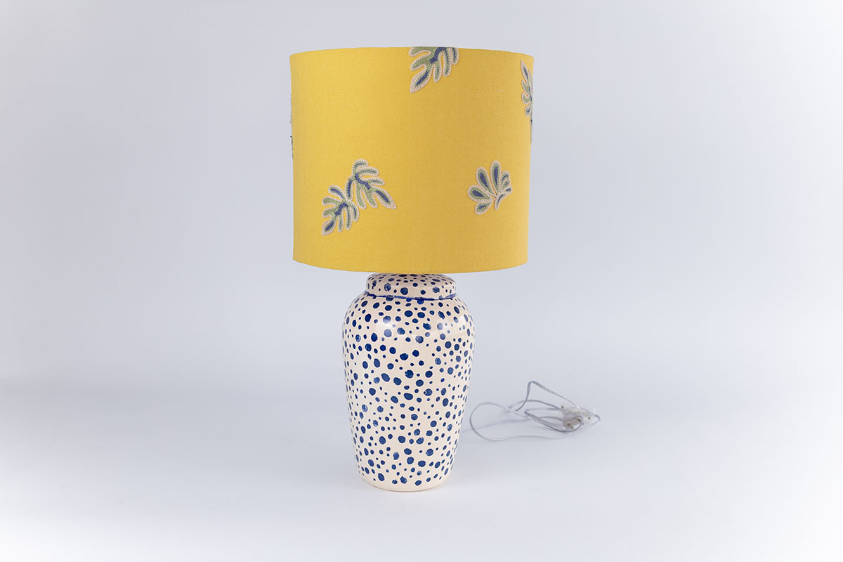 Delicado, expressivo e cheio de significados, o Abajur Dots é resultado de um processo criativo profundamente intuitivo, que transforma memórias e instantes em arte. Com base em cerâmica branca e pontos em azul aplicados manualmente, a peça ganha textura e volume sutis, convidando o toque e o olhar atento. A cúpula em linho misto, em tom amarelo suave, é adornada com folhas em azul, uma composição que evoca leveza, conexão com a natureza e a beleza dos ciclos da vida.
