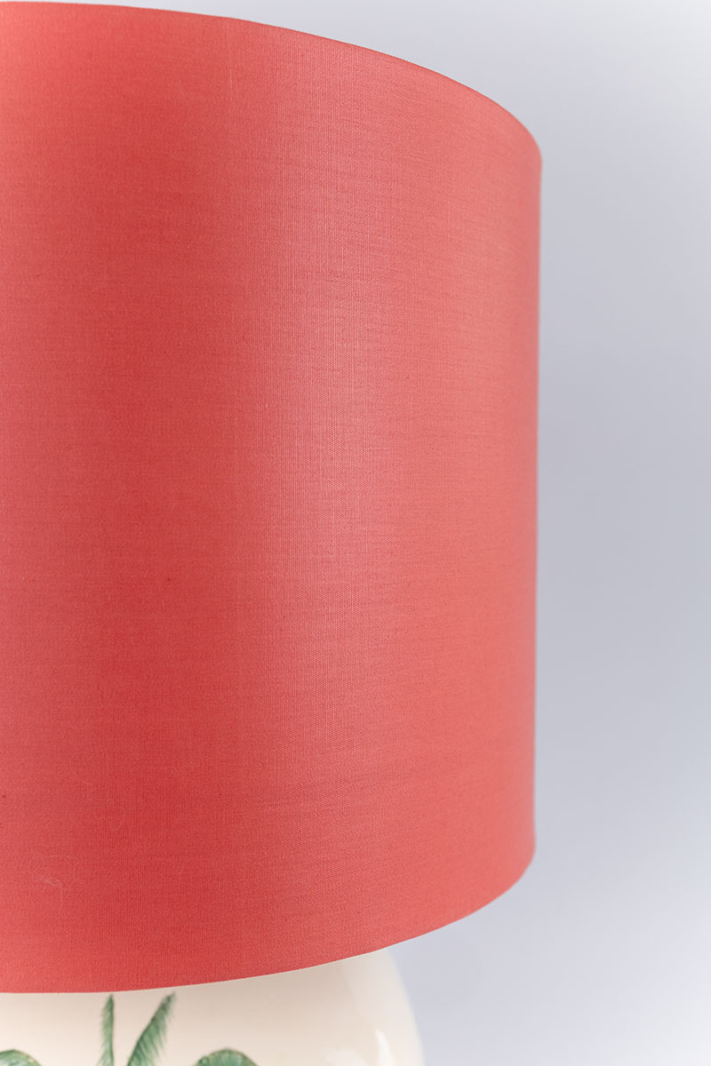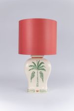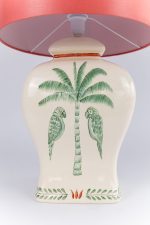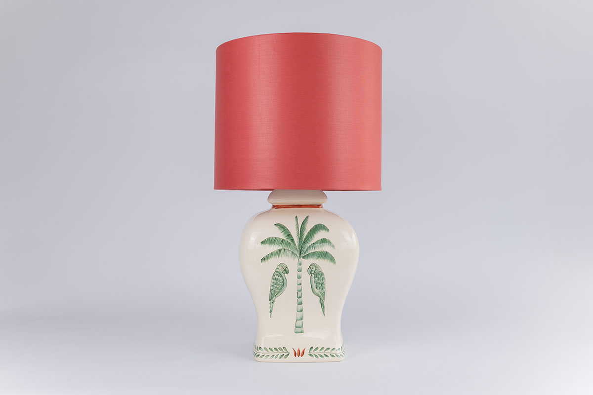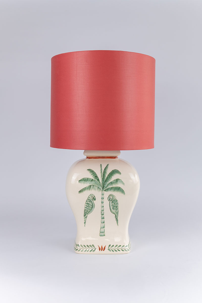 Inspirado na imponência silenciosa da natureza, o Abajur Imperial une forma e significado em uma peça inteiramente feita à mão. A base em cerâmica exibe palmeiras e pássaros delicadamente pintados, em tons de verde e coral sobre fundo branco, evocando a exuberância tropical com leveza e sofisticação. Cada detalhe foi cuidadosamente construído com pinceladas curtas e precisas, em camadas que revelam o domínio da técnica artesanal.