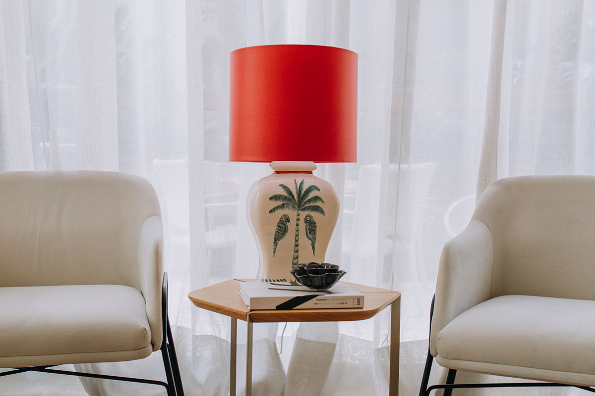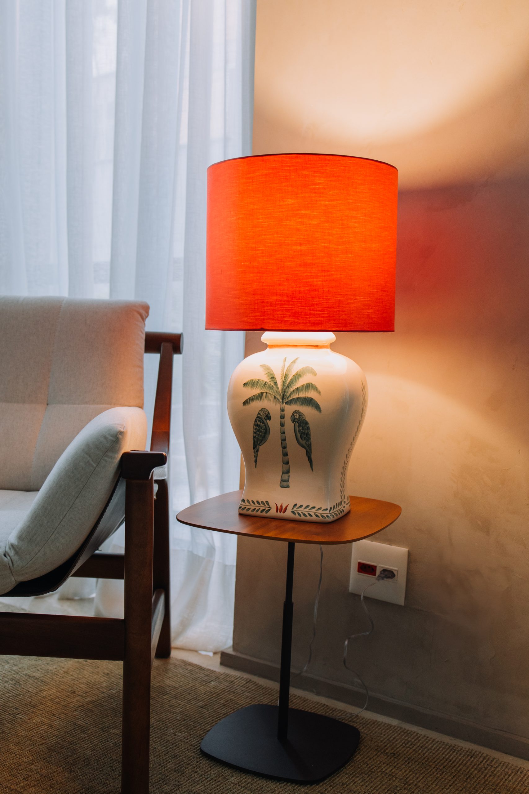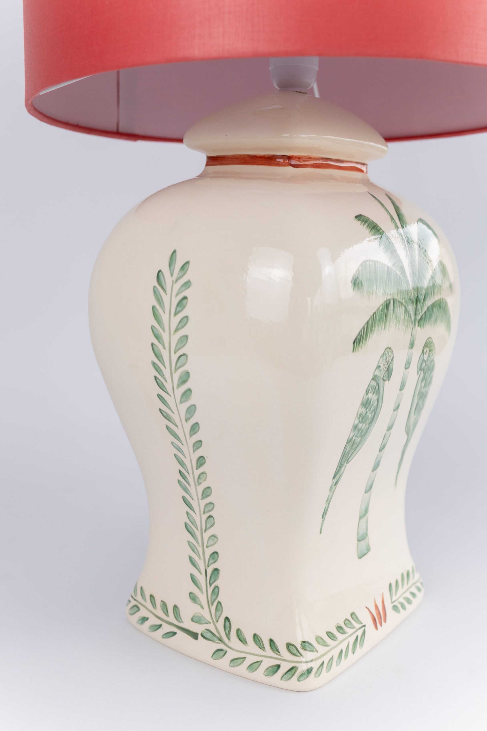 Inspirado na imponência silenciosa da natureza, o Abajur Imperial une forma e significado em uma peça inteiramente feita à mão. A base em cerâmica exibe palmeiras e pássaros delicadamente pintados, em tons de verde e coral sobre fundo branco, evocando a exuberância tropical com leveza e sofisticação. Cada detalhe foi cuidadosamente construído com pinceladas curtas e precisas, em camadas que revelam o domínio da técnica artesanal.