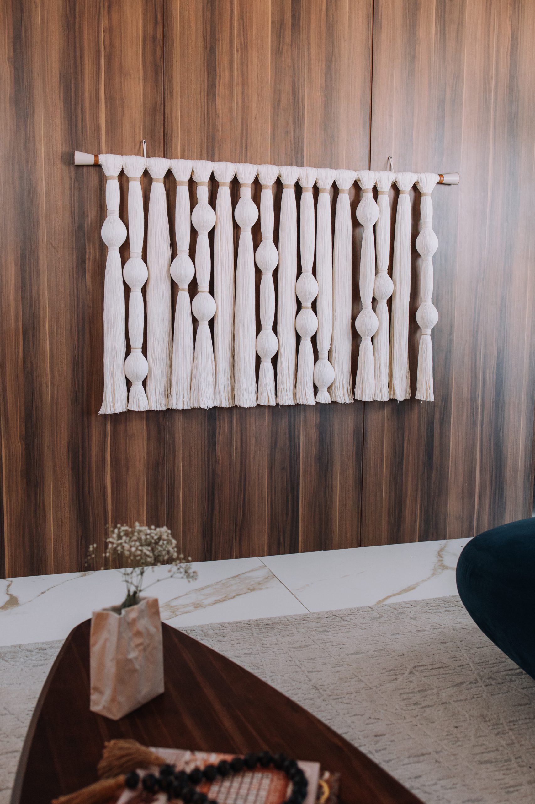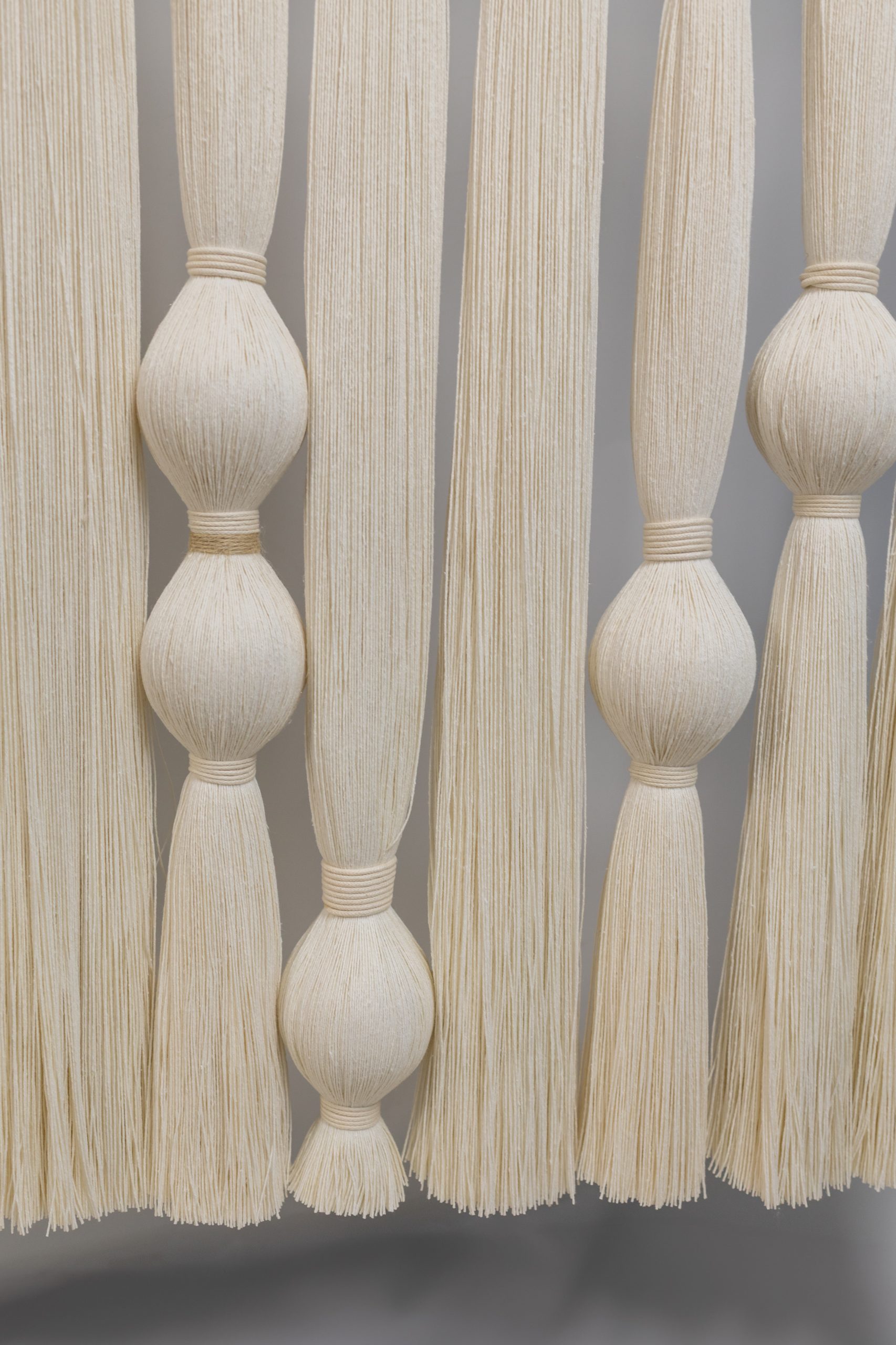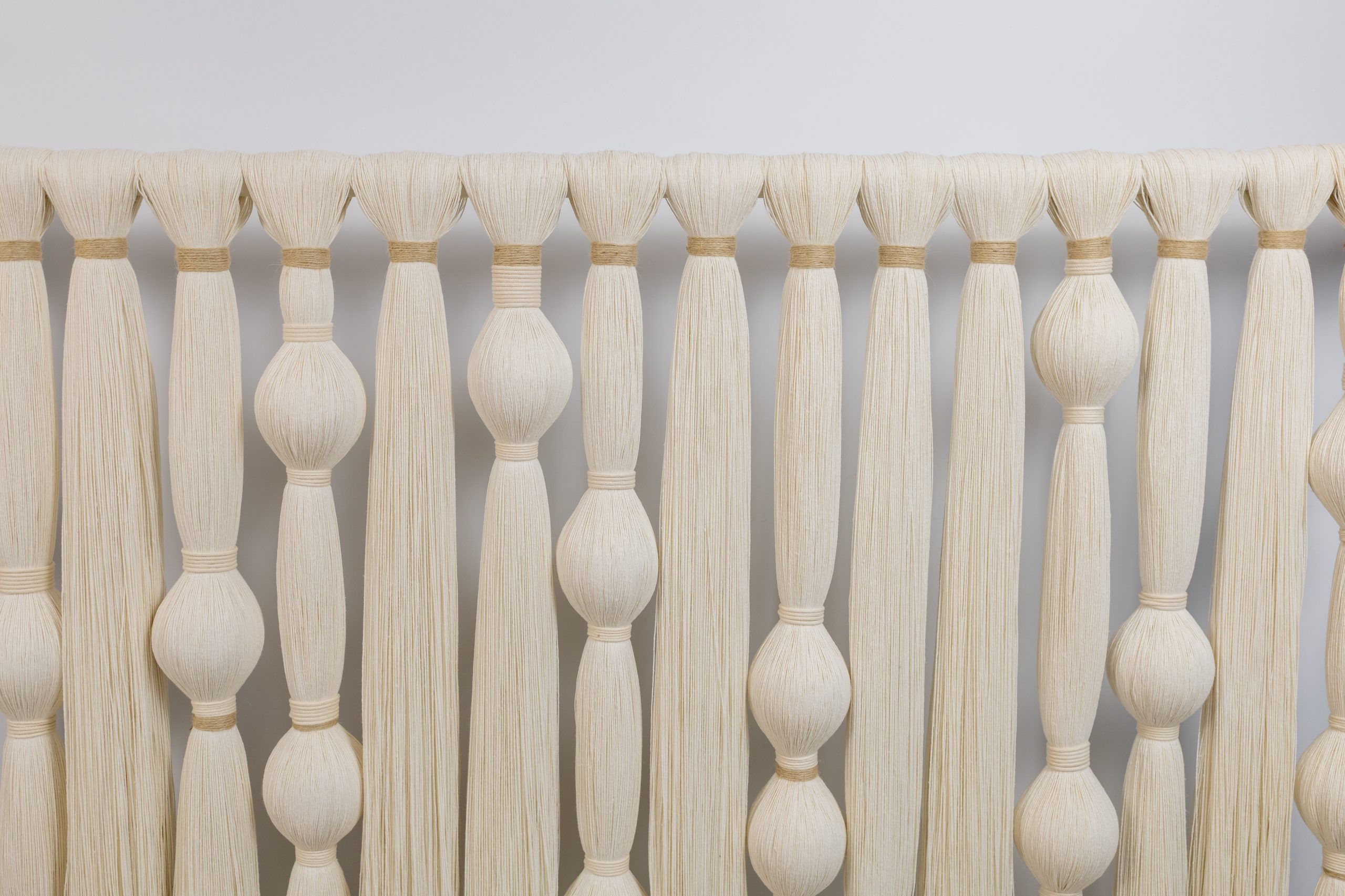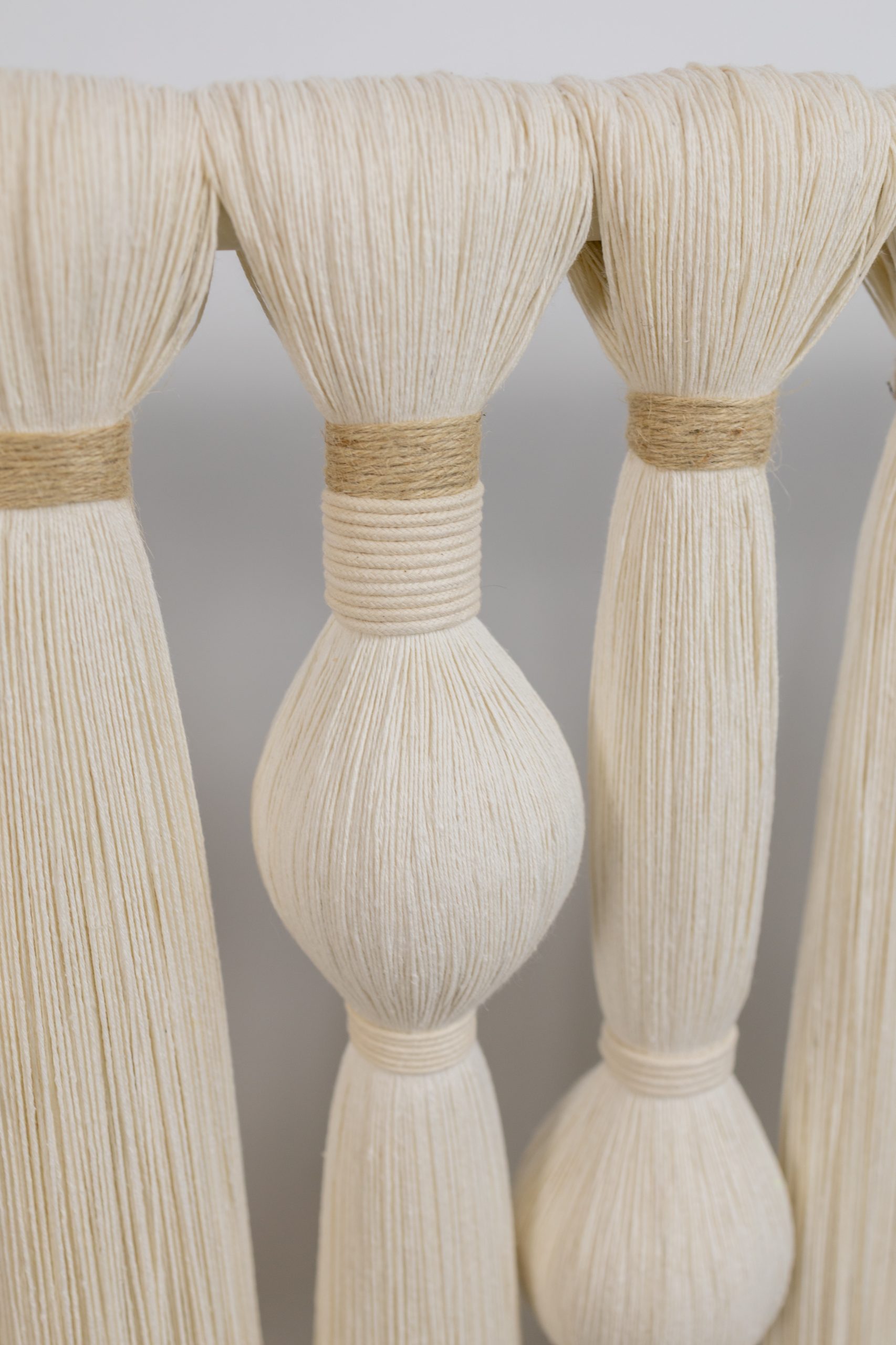O adorno de parede Onda é uma obra que une arte e decoração em perfeita harmonia. Confeccionado em algodão cru, seu desenho em cordões alongados e volumes esféricos cria um efeito visual marcante, que transforma qualquer parede em um ponto de destaque.