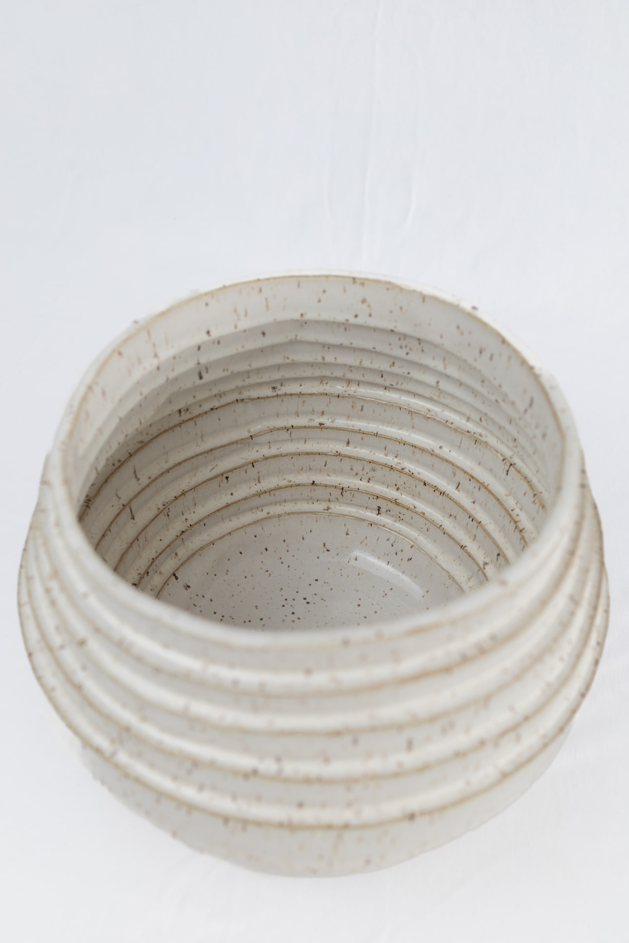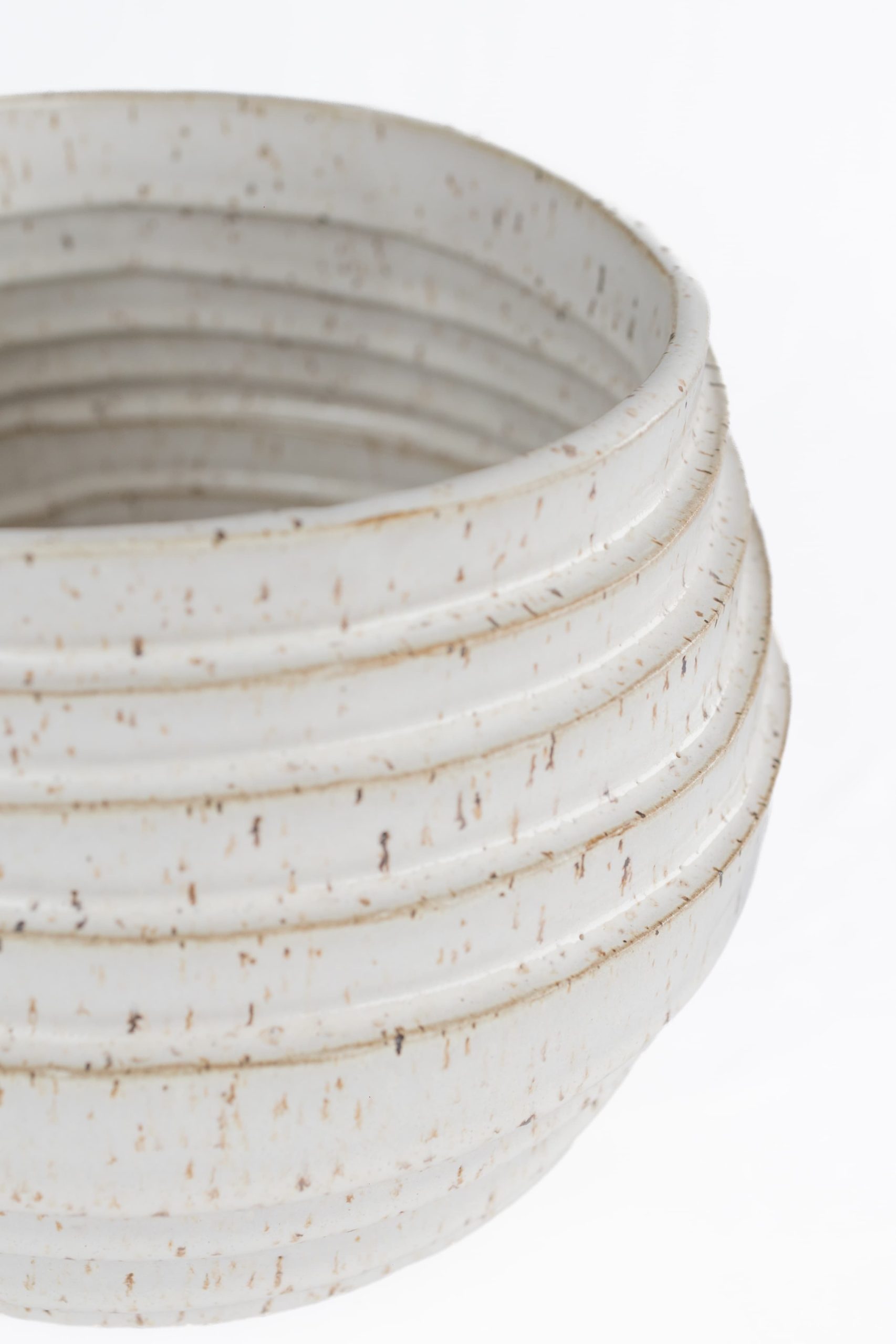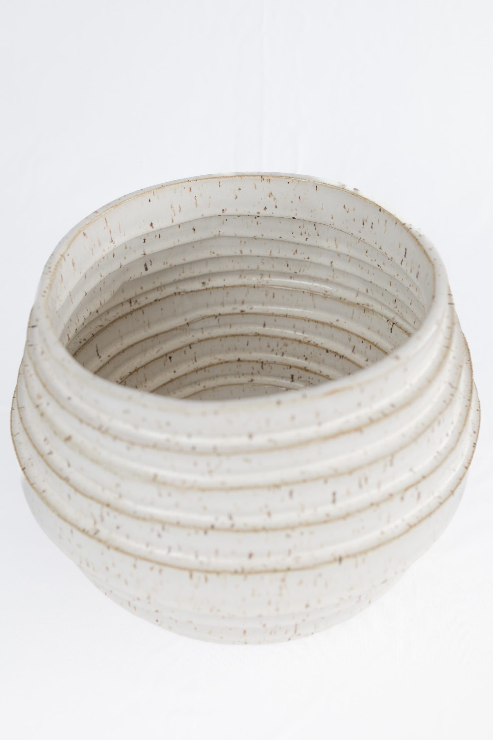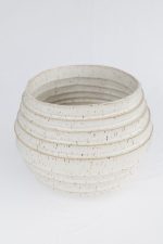 Utilizando a técnica de placa e construção em tiras, este vaso é cuidadosamente formado por colagem de tiras de argila, criando uma estrutura orgânica e livre.