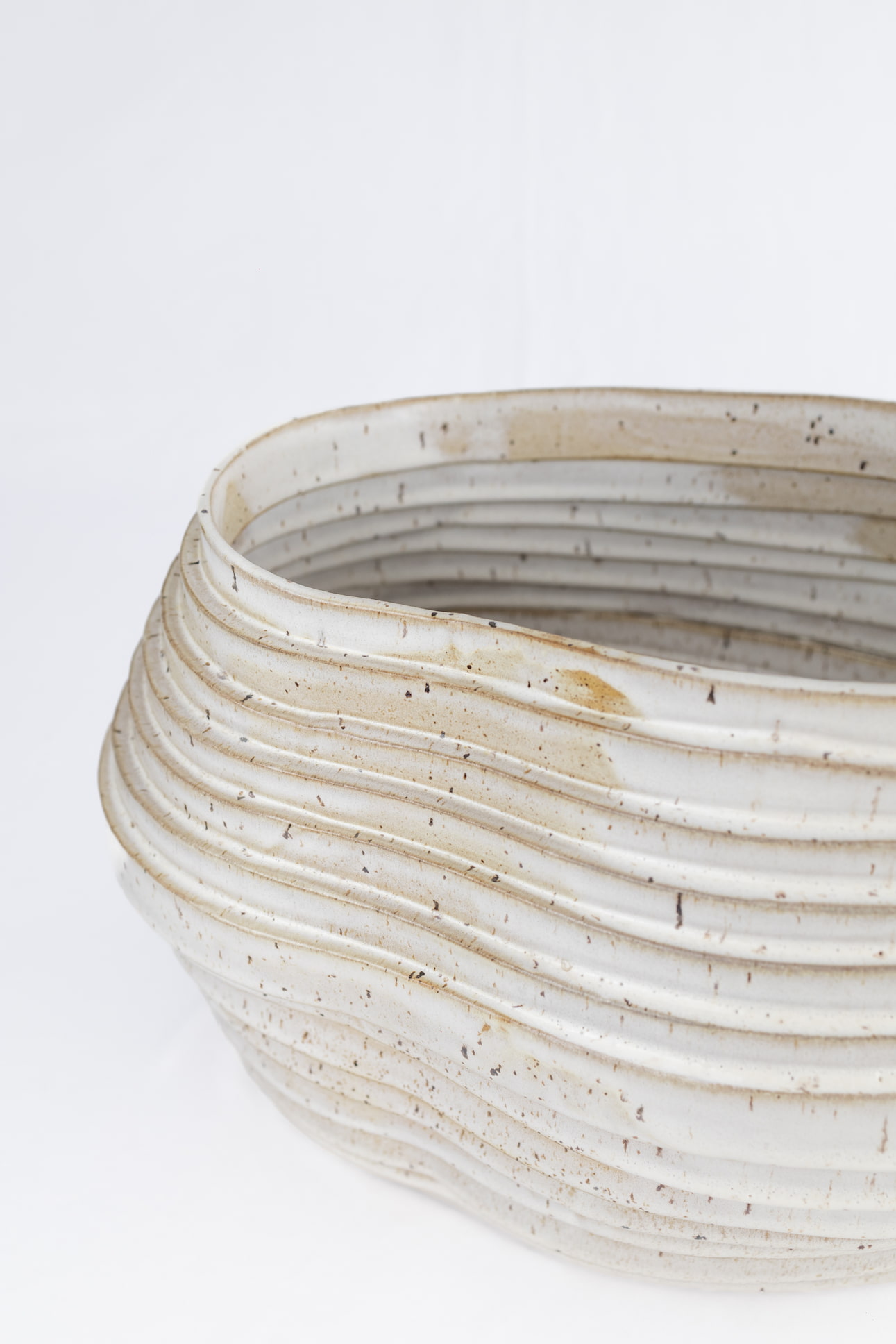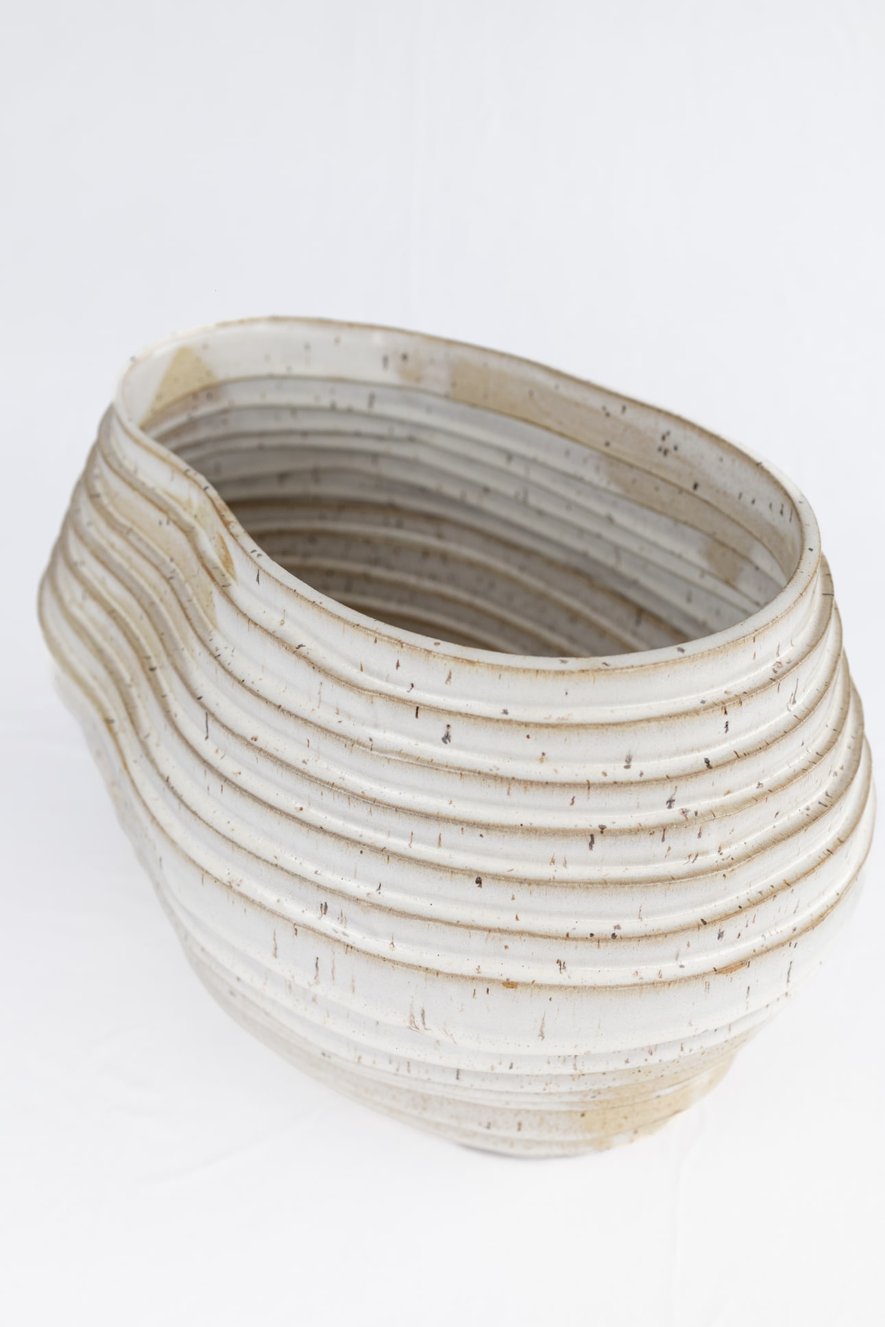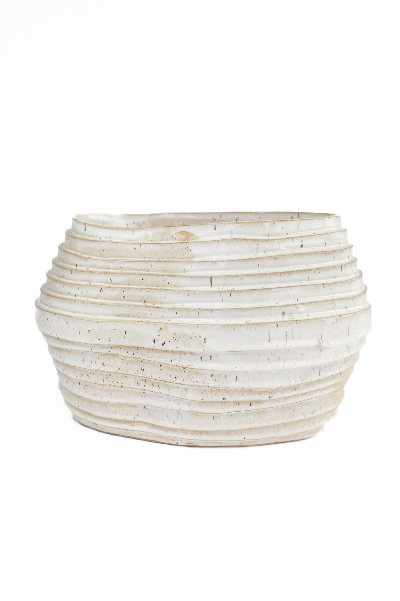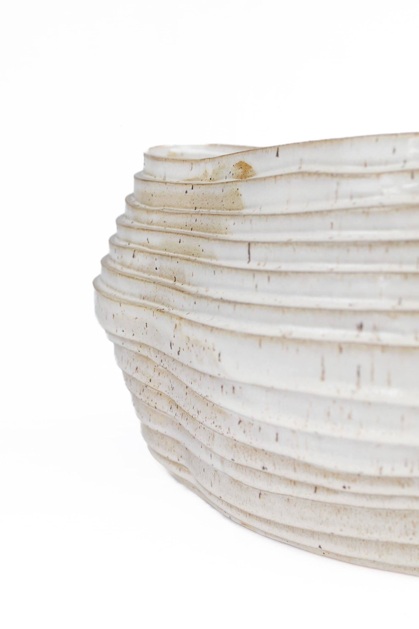 Utilizando a técnica de placa e construção em tiras, este vaso é cuidadosamente formado por  colagem de tiras de argila, criando uma estrutura orgânica e livre.