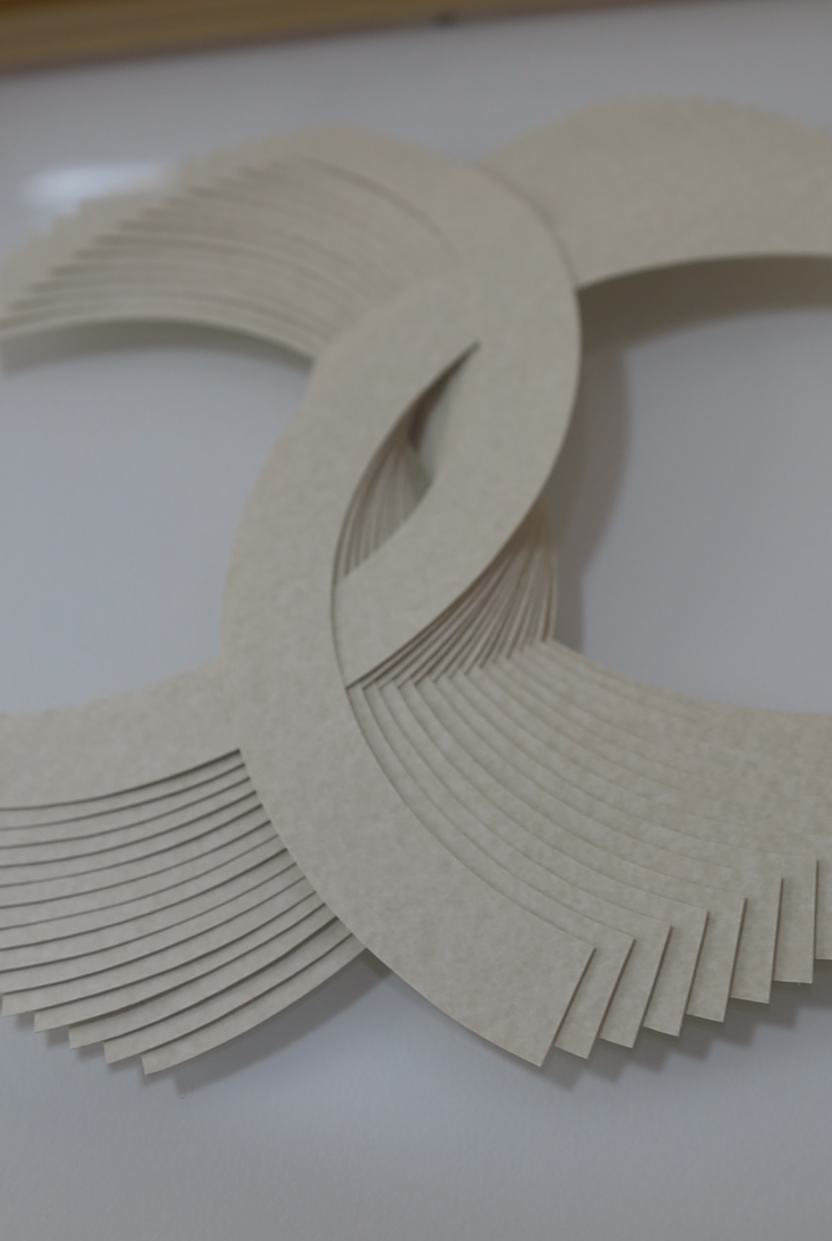 “Arcs in Shape” é uma criação de Flávia Mesquita que une delicadeza e significado, transformando simples lâminas de papel “Keaykolor” na cor Parchment Natural (marfim) em uma obra que encanta pelo design e pela profundidade. Os arcos, habilmente entrelaçados em semi-círculos e dispostos de forma espelhada, criam uma composição que parece fluir em movimento, como se cada curva dialogasse com a próxima em uma sinfonia de formas e espaços.