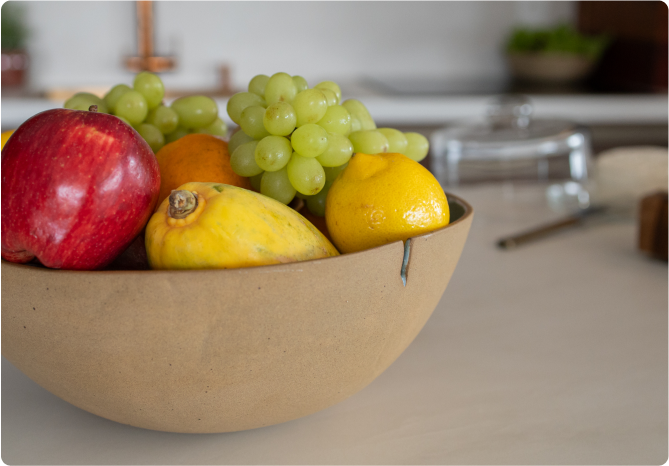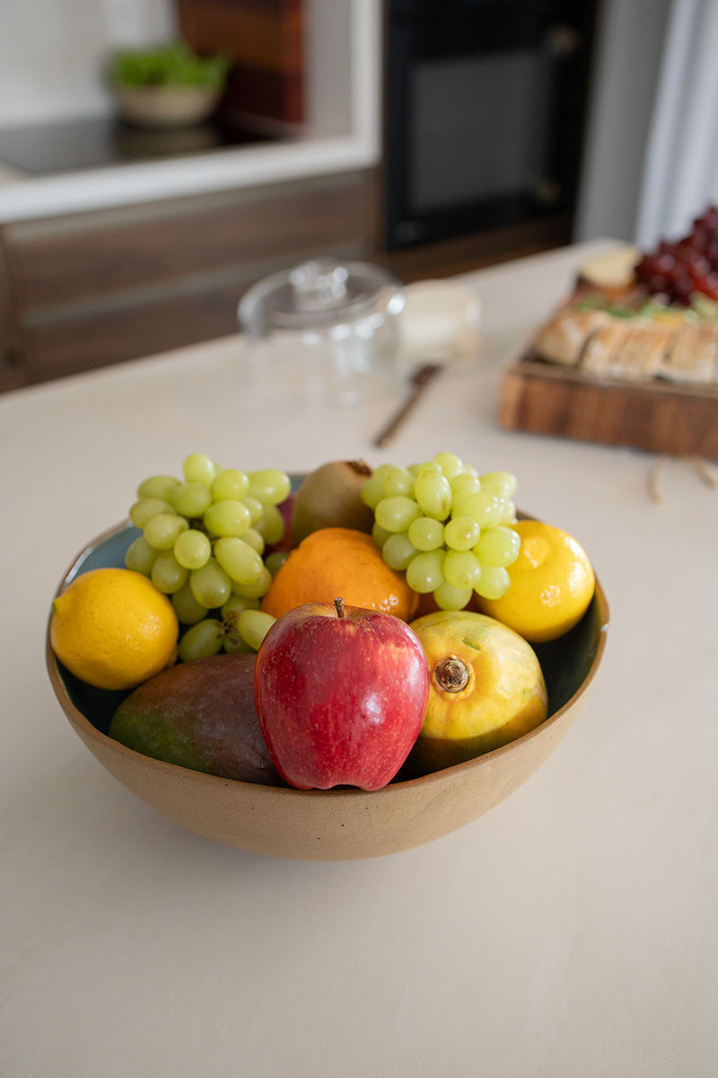 Feita com argila reciclada, esta fruteira não só é uma peça bonita, mas também uma escolhe sustentável. O uso de argila reciclada reduz o desperdício e promove a reutilização de materiais, refletindo o compromisso da artista com a sustentabilidade e o respeito ao meio ambiente.