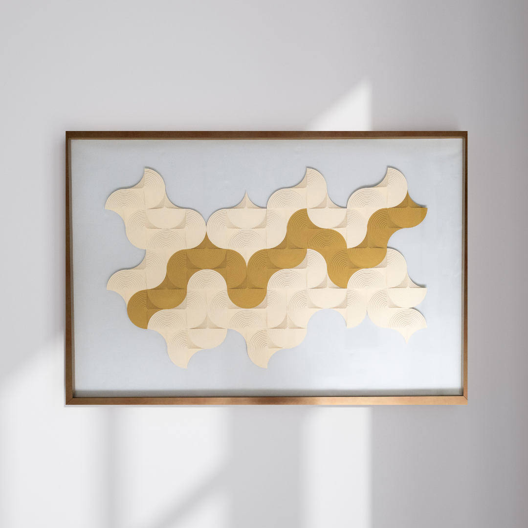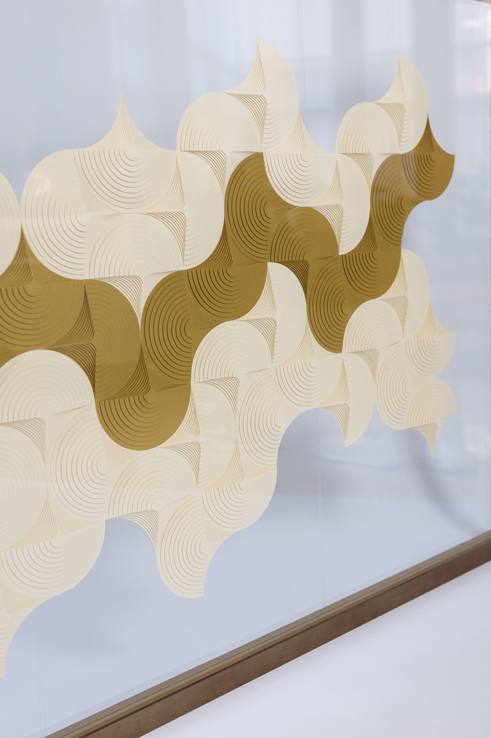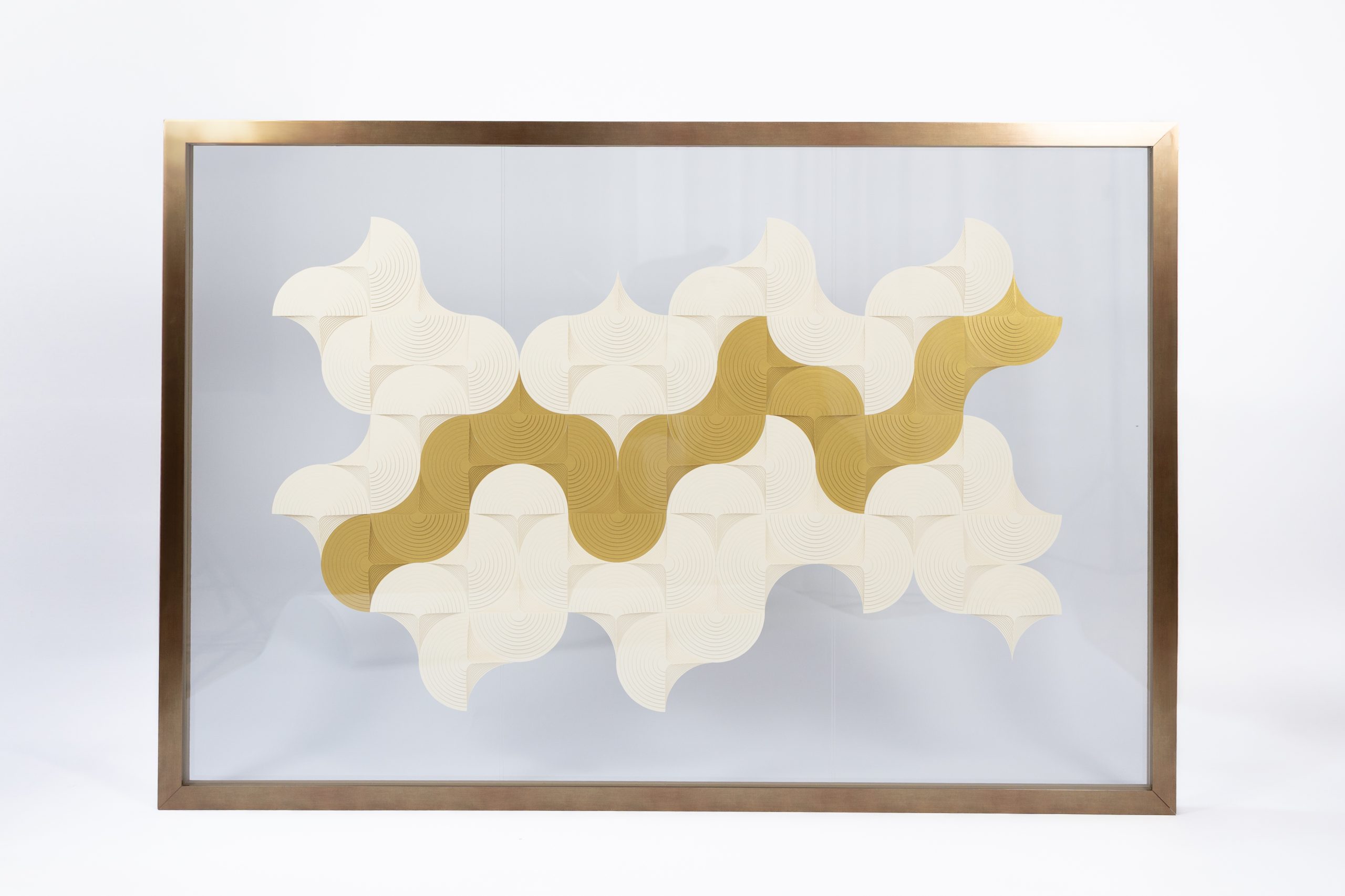 Em marfim e dourado, 52 formas se encontram, contíguas, como passos silenciosos em direção ao centro. A obra evoca o caminho individual que cada um percorre — ainda que inseridos em contextos distintos, seguimos uma trilha única, íntima, que pulsa no ritmo da nossa essência.