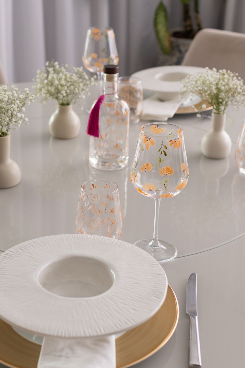 Inspirada na leveza das pétalas e na fluidez das folhagens, a Coleção Jasmine traz um conjunto de sete peças que transformam o vidro em poesia visual. Cada pincelada em tom bronze é aplicada à mão com liberdade e delicadeza, revelando nuances únicas em cada peça. A transparência do vidro encontra o brilho sutil da tinta, criando um jogo de luz que envolve e encanta.