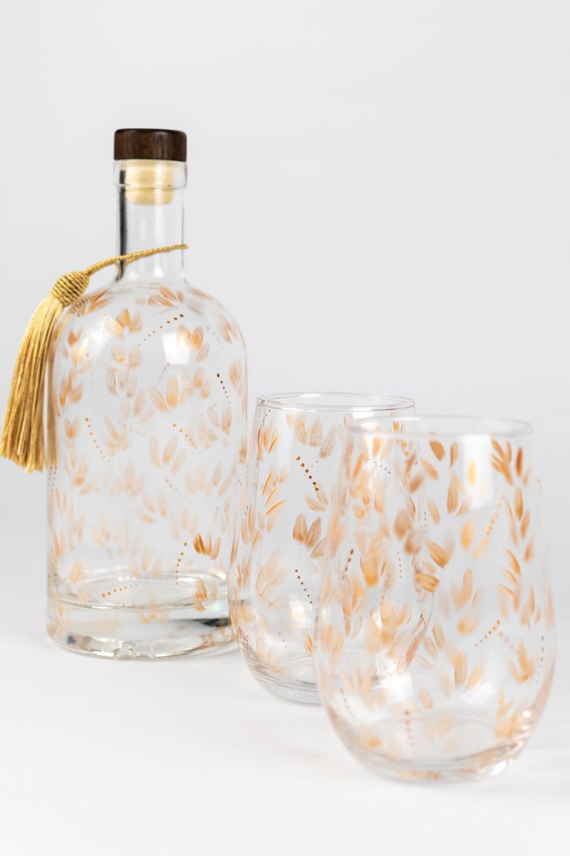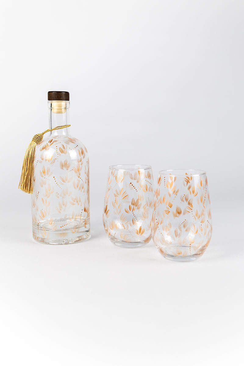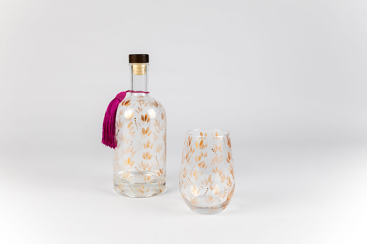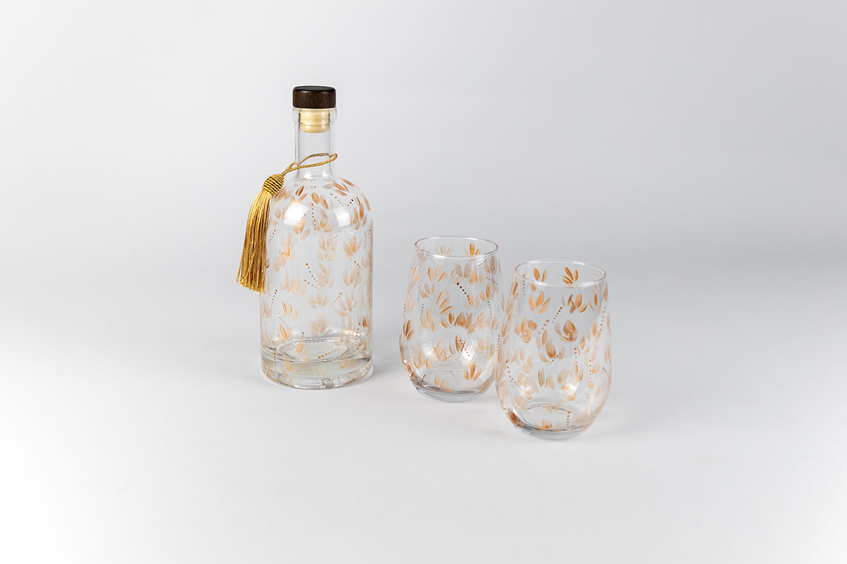 Os copos de silhueta alongada e a garrafa de forma generosa ganham sofisticação através de uma pintura orgânica e sem moldes, o que faz com que cada conjunto seja exclusivo, com variações naturais e harmônicas que evidenciam o gesto artístico de sua criação.