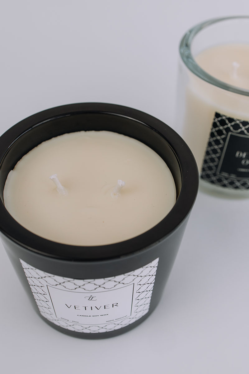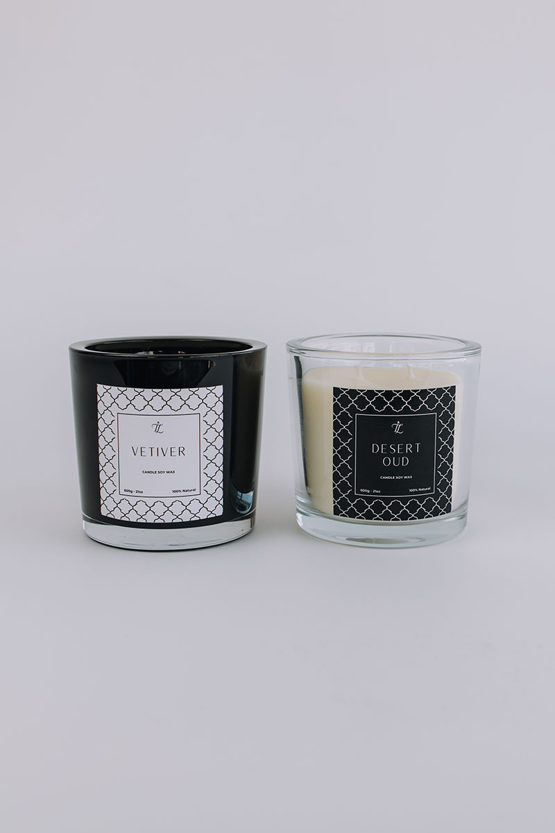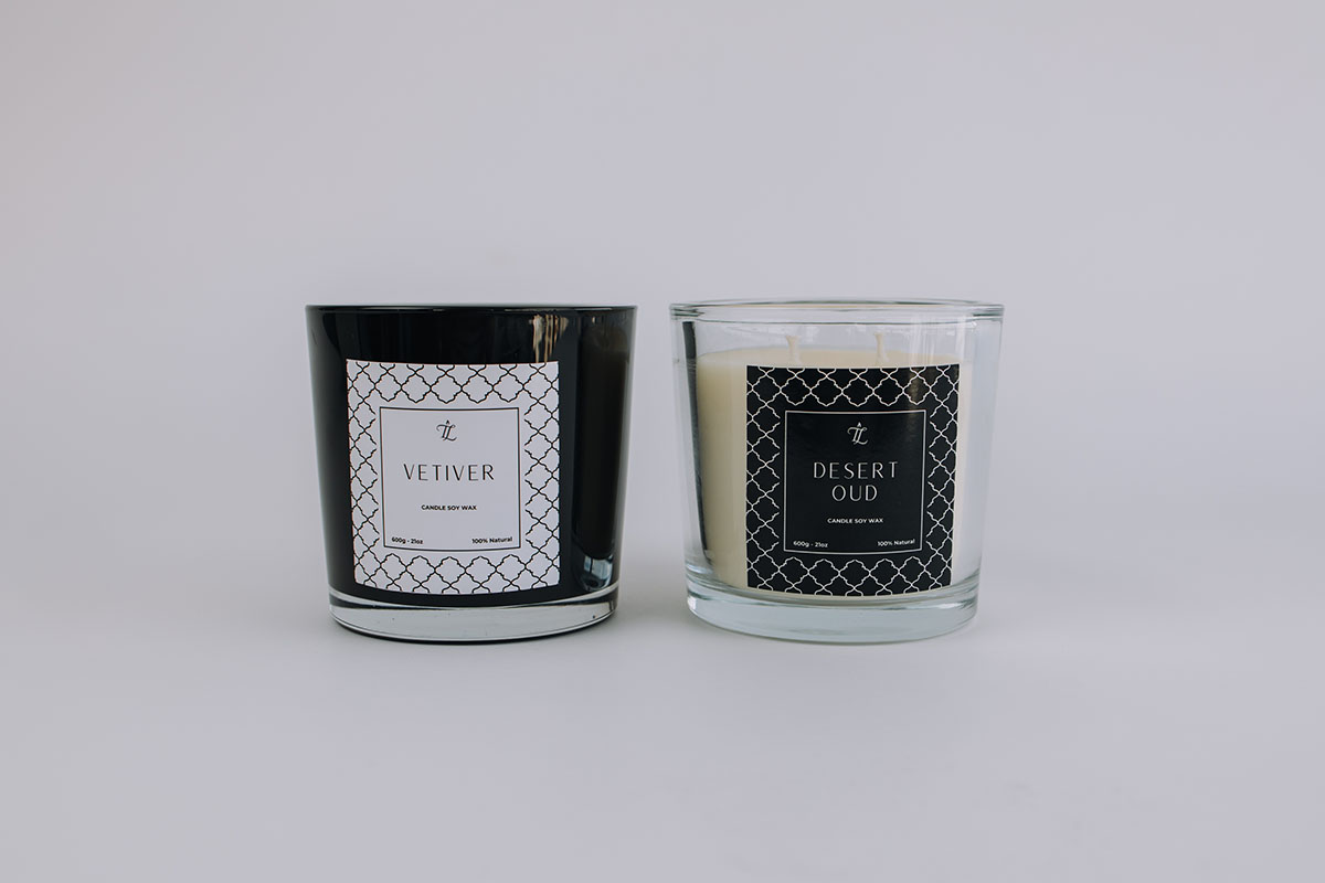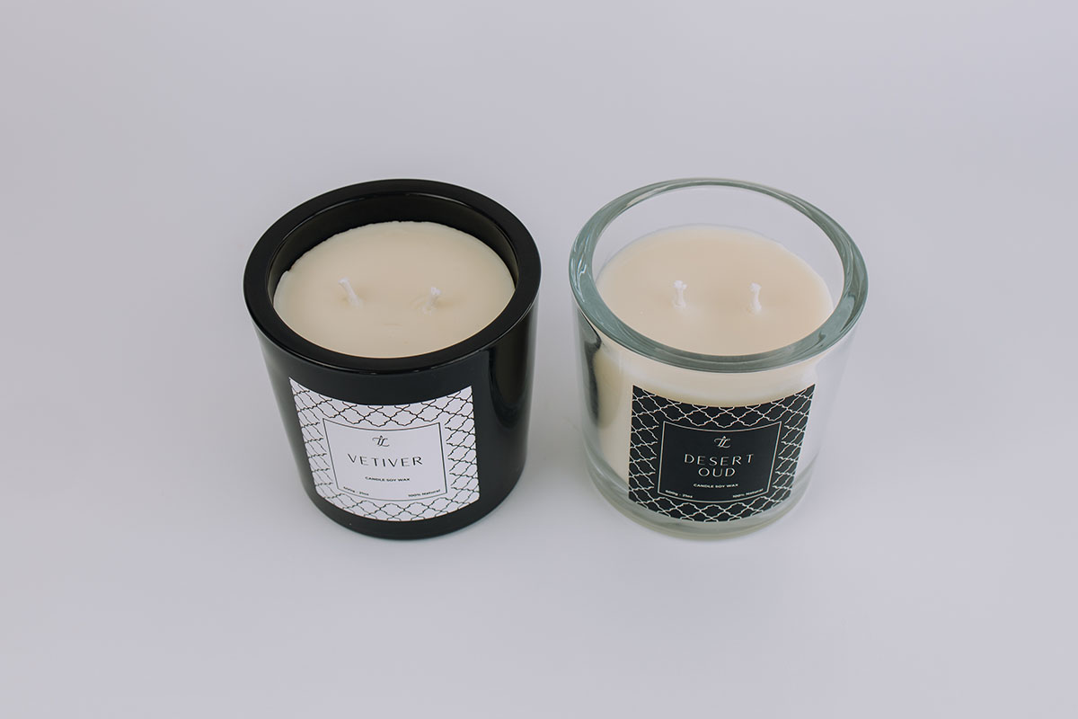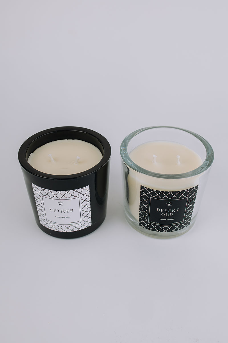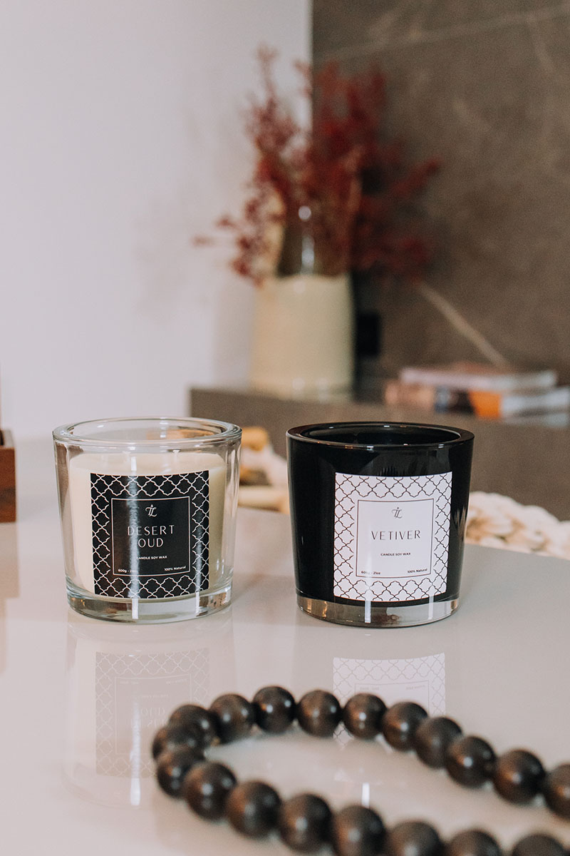 Nur, que significa “luz” em árabe, é uma coleção de velas aromáticas artesanais feita com blend de ceras vegetais naturais e fragrâncias sofisticadas. A vela no vaso de vidro preto traz o aroma suave e terroso do vetiver, enquanto a de vidro transparente exala a intensidade marcante do Desert Oud.