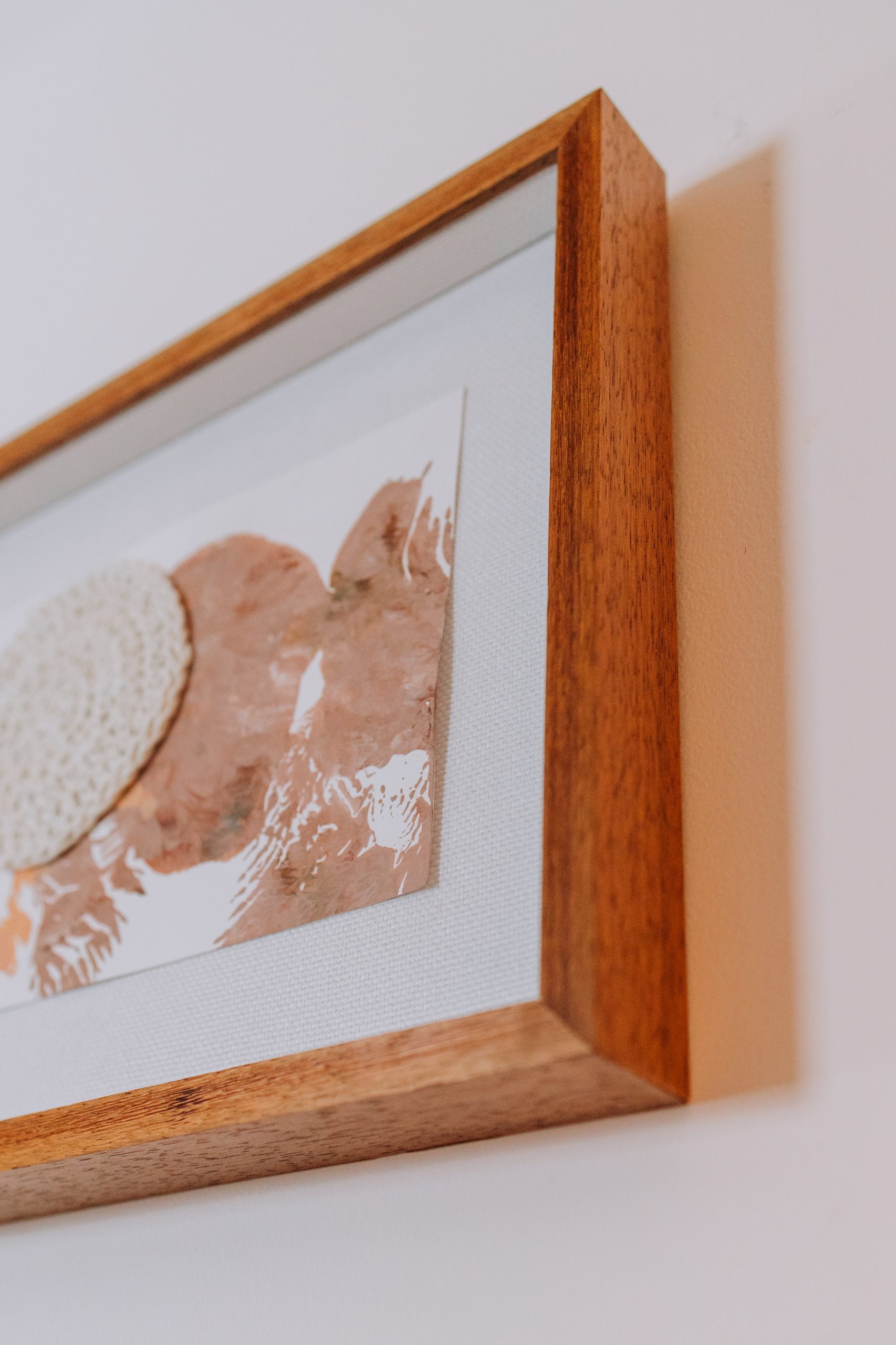 Em contraste harmônico, manchas abstratas pintadas à mão se espalham como sentimentos que não cabem em palavras — intuição pura que escorre no papel e conversa com o silêncio da memória.