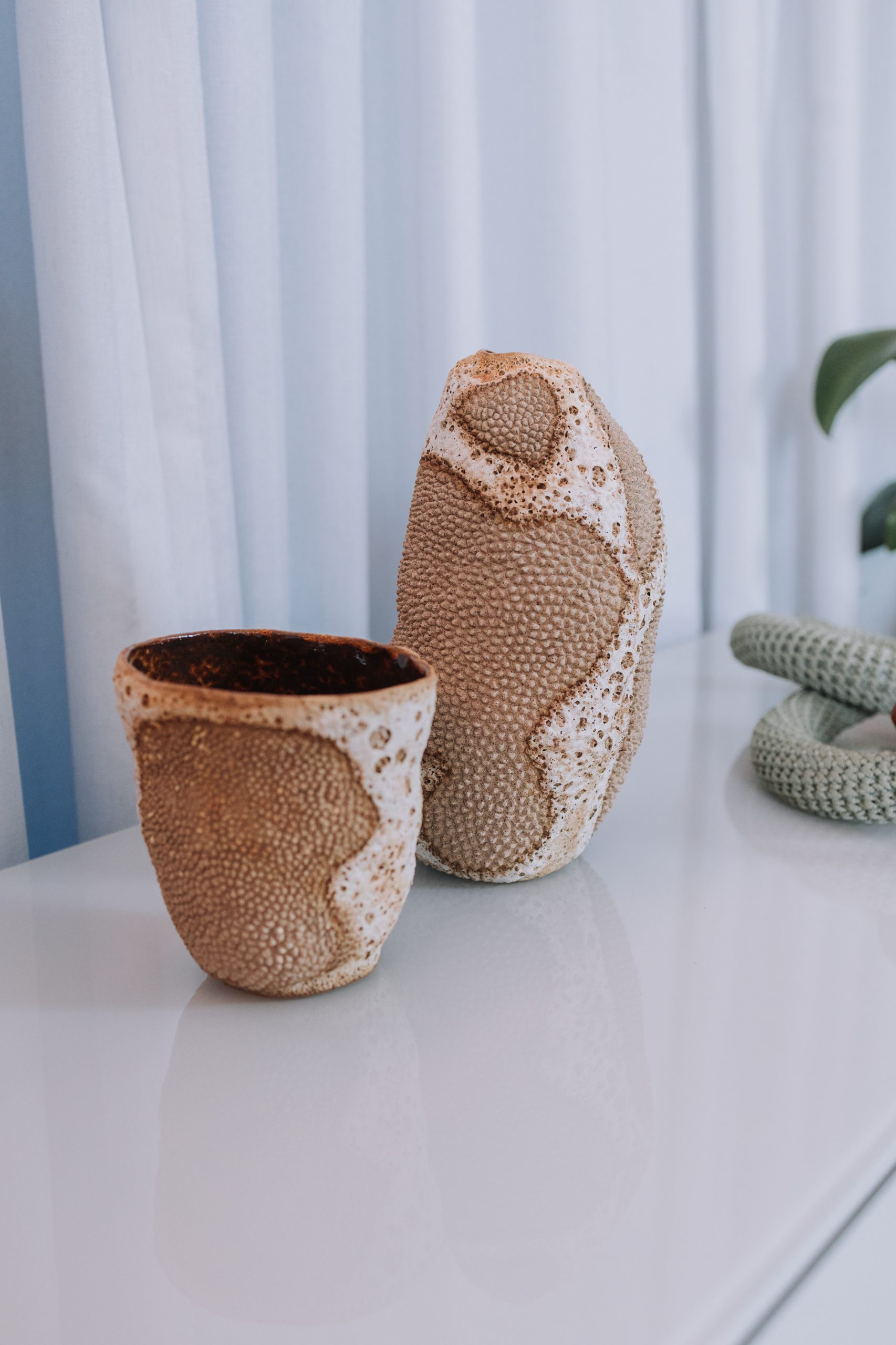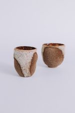 O Conjunto Mini Vasos Jaca Vulcânica é composto por duas peças únicas: um vaso e um bowl. Confeccionados em argila líquida nacional, com modelagem manual e moldes de gesso, recebem esmaltação em alta temperatura com esmalte cerâmico importado. Cada peça apresenta texturas que evocam superfícies vulcânicas, enquanto os tons de areia e nuances terrosas reforçam a harmonia entre natureza e design contemporâneo.