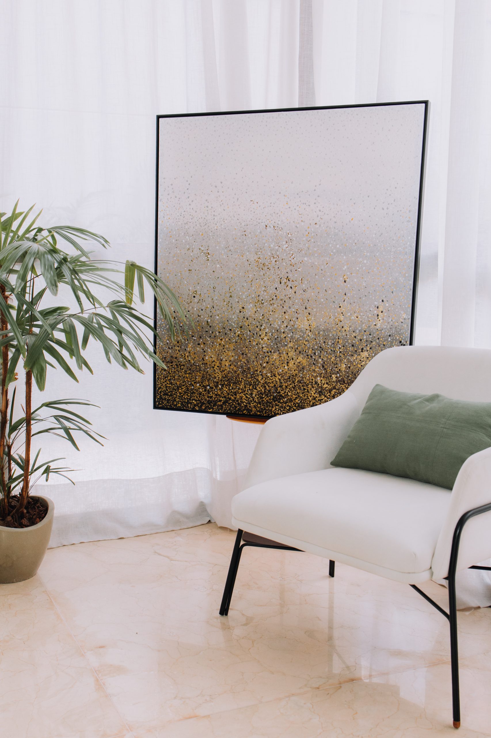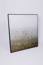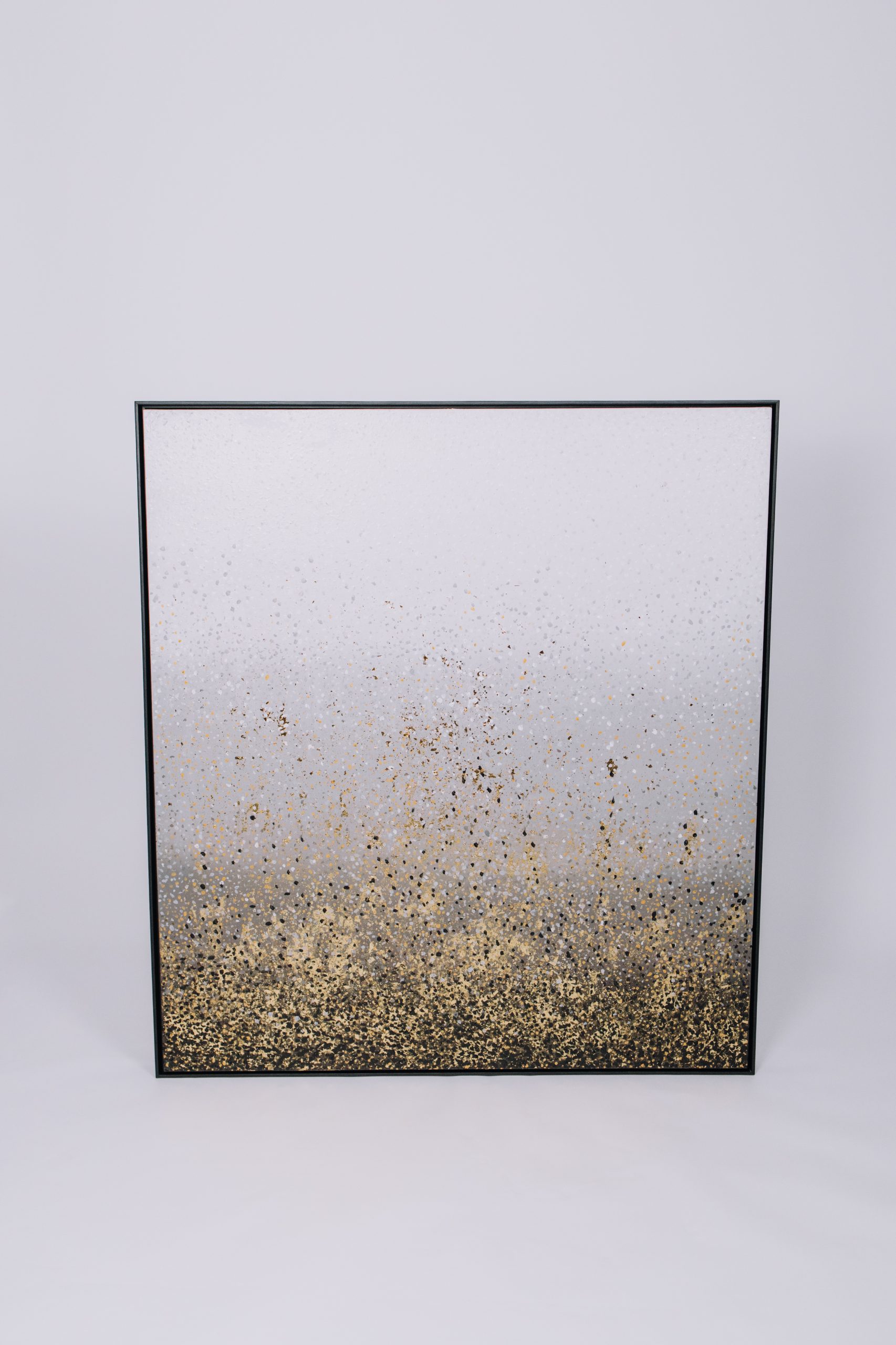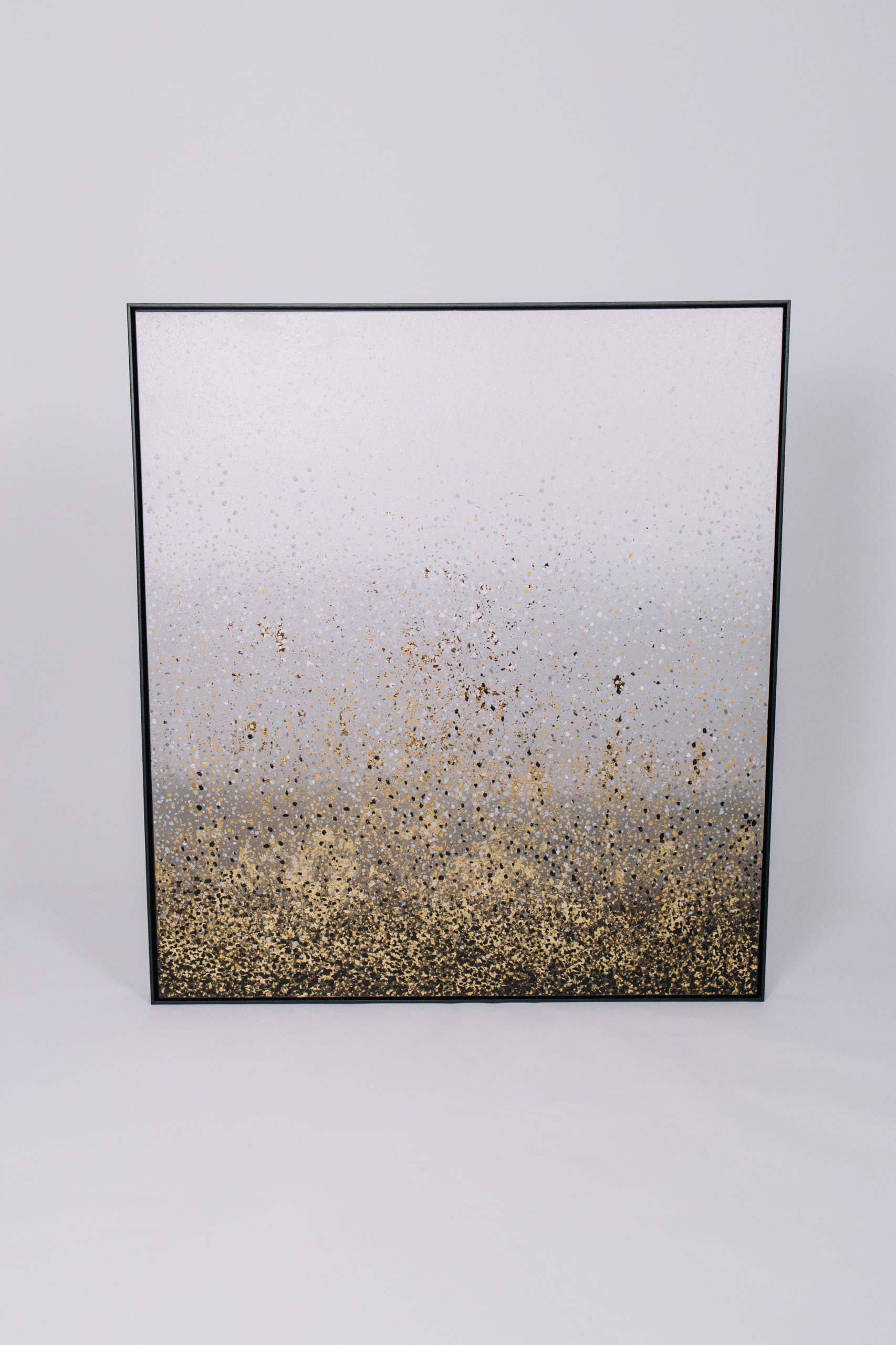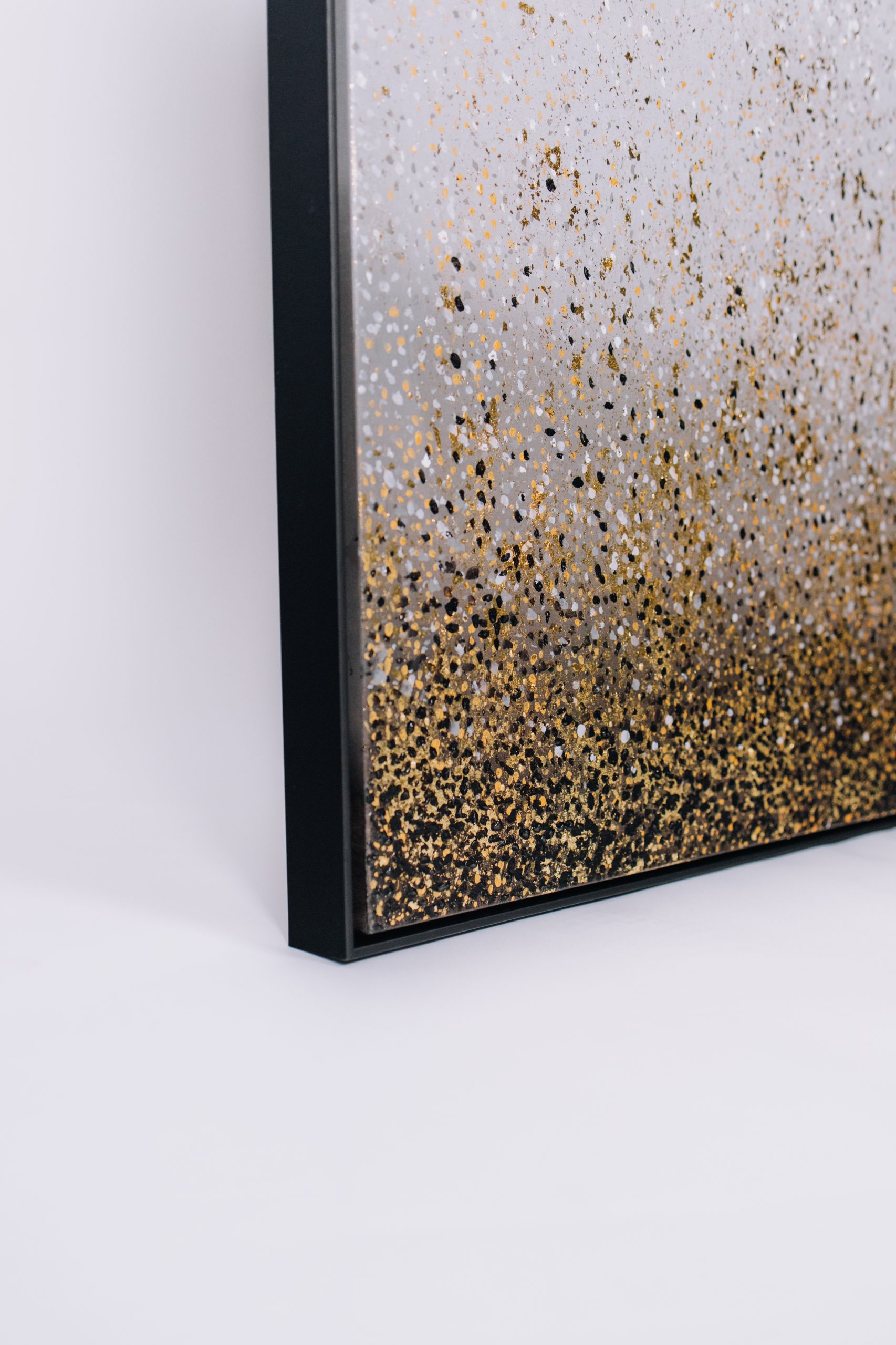 mescla tons translúcidos e metálicos, criando um gradiente que vai do branco ao negro, salpicado de dourado. A textura sugere uma superfície fragmentada, como se cada ponto