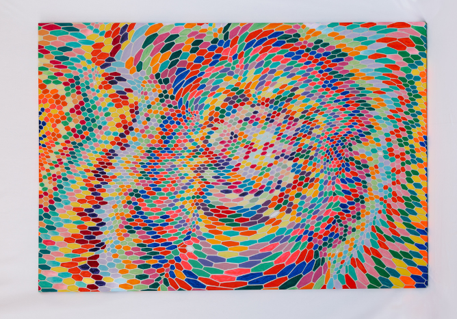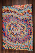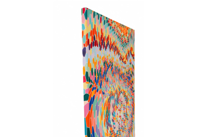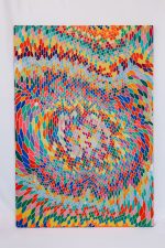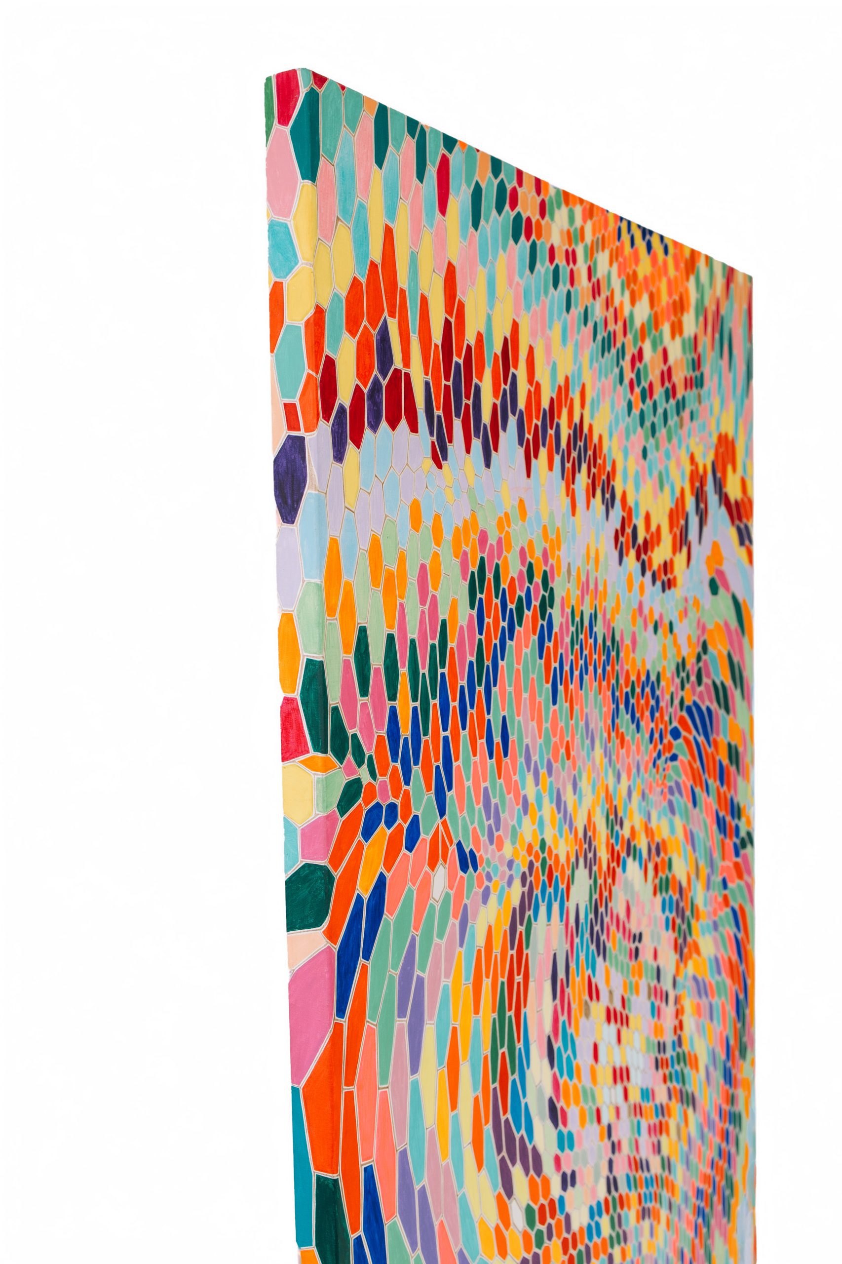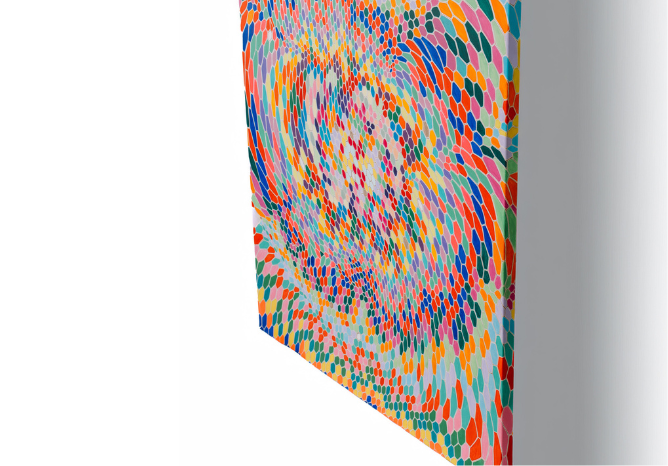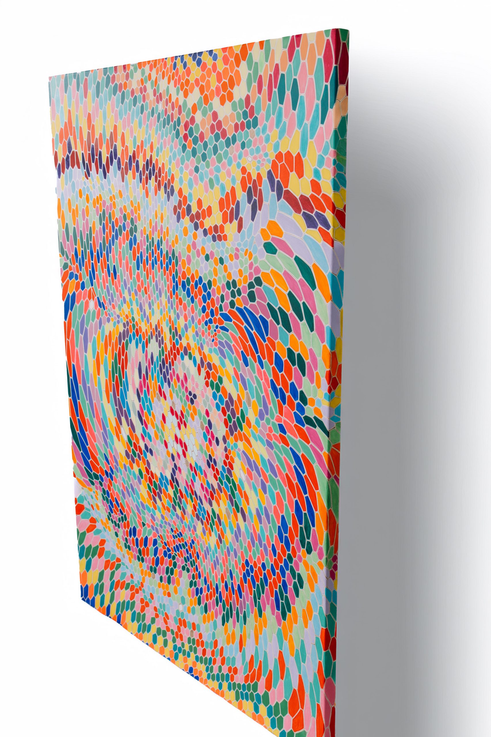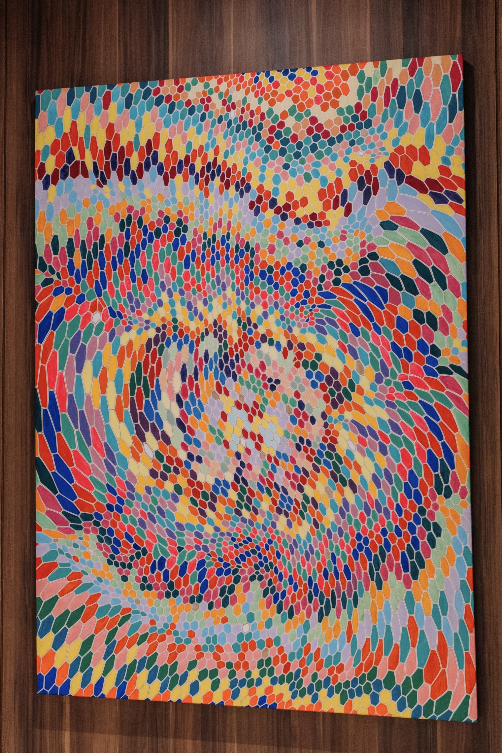 A partir desse arquétipo, **Depósito de Memórias** emerge como um espaço de introspecção e espiritualidade. Inspirado pelas experiências meditativas e pelos registros mentais que se formam durante a prática do yoga, a obra traduz visualmente o estado meditativo. Por meio de formas serpenteantes e espiraladas, cores em interação dinâmica e composições que remetem a um universo místico e infinito, a arte transporta o observador a um plano onde o tempo se dissolve e a contemplação se torna atemporal.