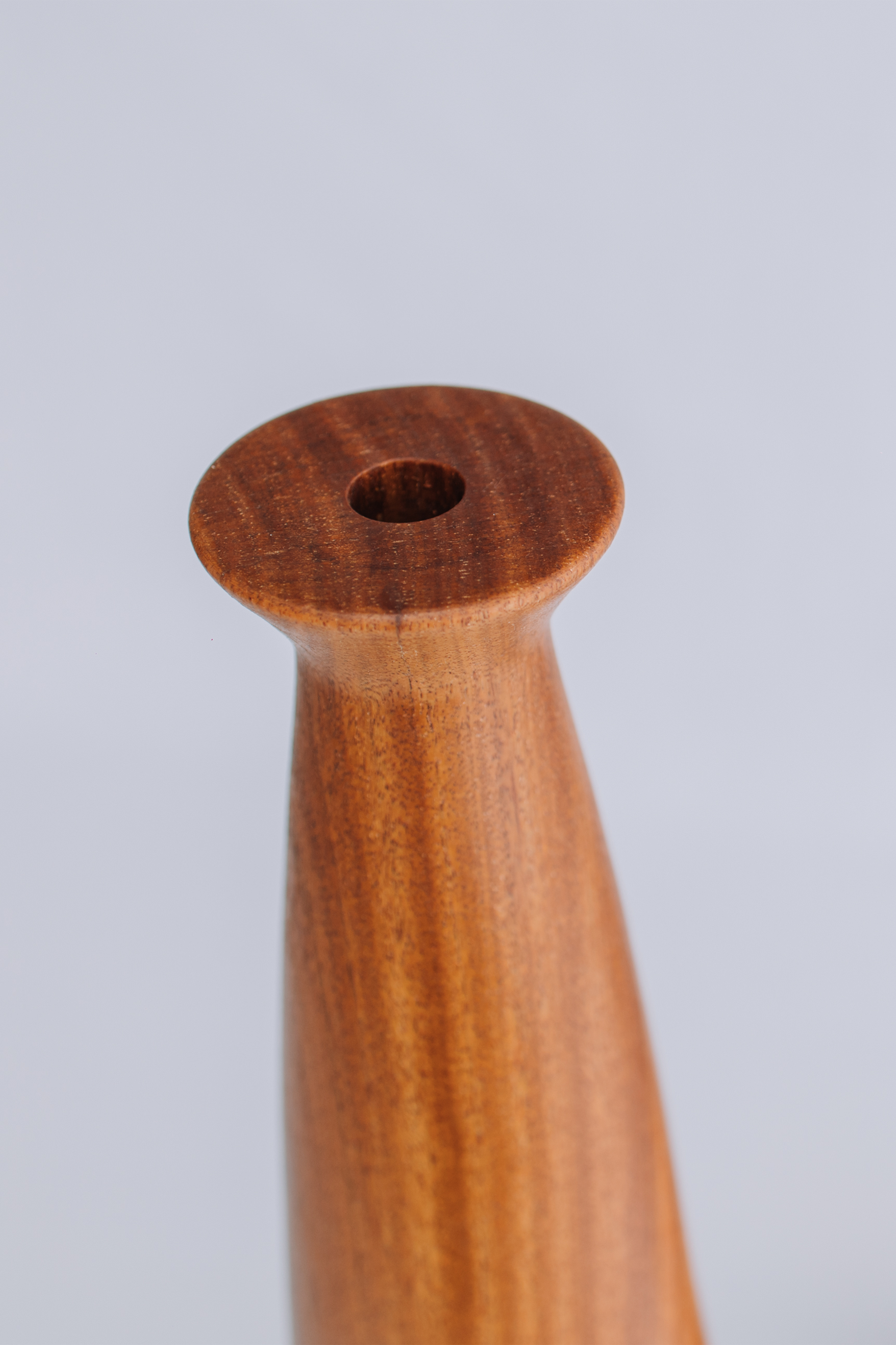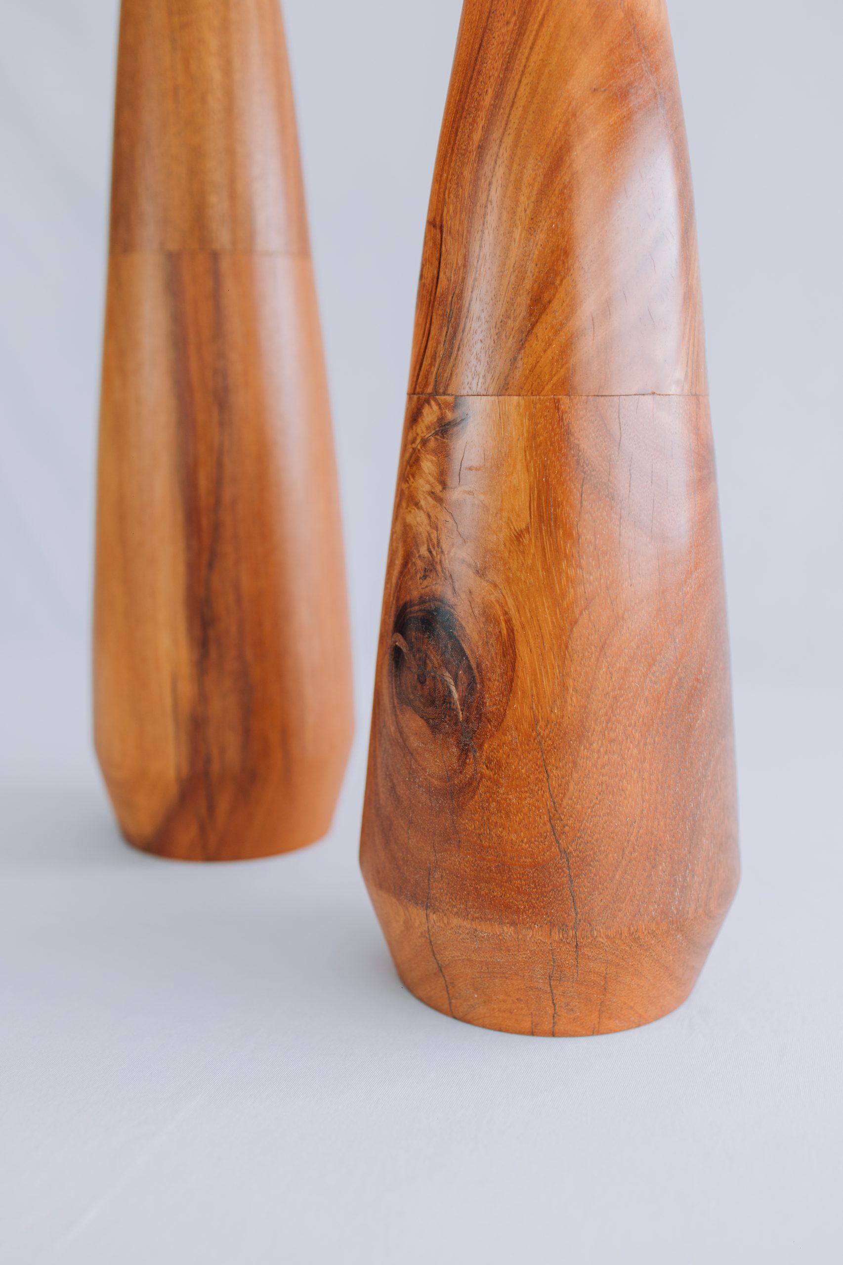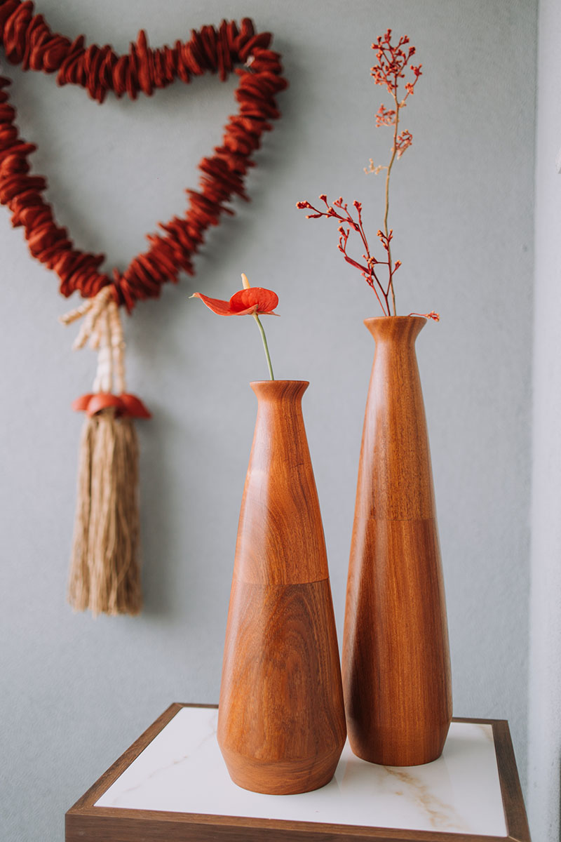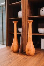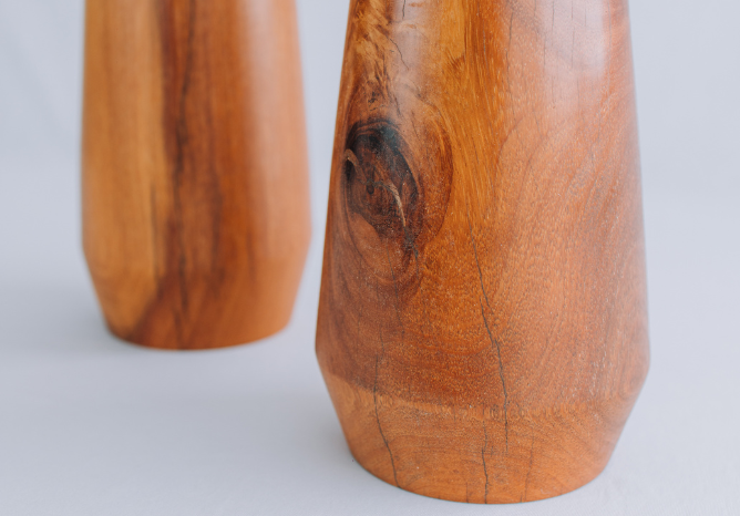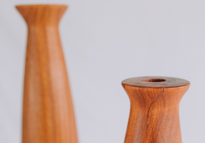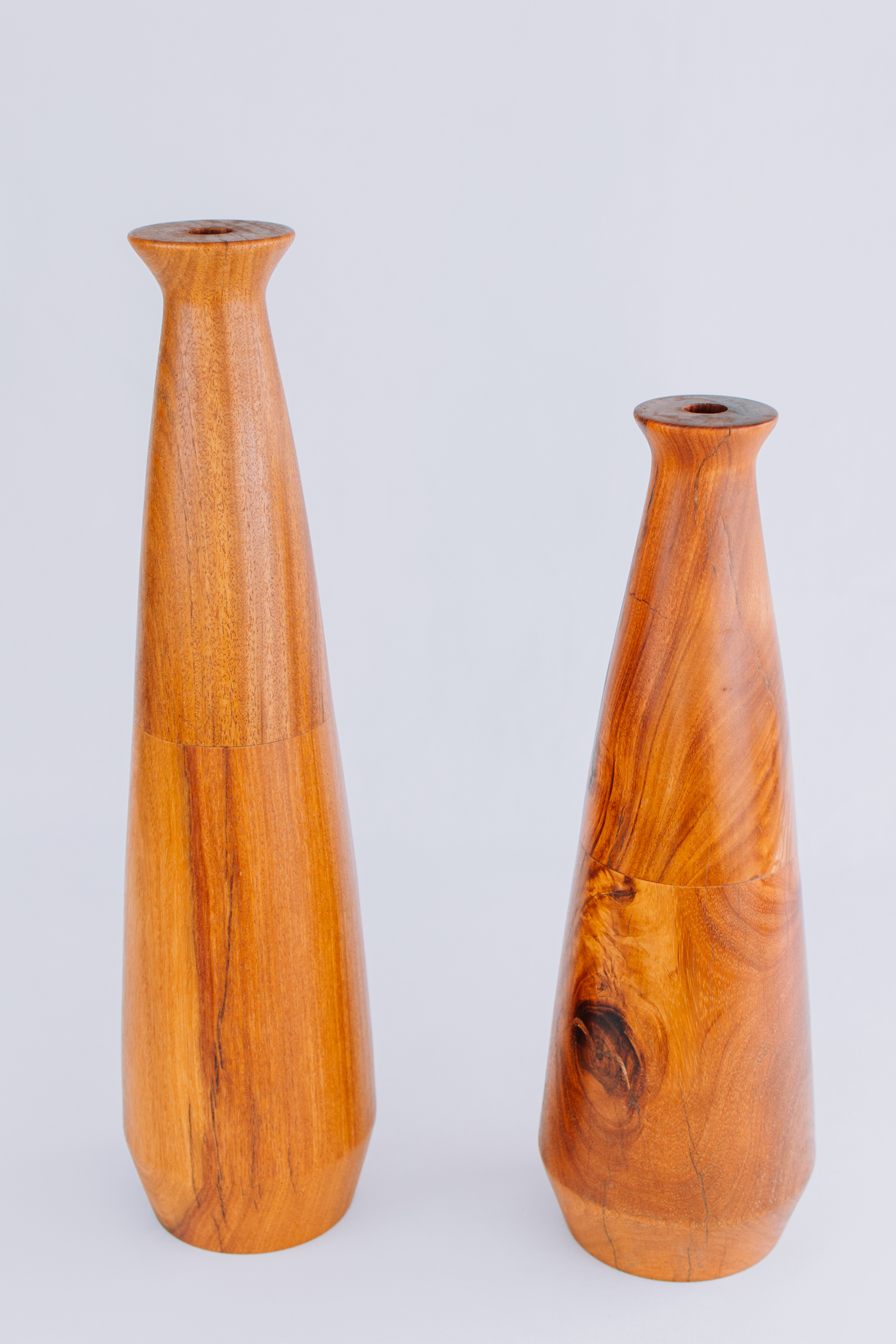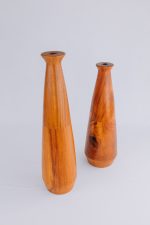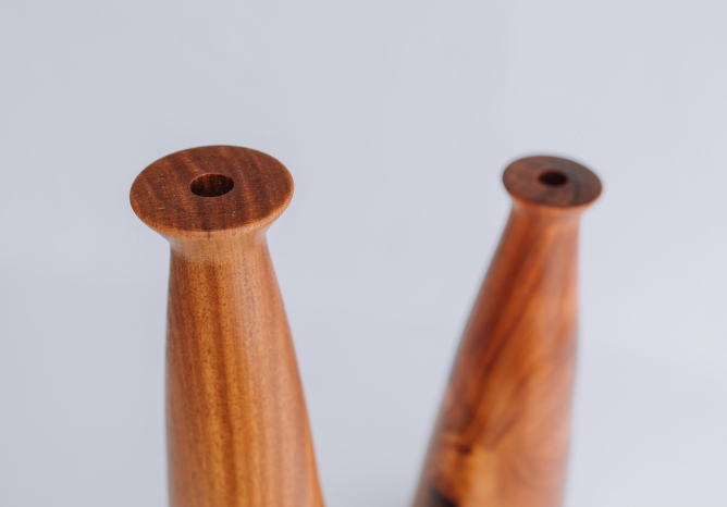 Desde vasos torneados, castiçais e incensários, até luminárias e cogumelos esculpidos à mão; também oferece utensílios variados, como tábuas de corte, bowls e pratos de madeira, cada um com a qualidade e o detalhe que só o trabalho artesanal pode oferecer.