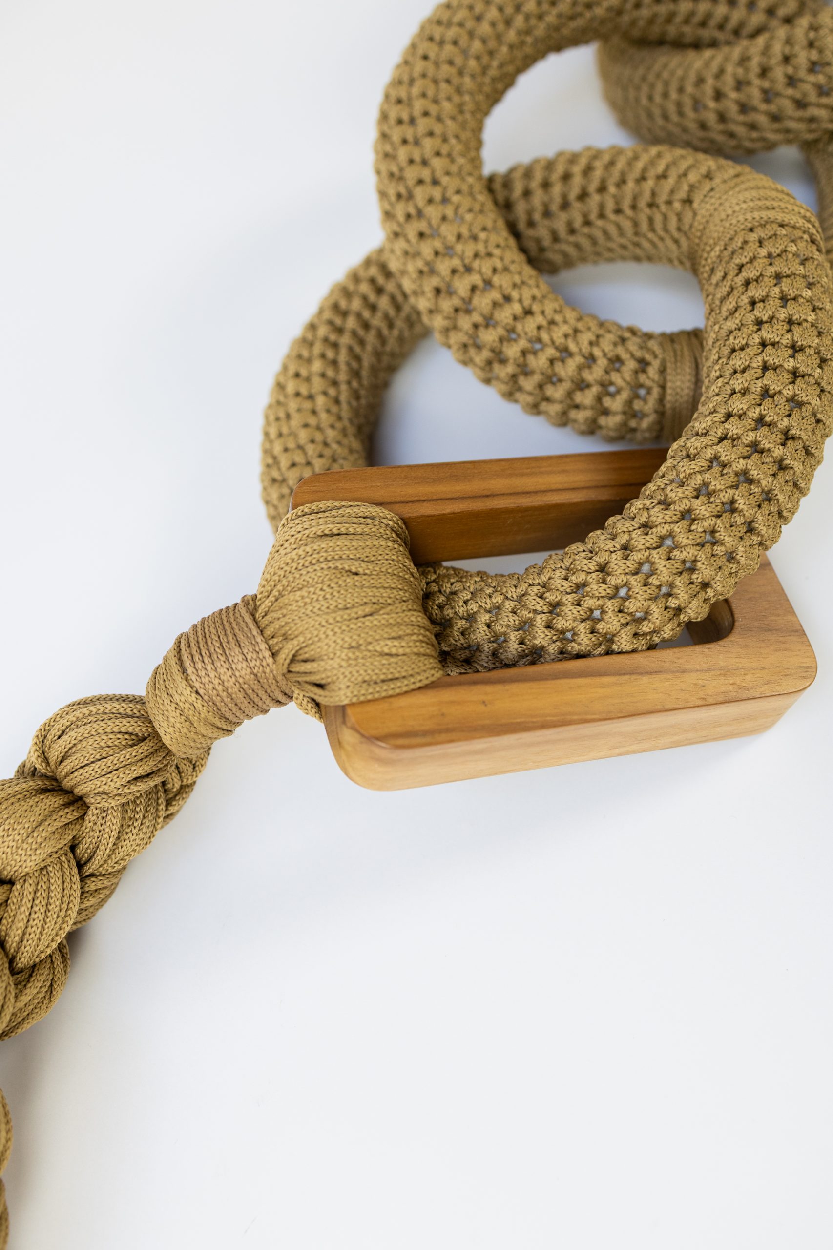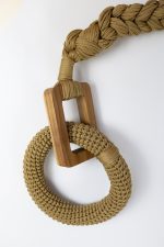 Tecida com fios na tonalidade cáqui e sustentada por elementos de madeira, a peça