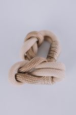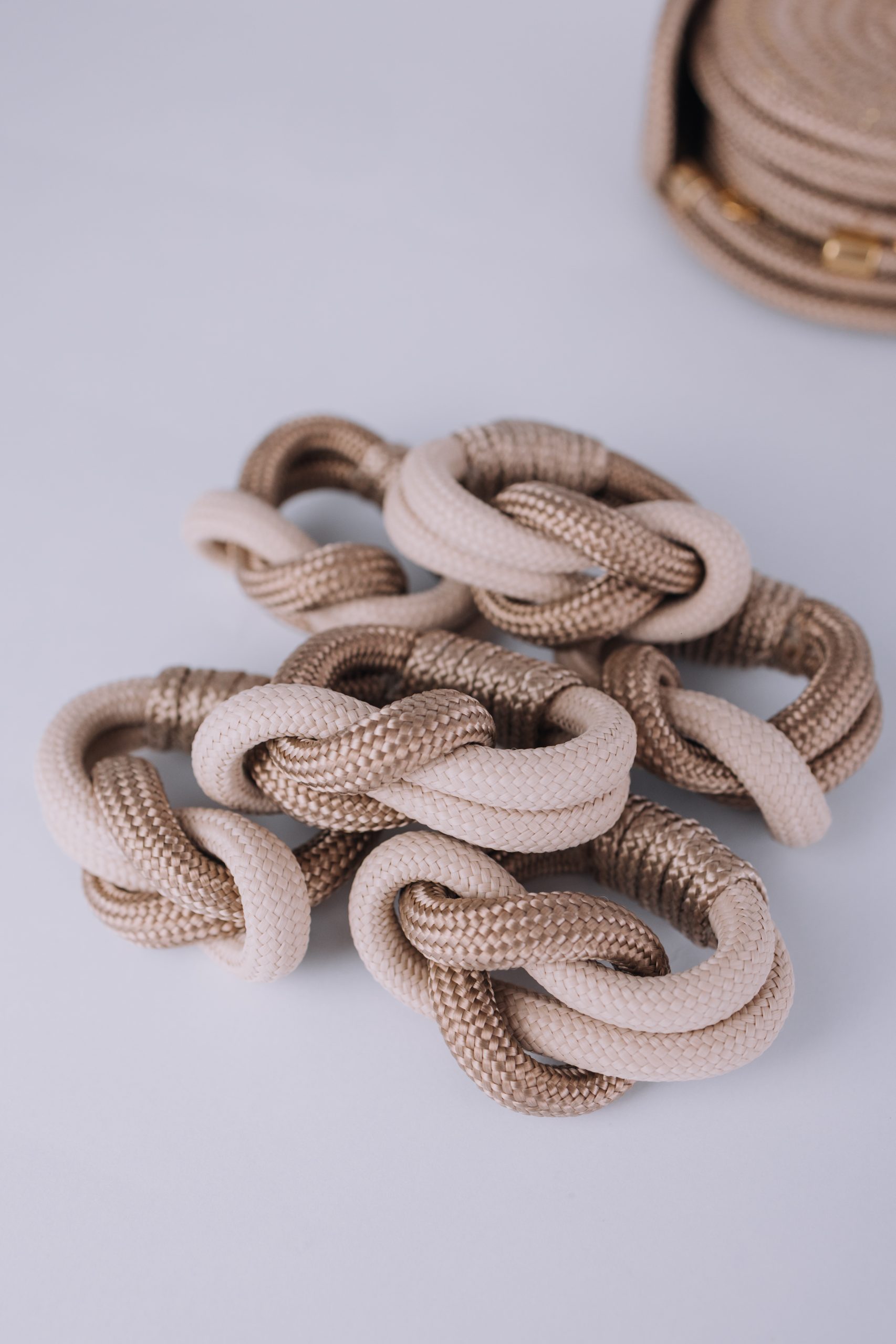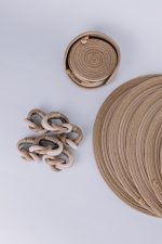 Conjunto Elos Guardanapo Cestaria Nórdica Dourado, criado pela artista Paula Castro, reúne 6 peças confeccionadas em corda náutica, metal e couro ecológico, aplicando técnicas de costura inspiradas na Cestaria Nórdica.