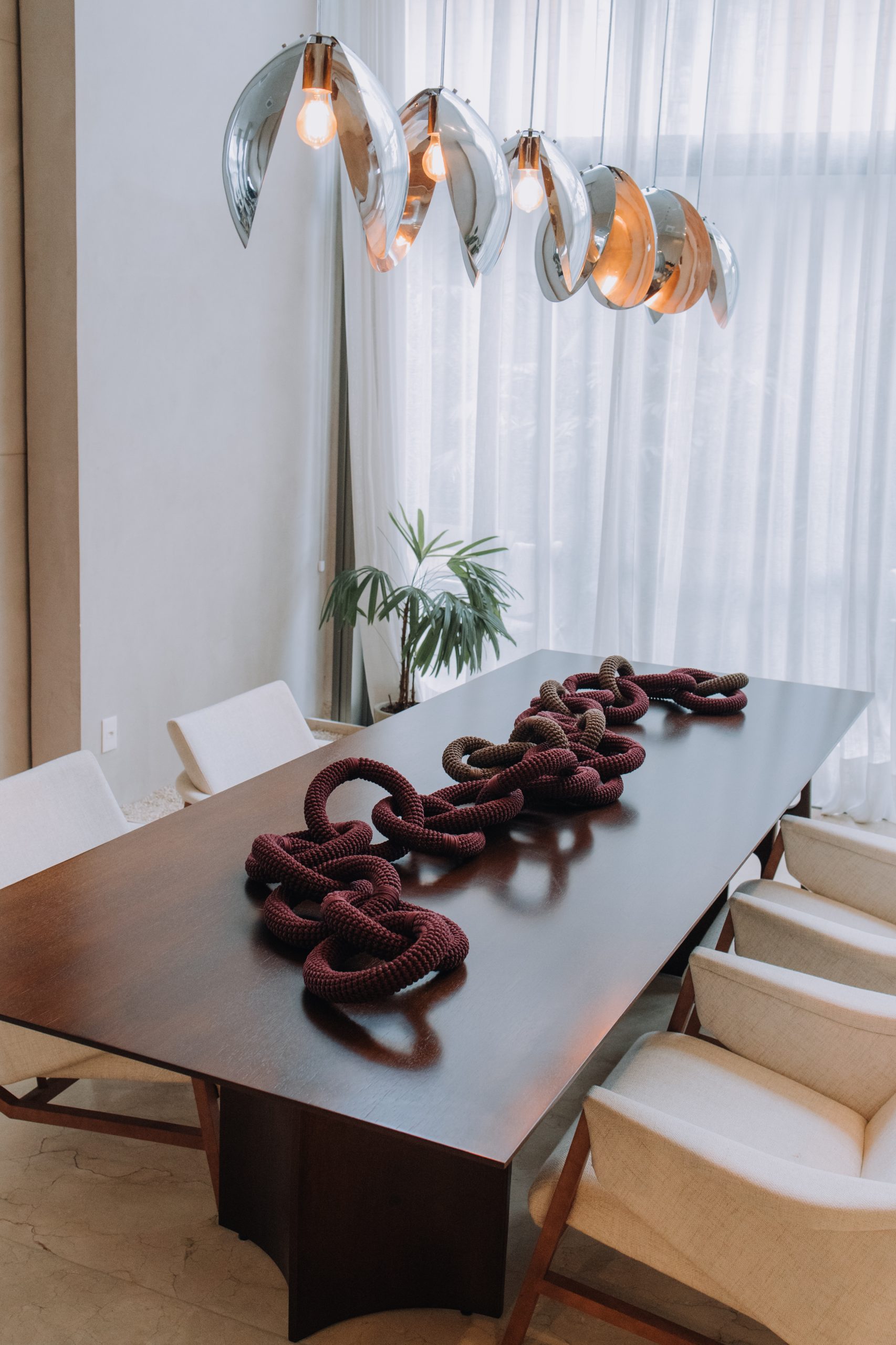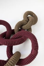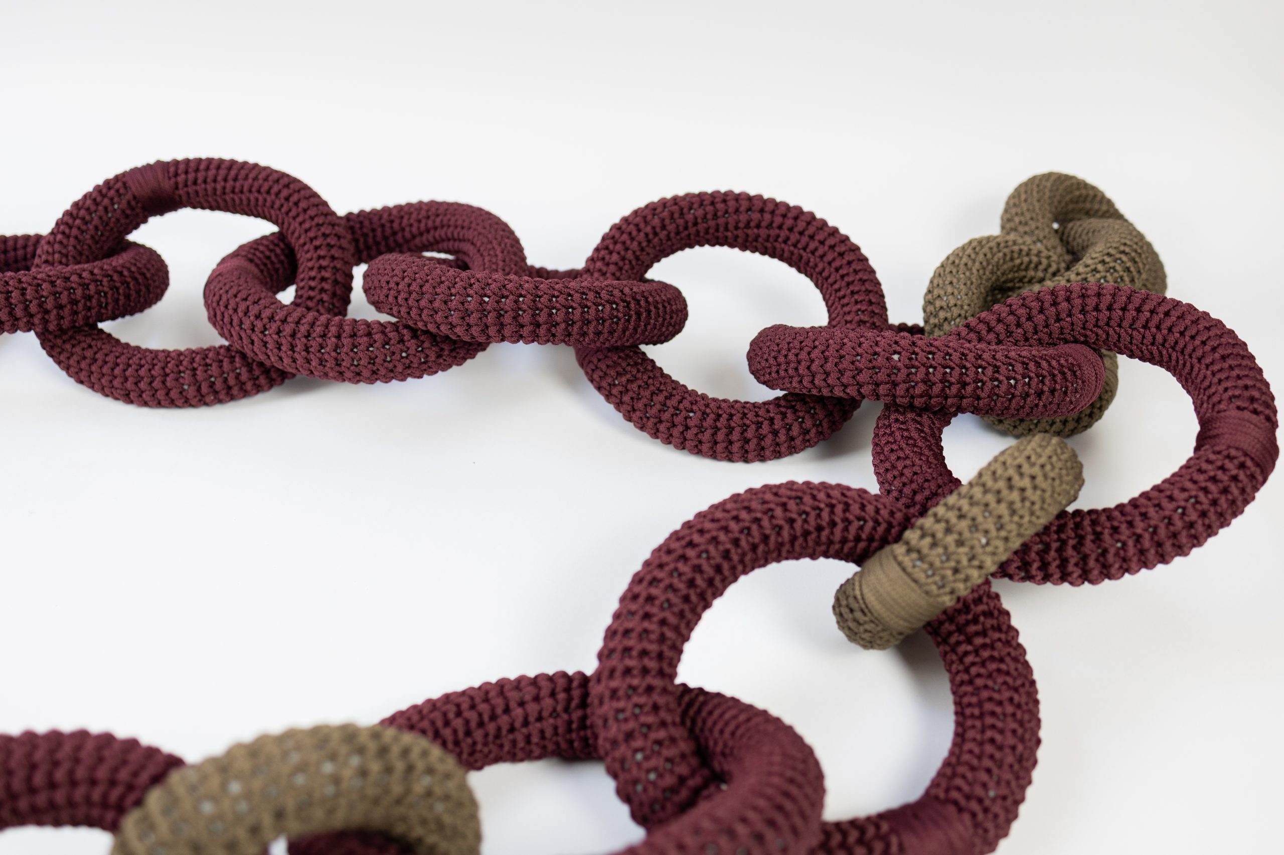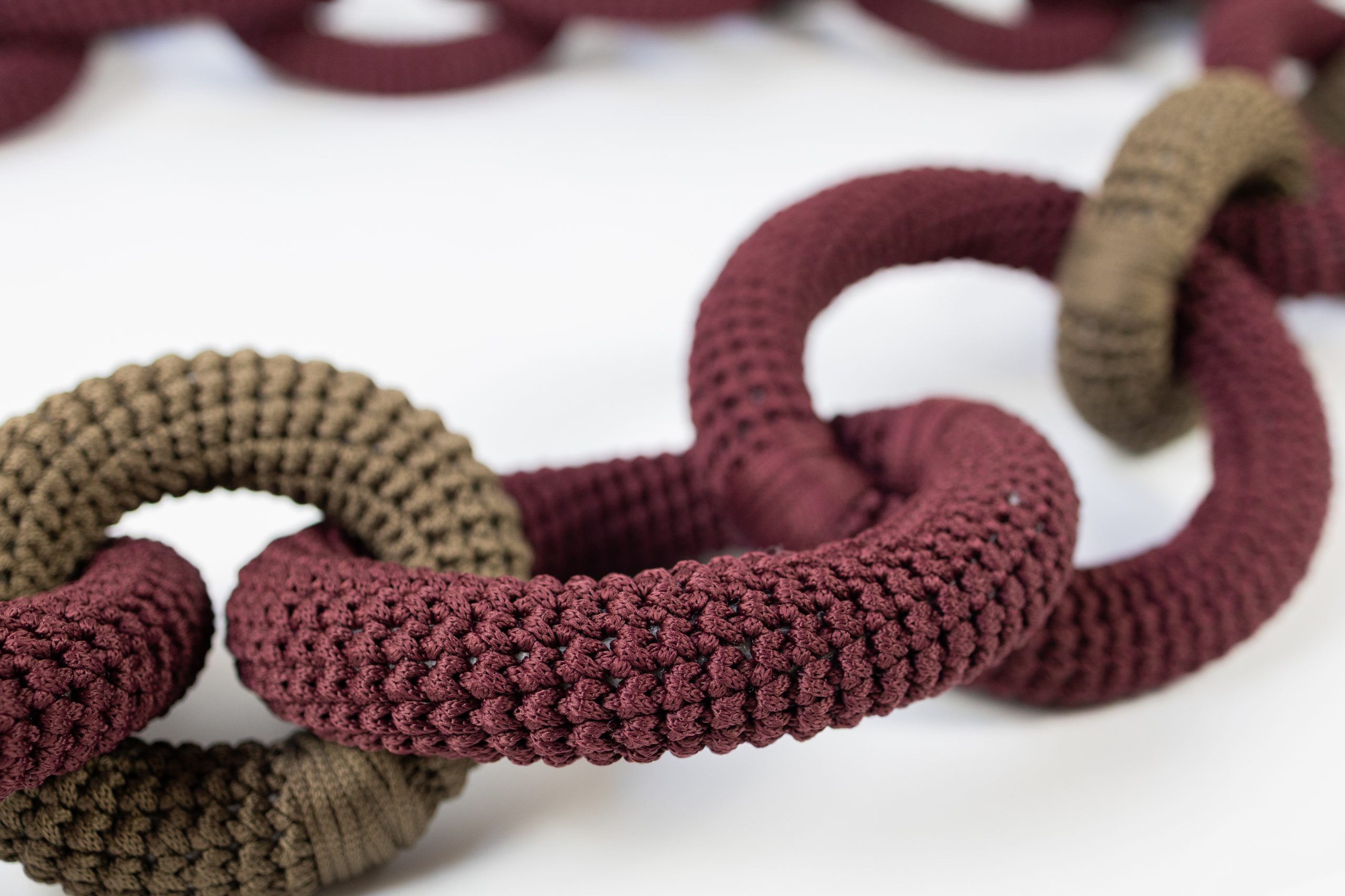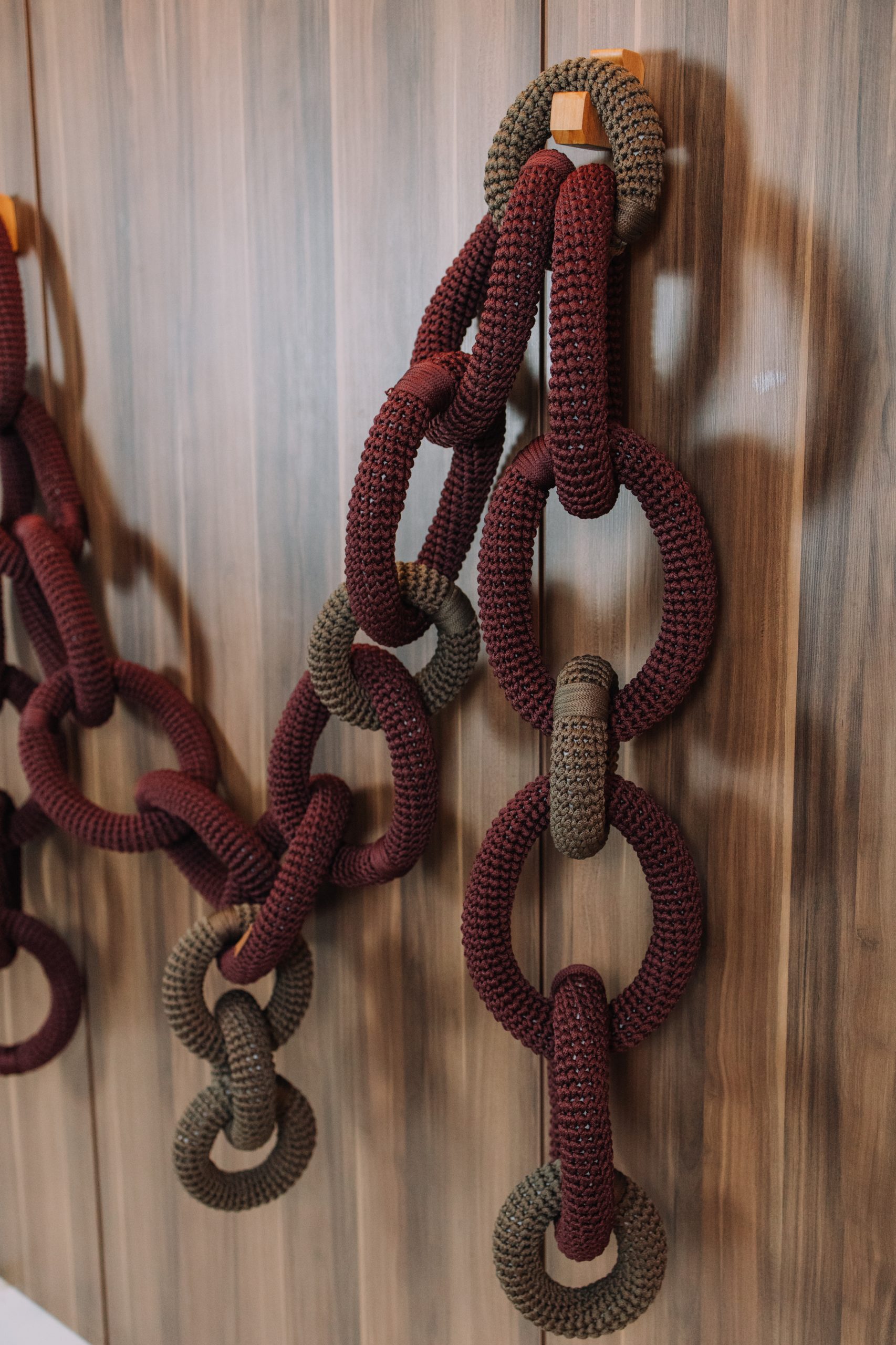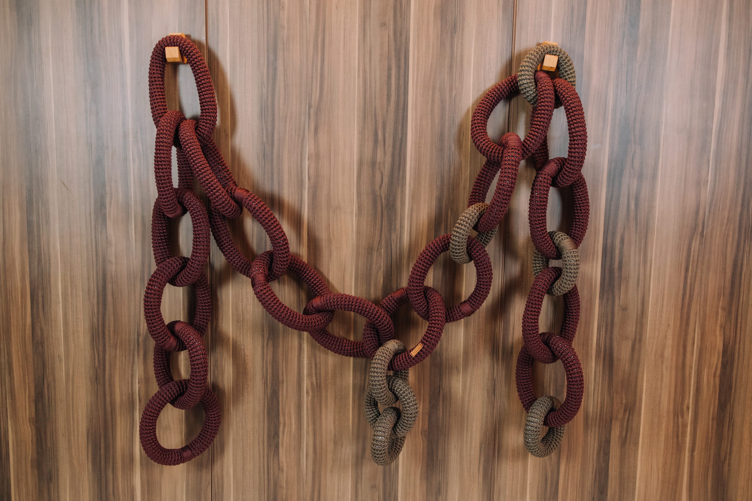 Criada com a técnica ancestral do crochê e utilizando fio náutico Anthurio, a peça é composta por elos em duas tonalidades que evocam paisagens naturais: o vinho remete à terra úmida e ao céu do entardecer; o fendi, à palha seca, à madeira, ao tempo que passa em silêncio.