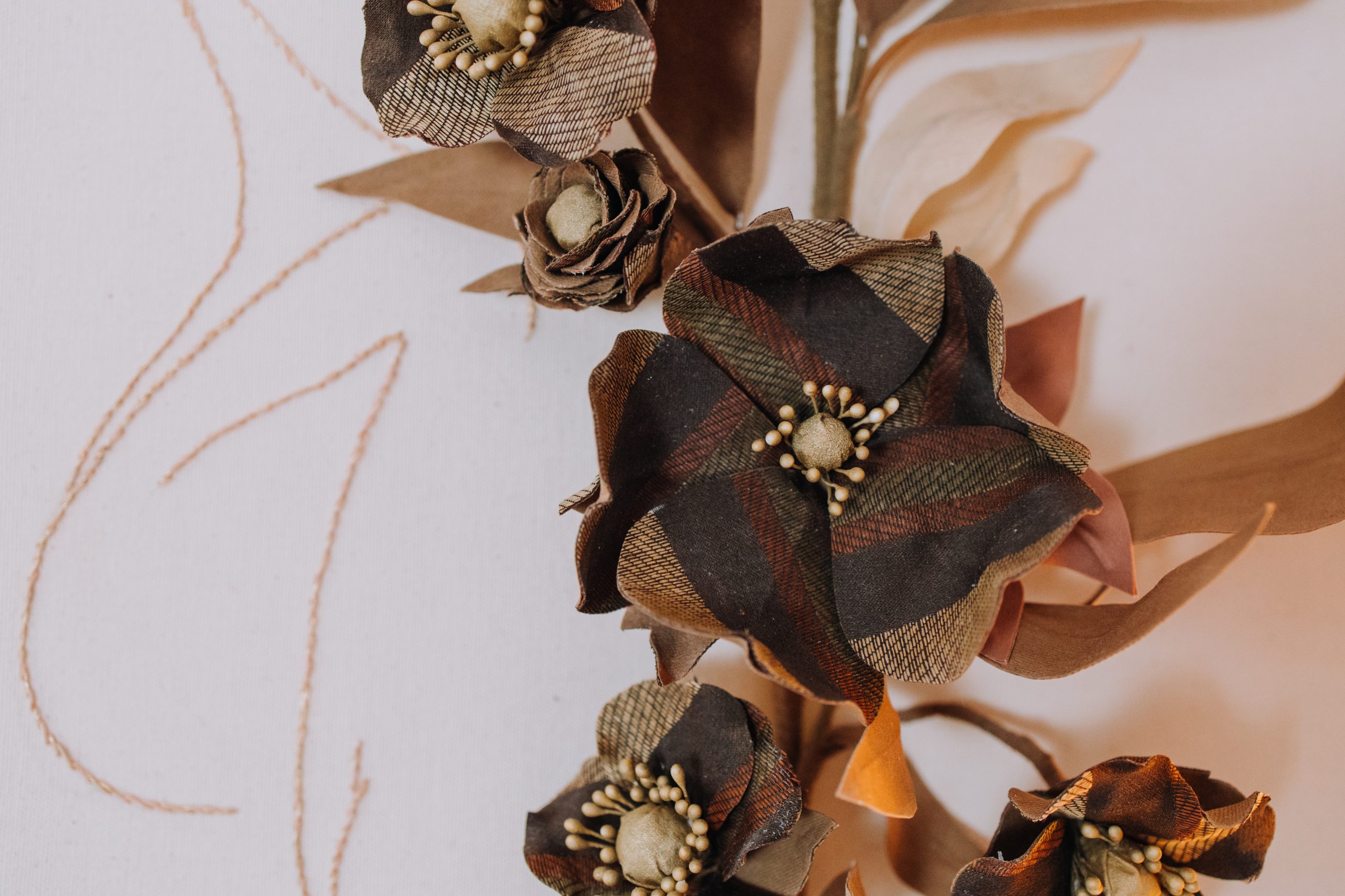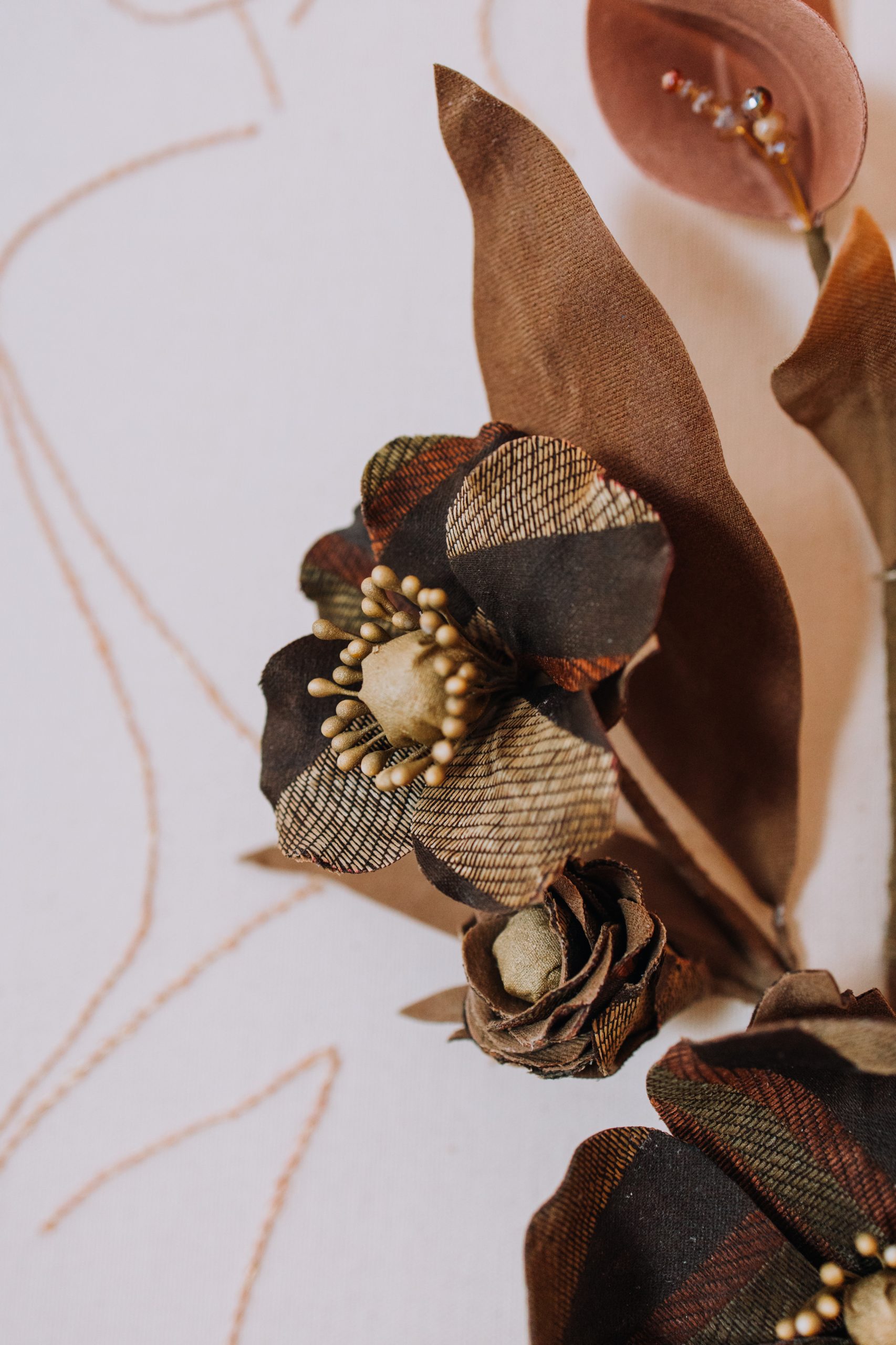 A aplicação de flores em tecido jacquard de seda, engomadas e estruturadas com arames, dá corpo ao que transborda do íntimo, aquilo que pulsa, que tenta atravessar a pele e