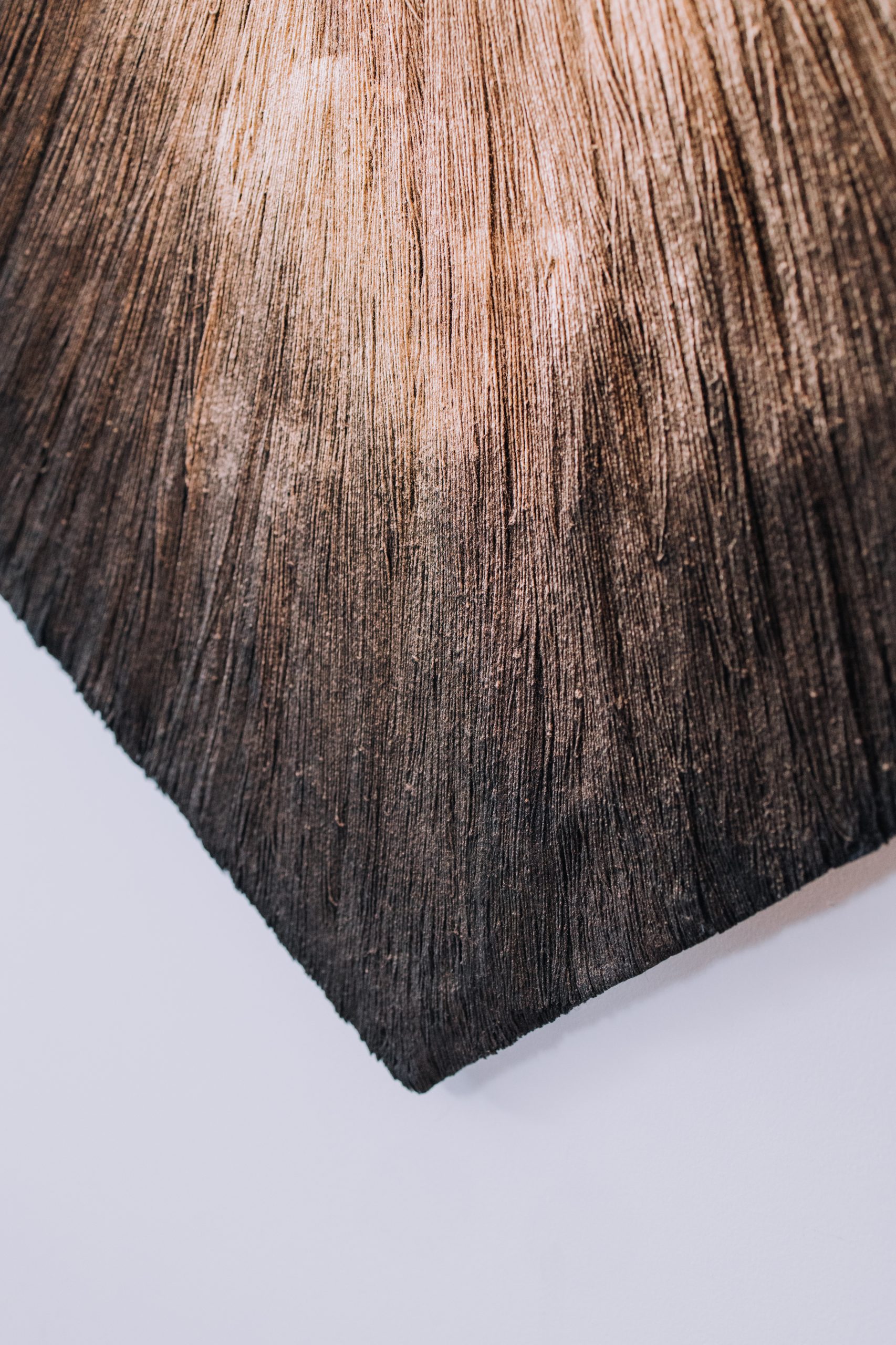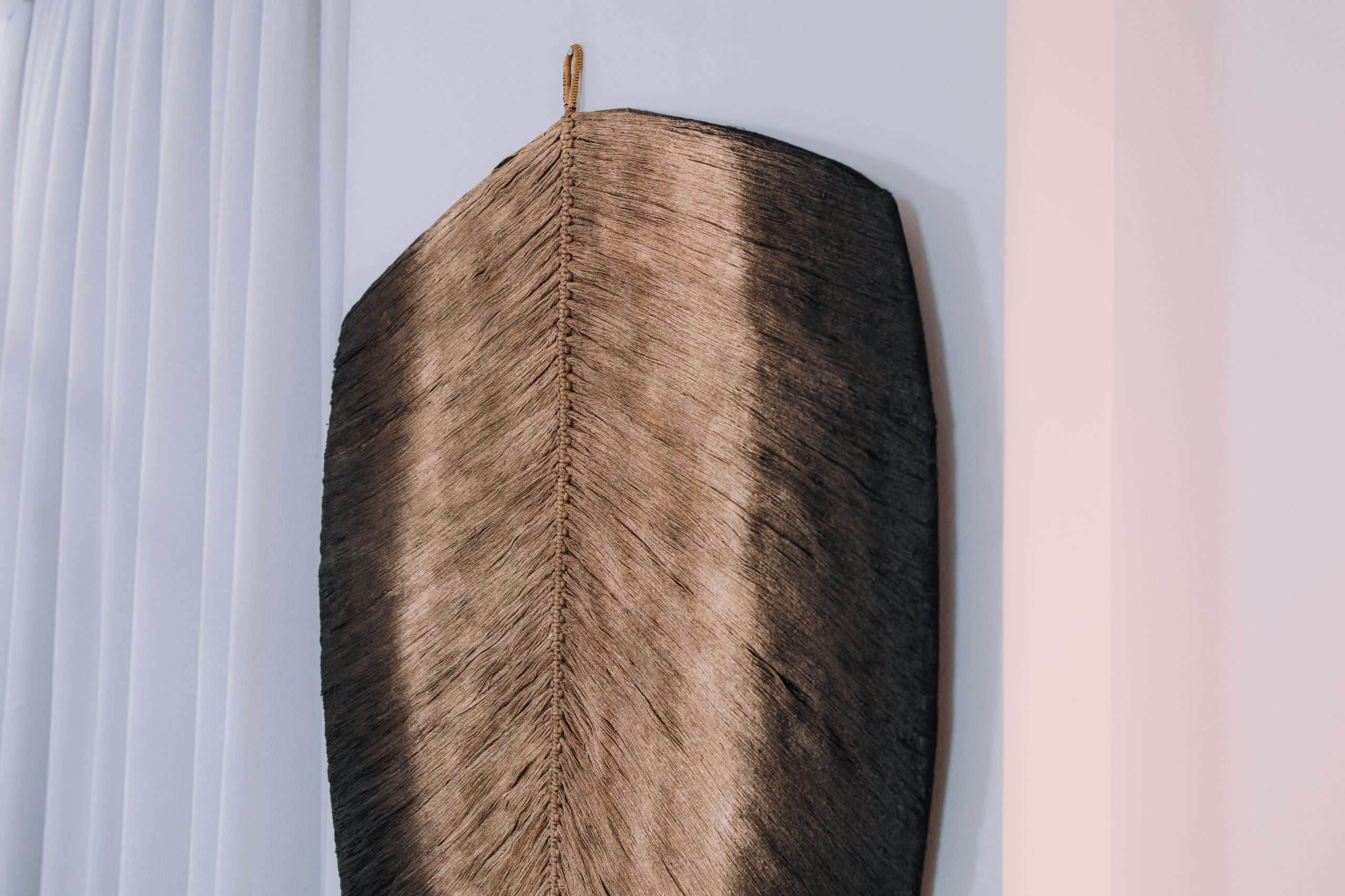 Cada nó, cada camada e pincelada carrega intenção, como se a artista bordasse um sussurro na matéria: que a arte pode ser abrigo, e a folha, um relicário.