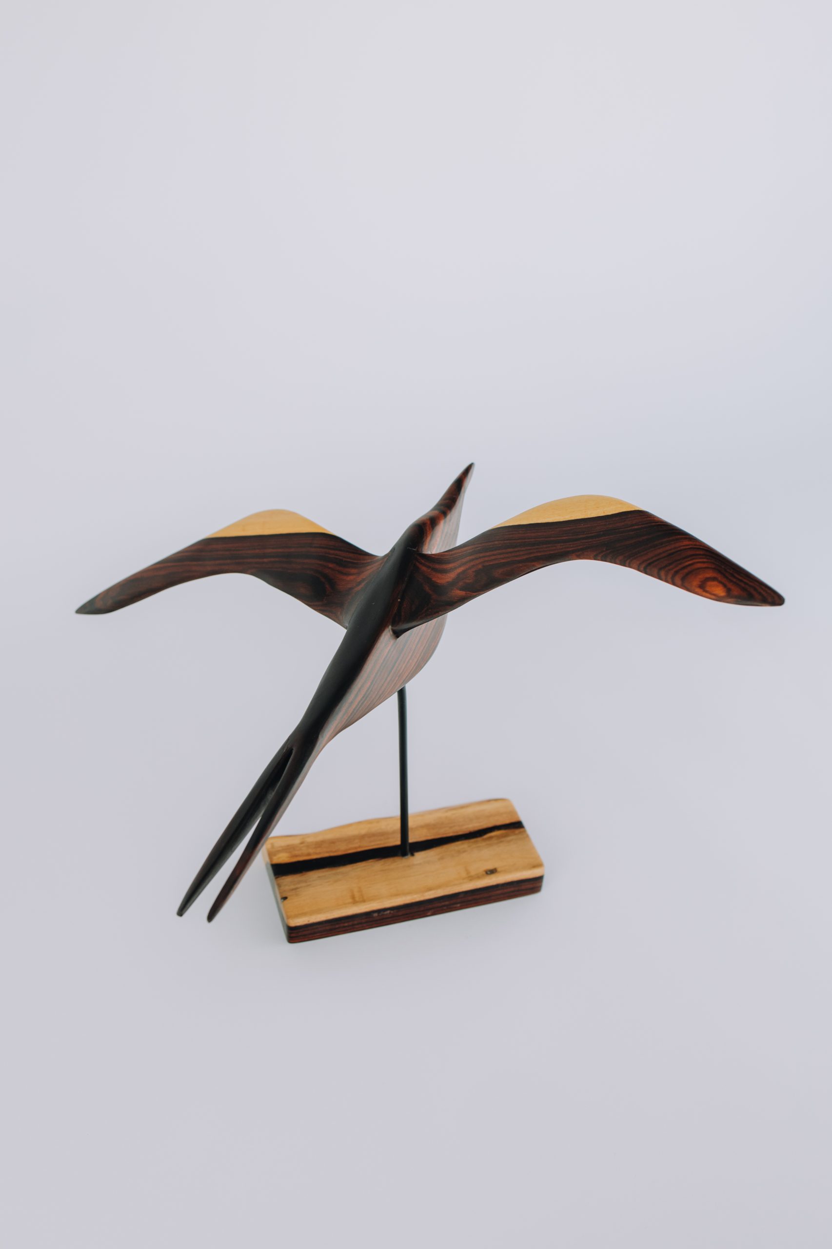 singular e coloração fascinante. Seus tons de violeta, creme e preto se entrelaçam organicamente, criando uma dança visual de luz e sombra. O acabamento impecável evidencia a riqueza da matéria-prima e a precisão do artista, que alia madeira e inox em um equilíbrio tão elegante quanto o voo da fragata.