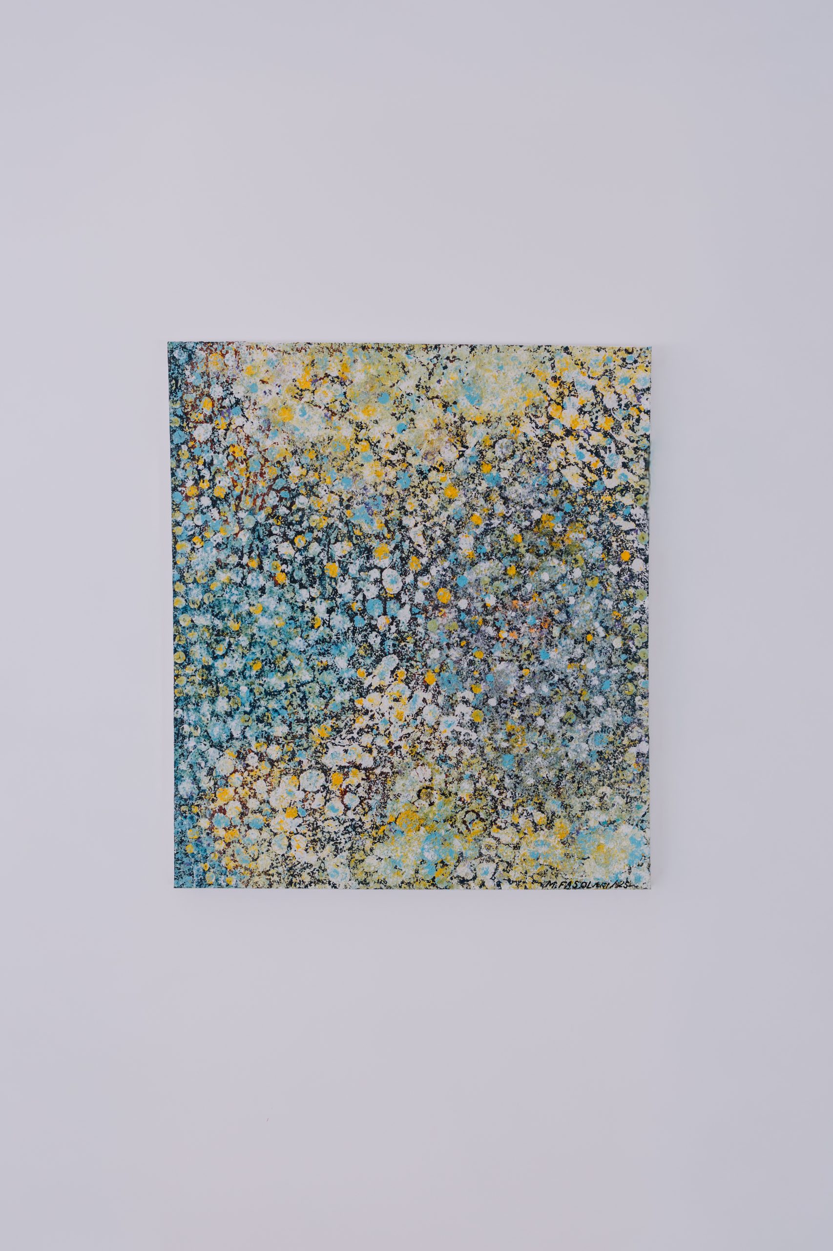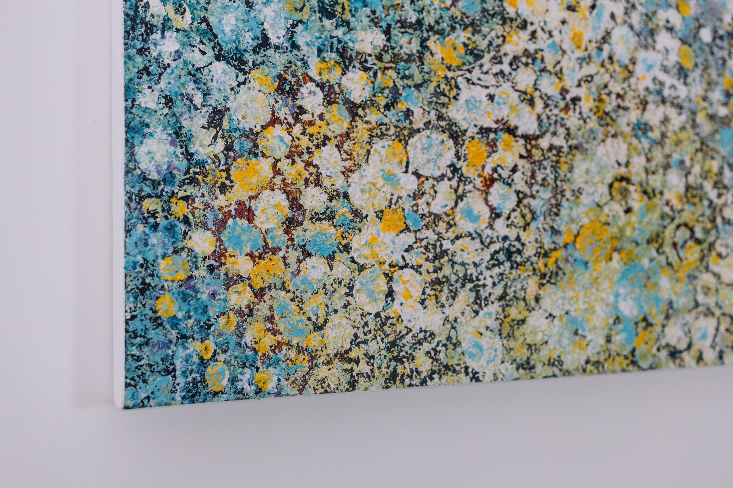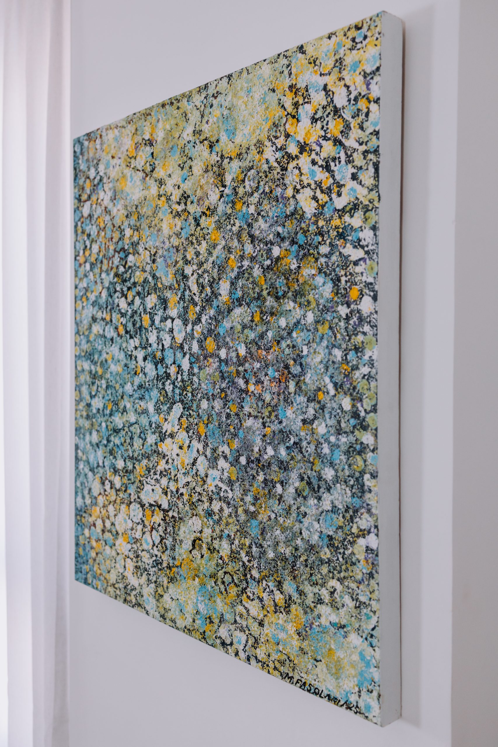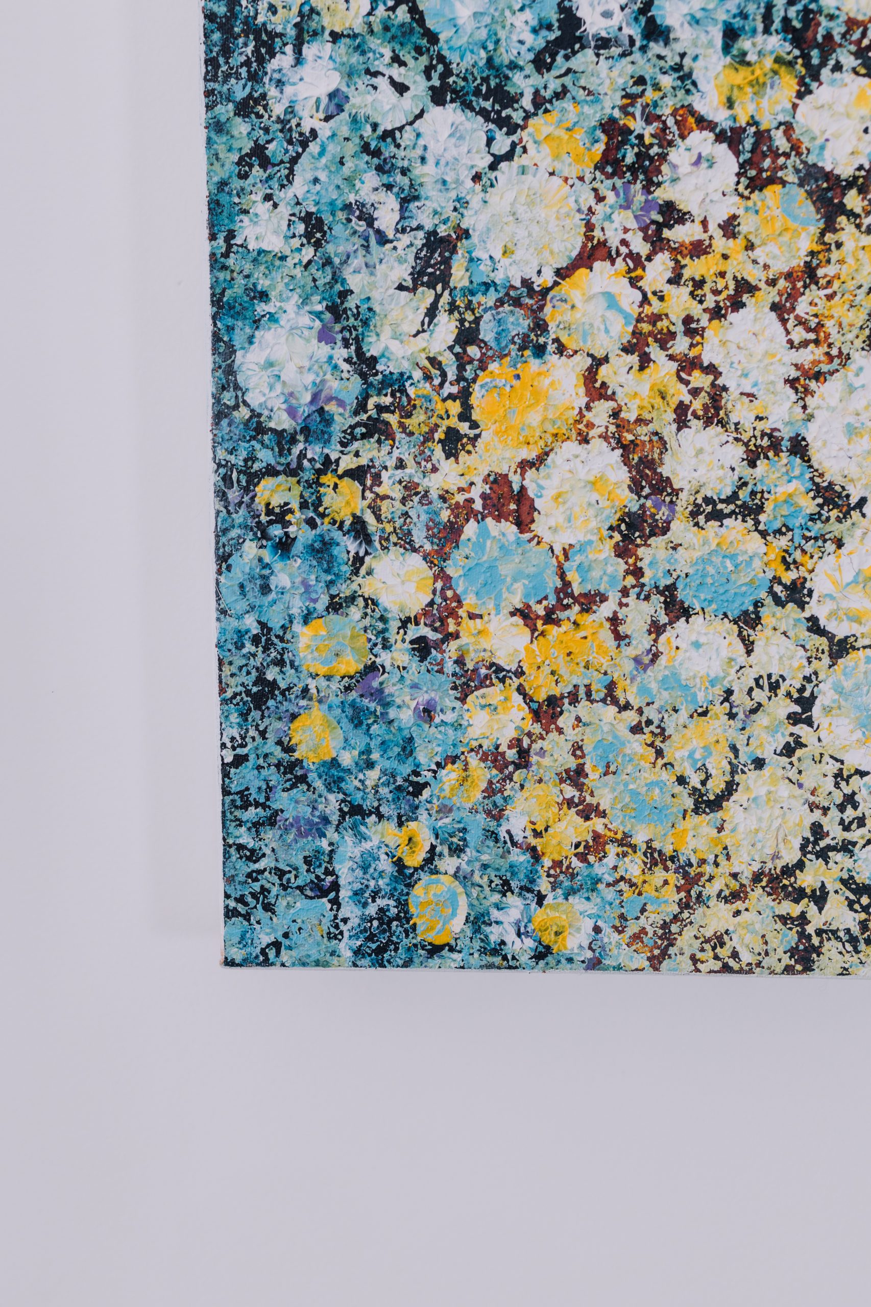 A obra Jardim Noturno foi criada em tinta acrílica e pasta de modelagem sobre tela, medindo 80 x 90 cm e com 4 cm de profundidade. A técnica com espátula e o uso de volumes conferem textura e movimento à superfície, revelando a materialidade das cores e o contraste entre luz e sombra.