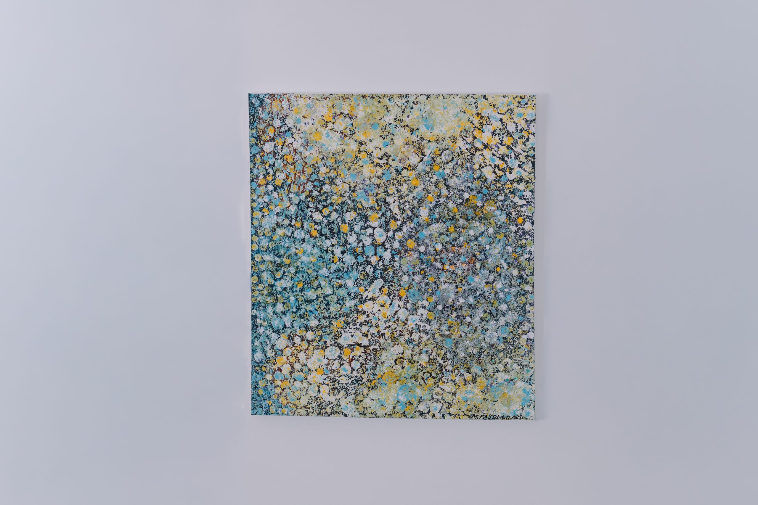 Suas obras abstratas são feitas com tinta acrílica, areia, espátulas, rolos, pastas de modelagem e gesso acrílico, combinando técnica e espontaneidade. Cada peça é uma expressão de como ele enxerga o mundo, trazendo alegria, energia positiva e vitalidade para quem a contempla.