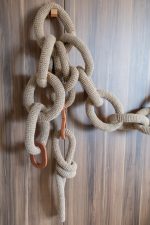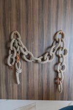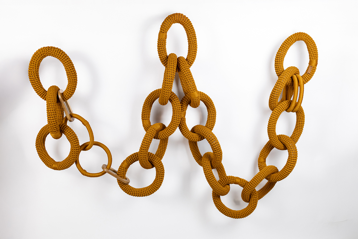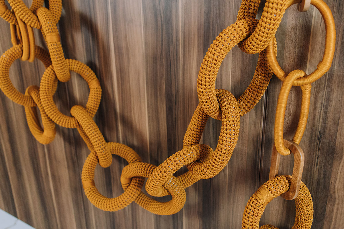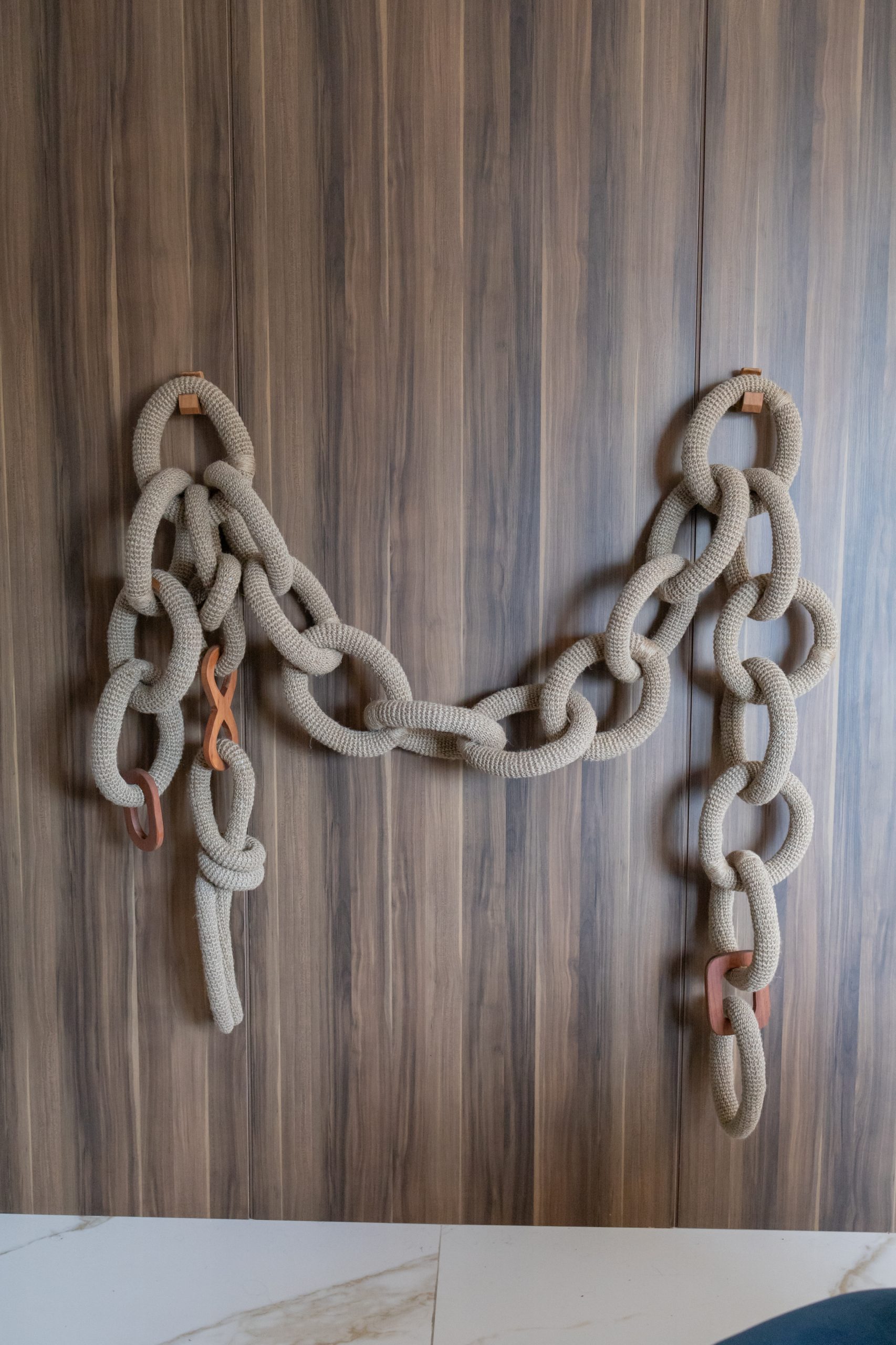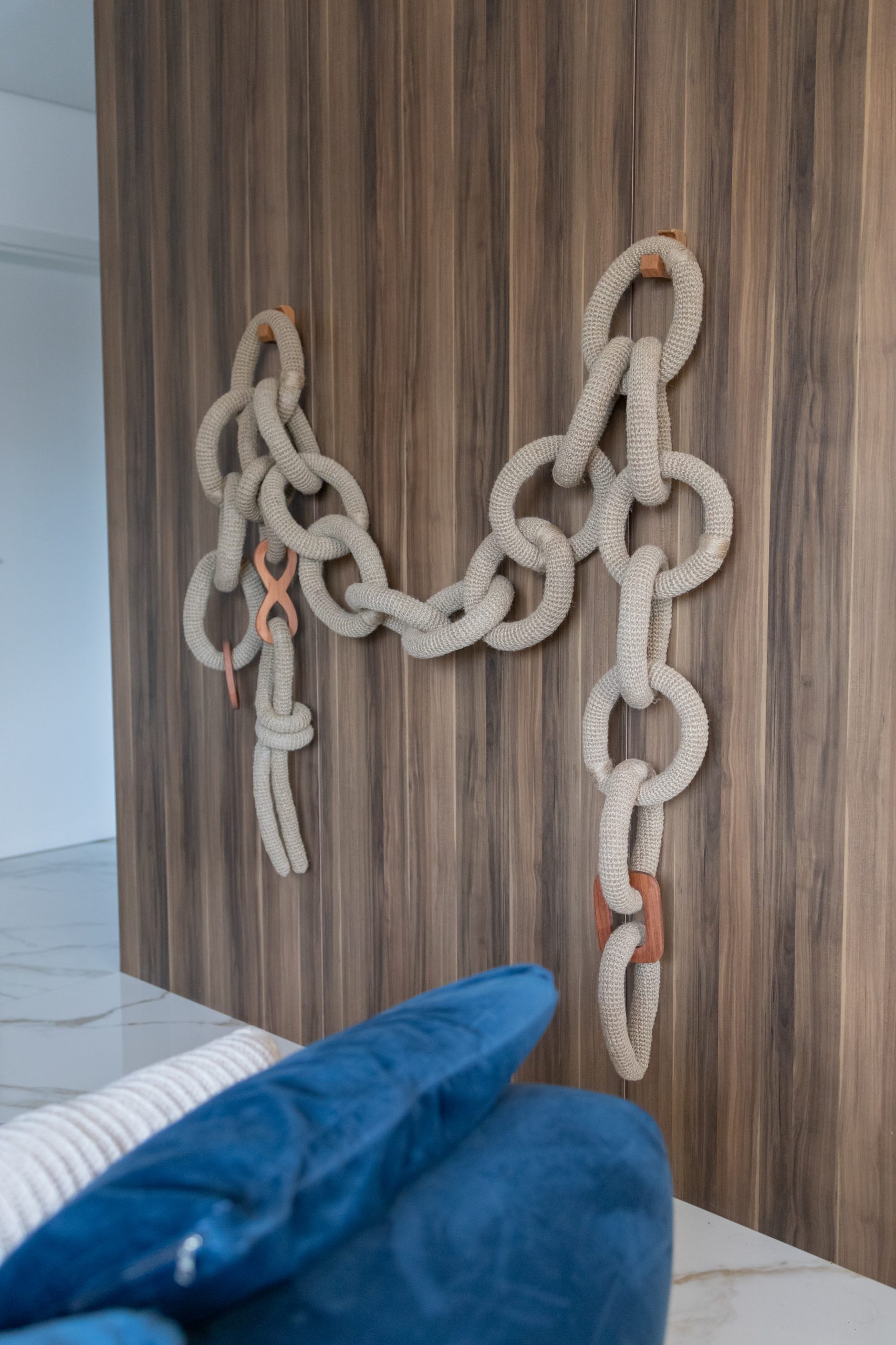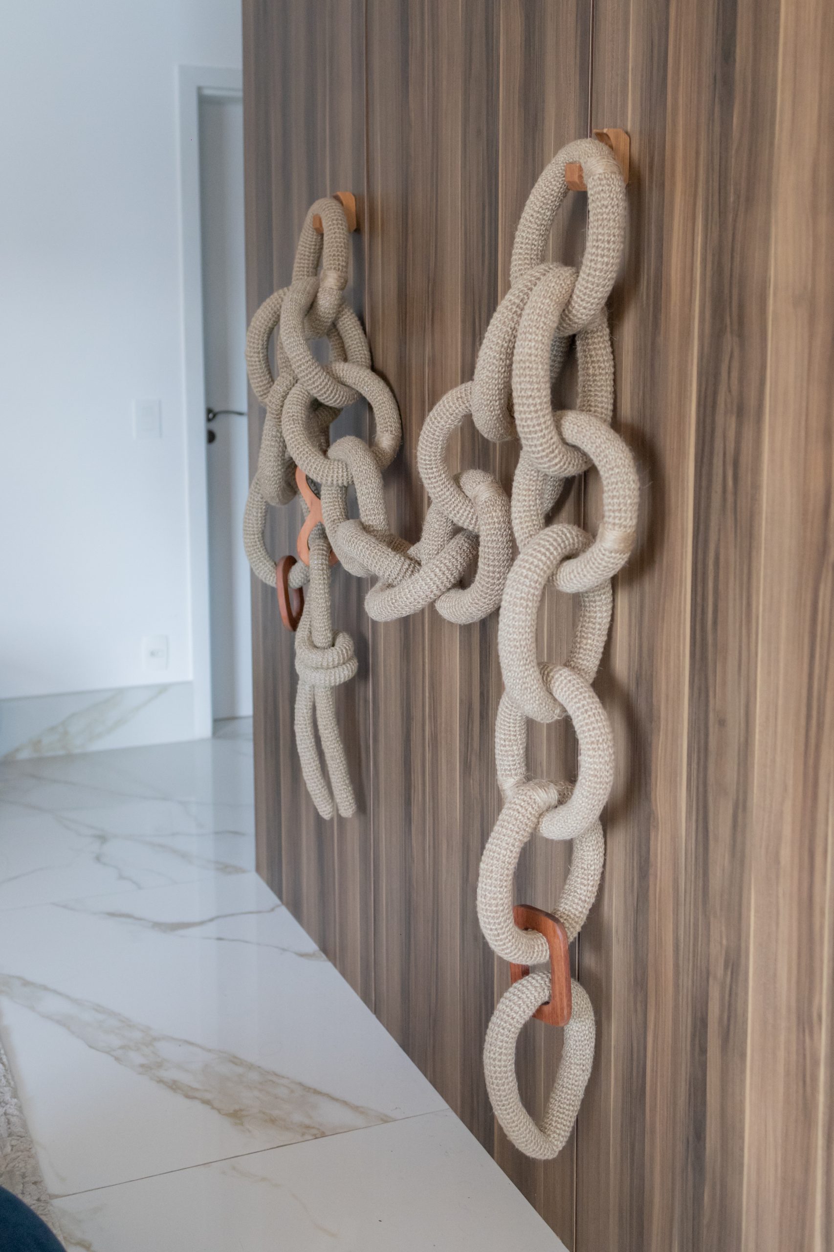 Com 3,80 metros, o colar vai além de um simples objeto de decoração; ele se torna uma extensão da natureza em seu lar. A combinação de madeira e crochê, com seus elos trançados de forma orgânica, ecoa o ritmo das árvores e plantas, uma verdadeira homenagem ao que é natural, ao que cresce e respira.