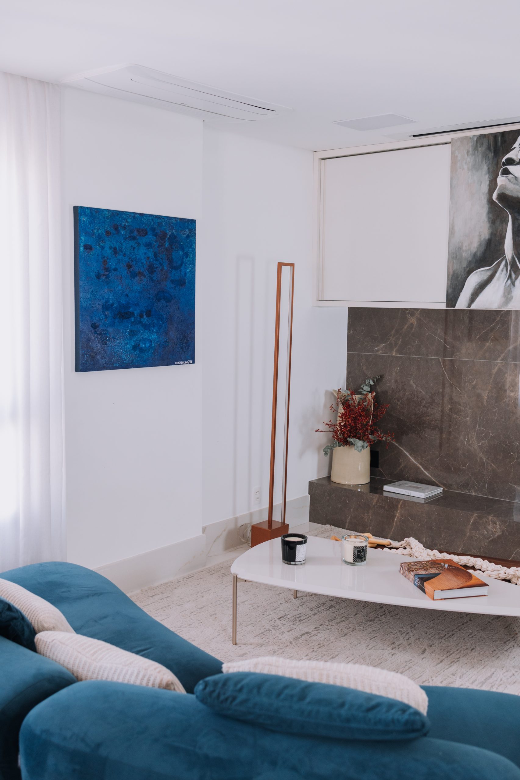 O azul dominante conduz o olhar para dentro, um espaço de mistério, calmaria e introspecção. A obra evoca a fluidez da natureza e a imensidão do desconhecido, revelando, em cada detalhe, o diálogo entre profundidade e leveza, força e contemplação.