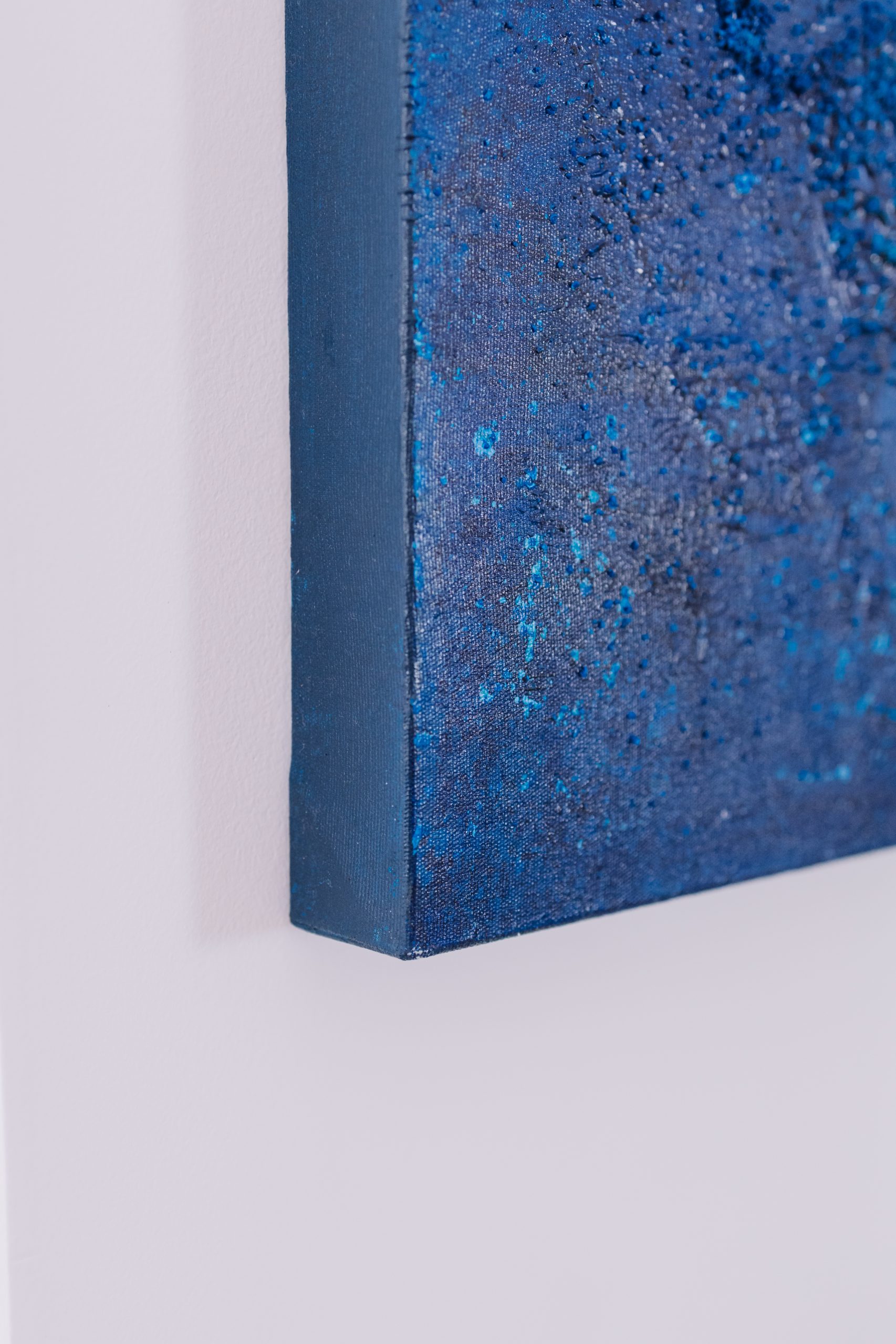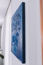 Mar Profundo é uma composição abstrata em tinta acrílica, areia e cola sobre tela, medindo 80 x 80 cm e com 4 cm de profundidade. A textura resultante da mistura de materiais adiciona relevo e movimento à superfície, criando a sensação de um mar vivo, em constante transformação.