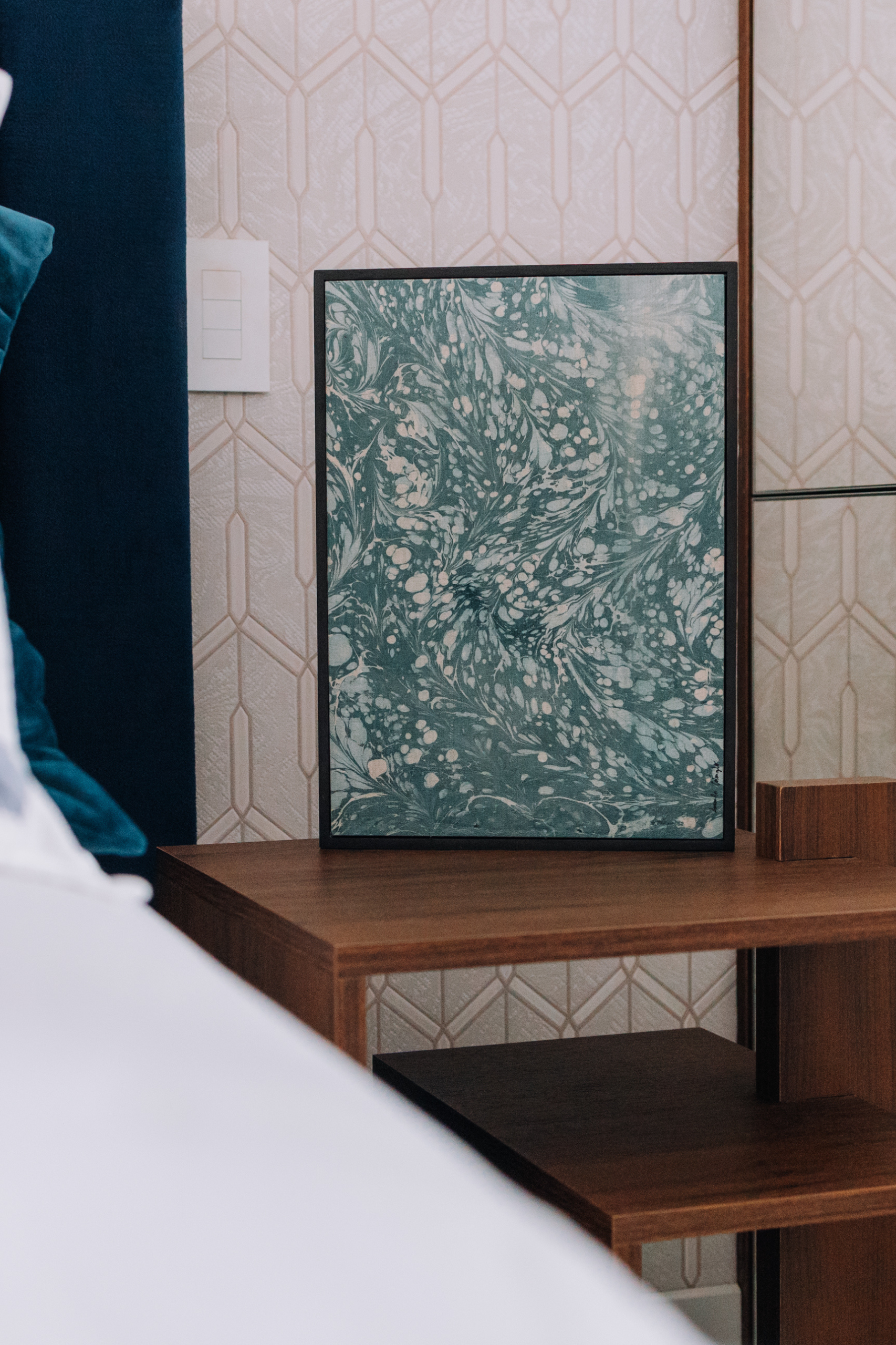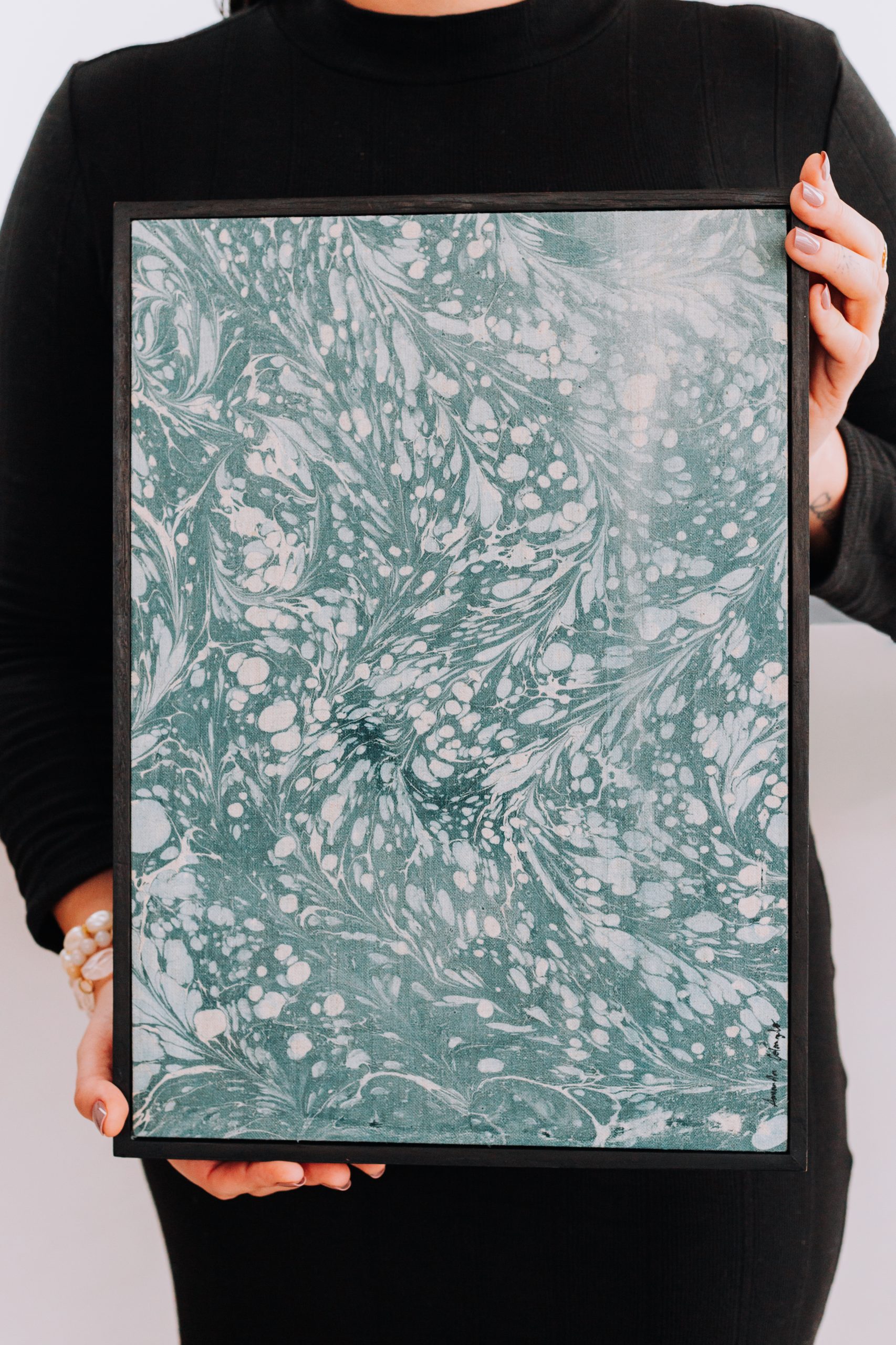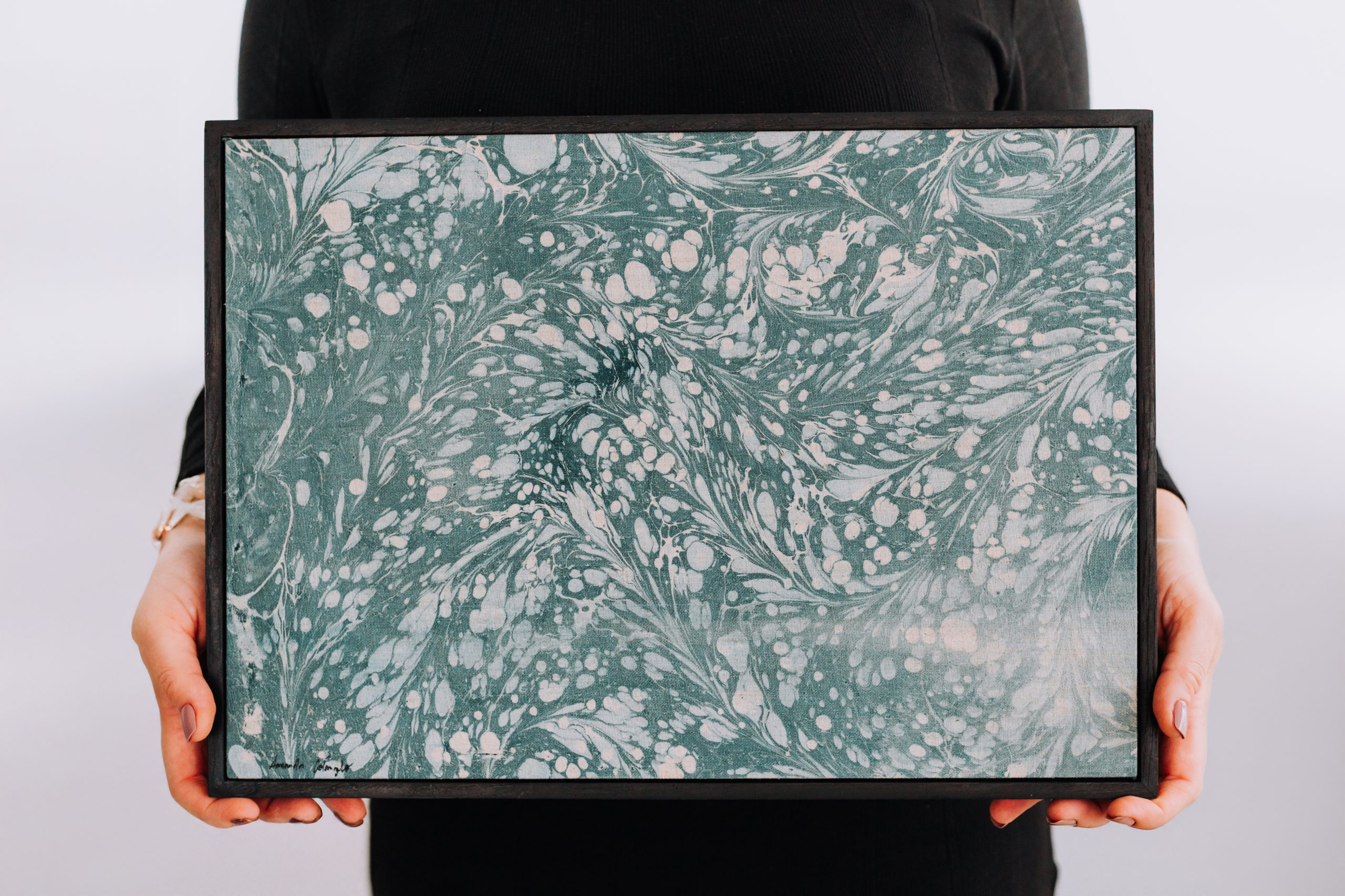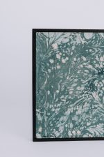 Criada com pigmentos minerais sobre água e aplicada em tela de linho, a obra utiliza a técnica Ebru para formar padrões sutis e etéreos.