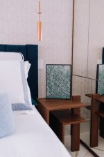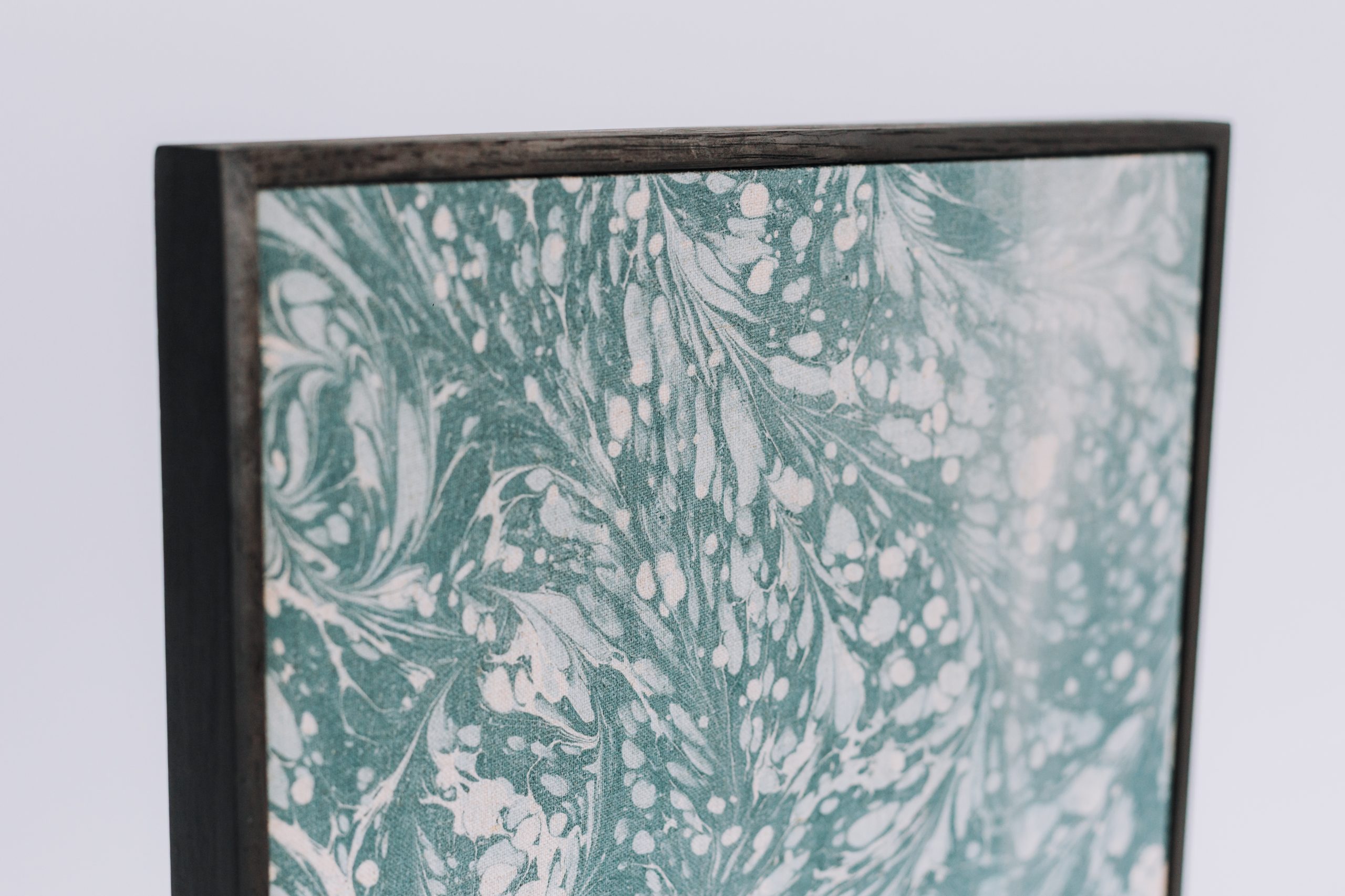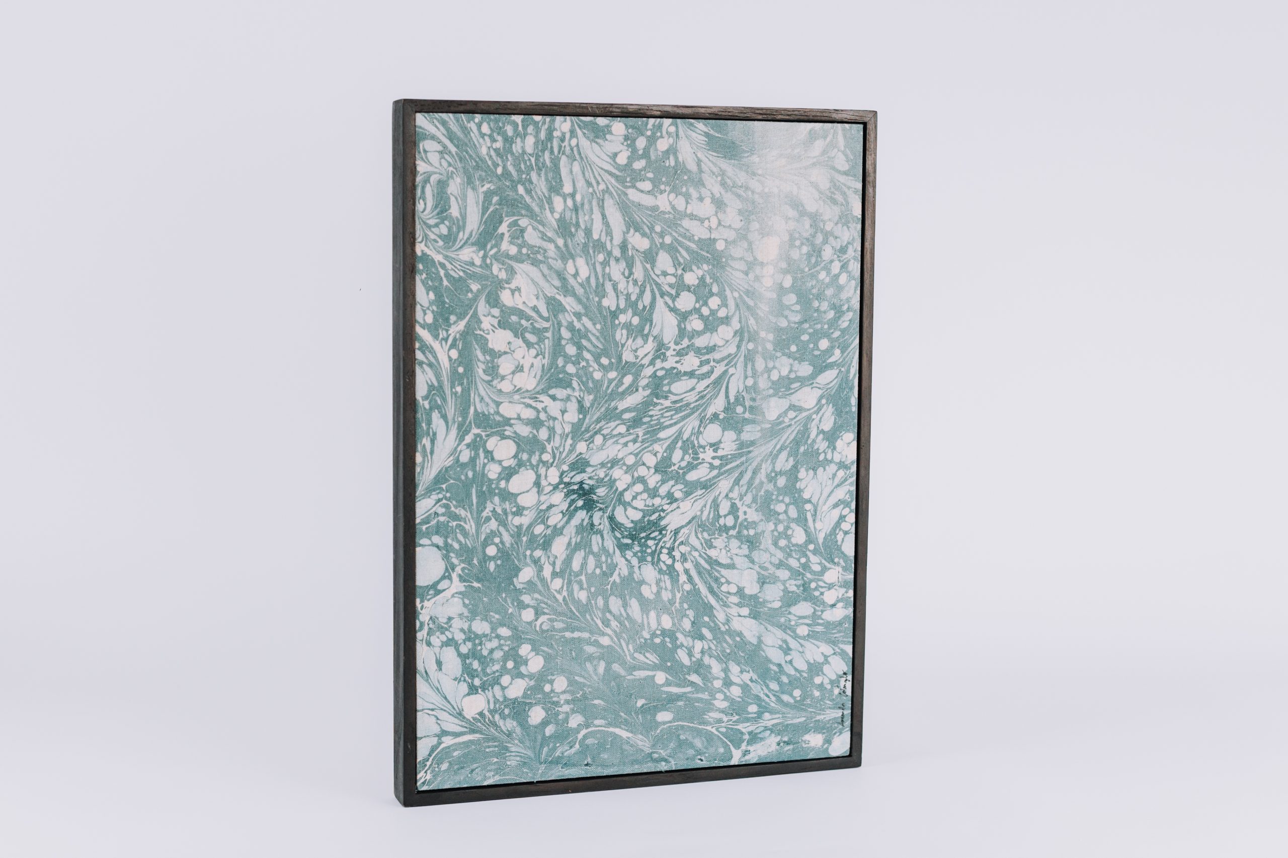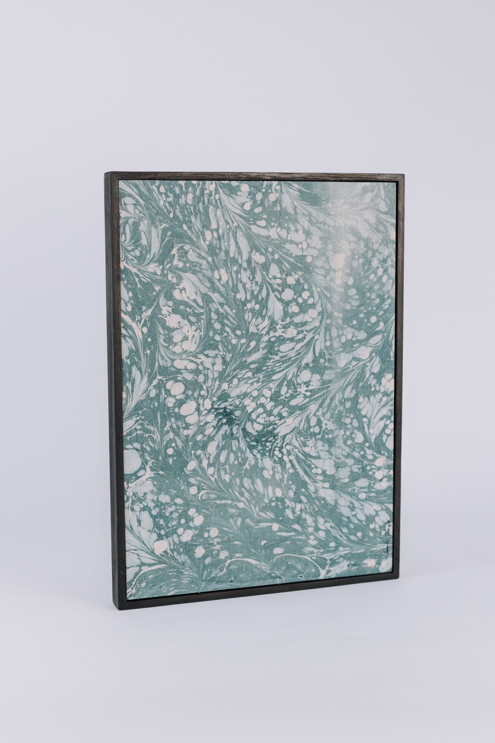 A composição é finalizada com moldura em madeira carvalho ebanizado, que reforça seu contraste e elegância. Com dimensões de 30 x 42 x 3,2 cm, apresenta uma paleta em azul petróleo e off white, destacando a delicadeza dos vazios e das transições de cor.