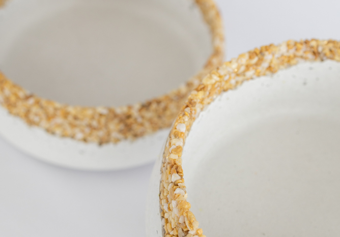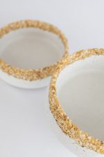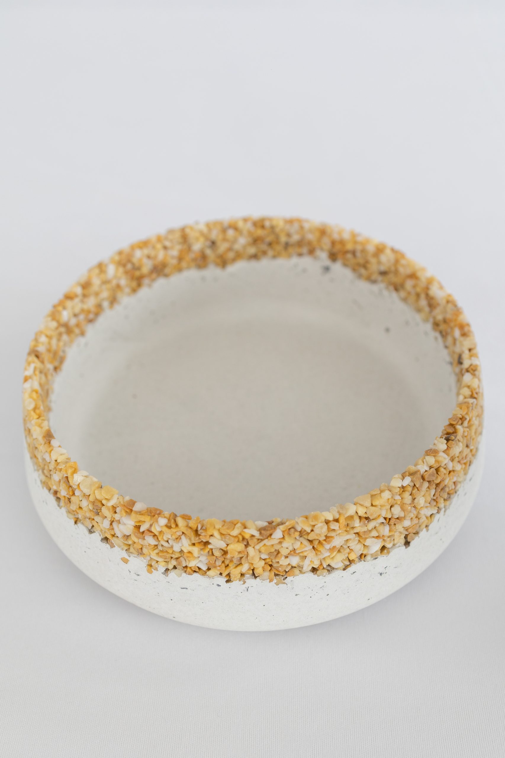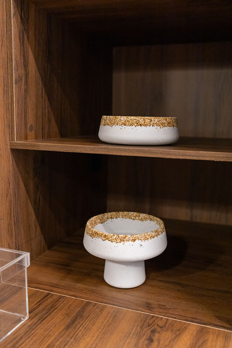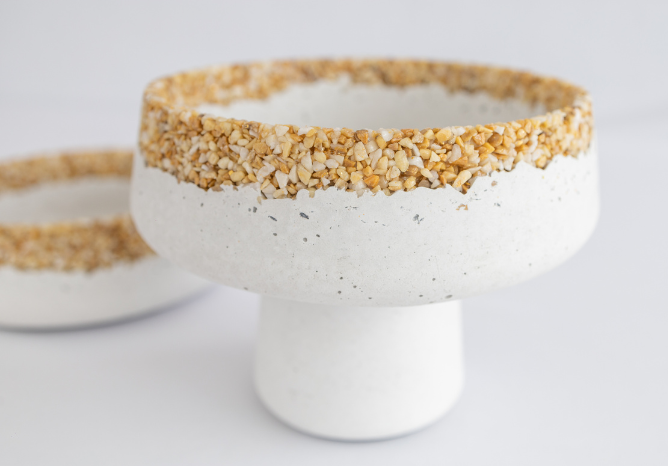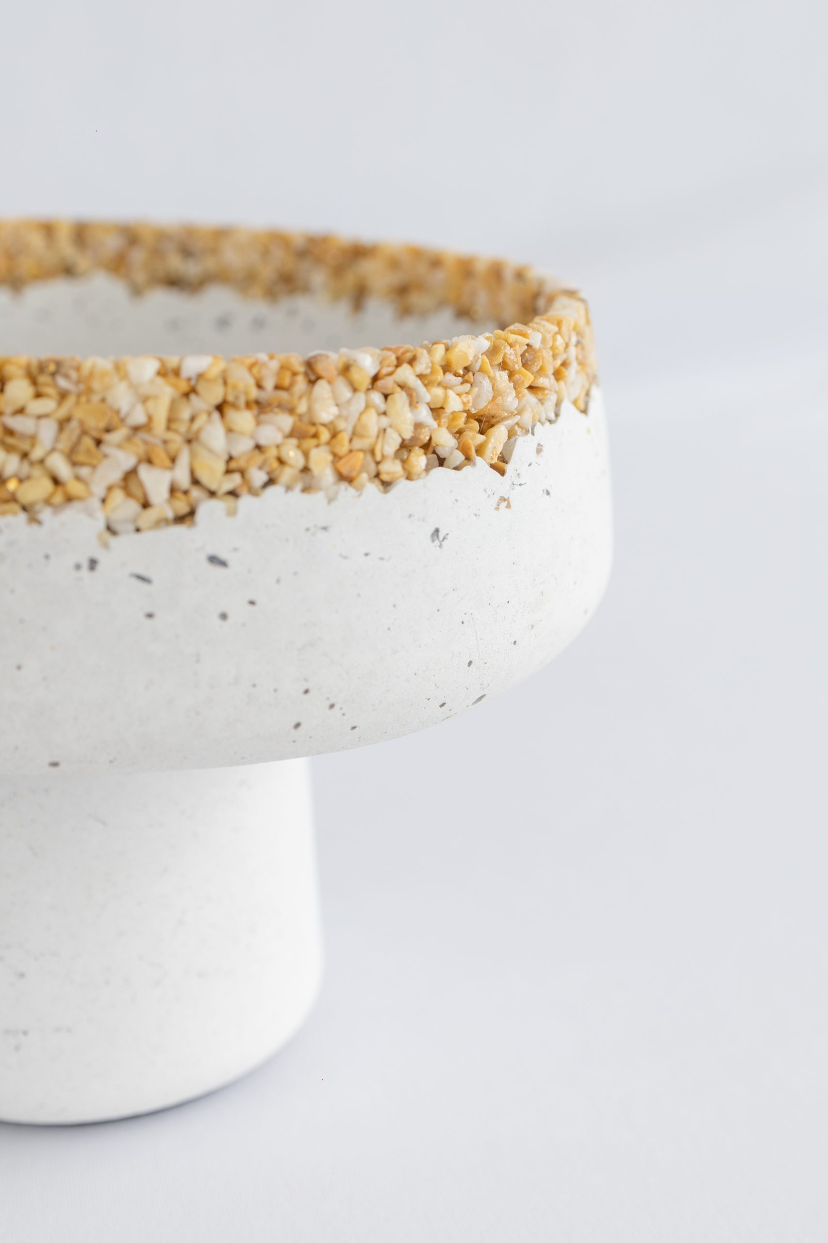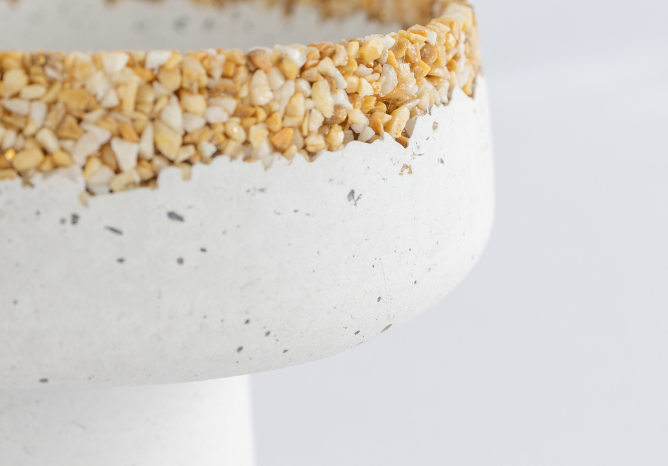 O Bowl Pedestal de Priscila Separovic é uma peça que exala rusticidade e sofisticação, misturando cimento estrutural com pedras douradas e palha para uma expressão única do natural no interior dos lares. A combinação de materiais brutos e brilhantes revela uma versatilidade singular: ele pode acolher plantas, organizar pequenos objetos ou até ser usado como uma peça de servir.