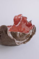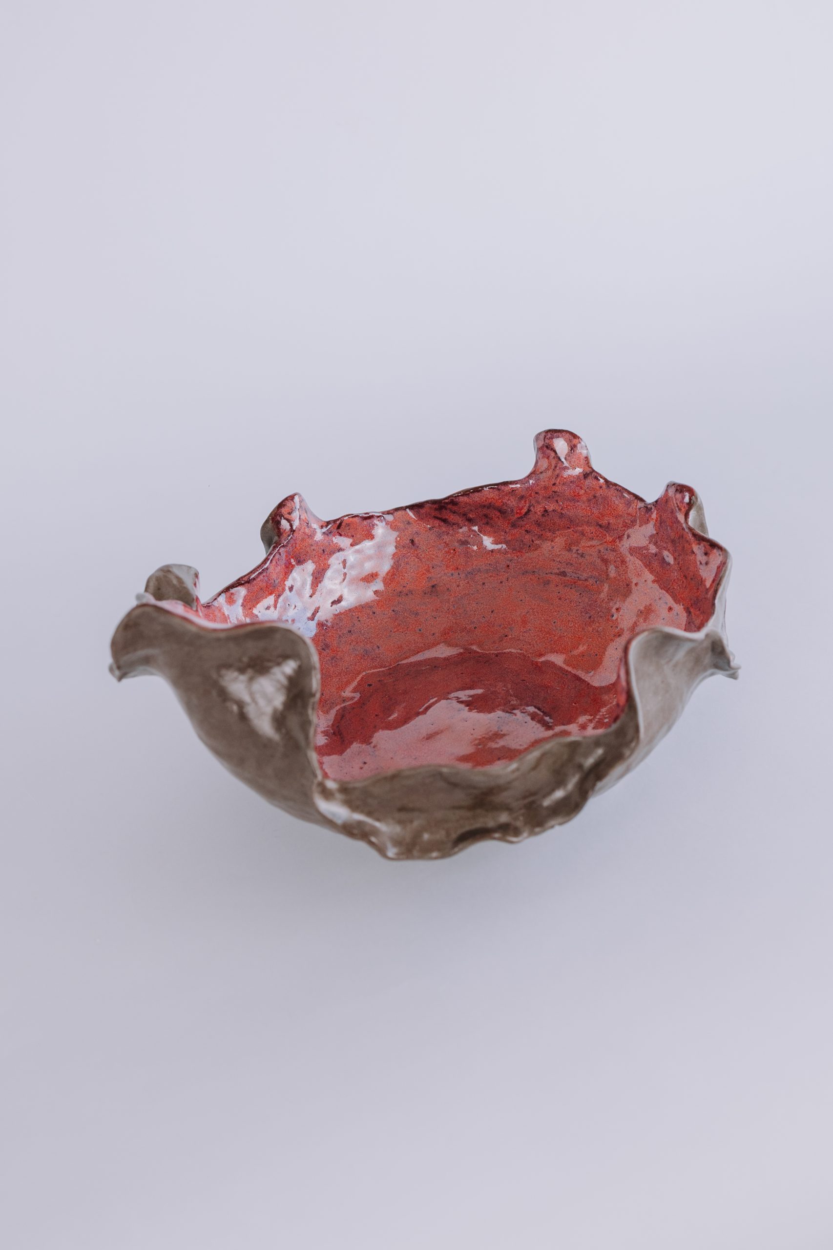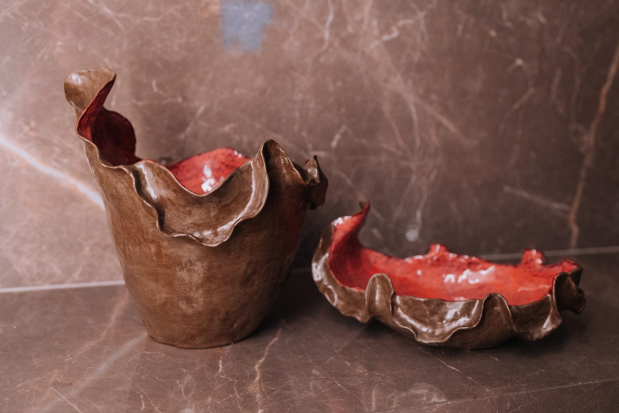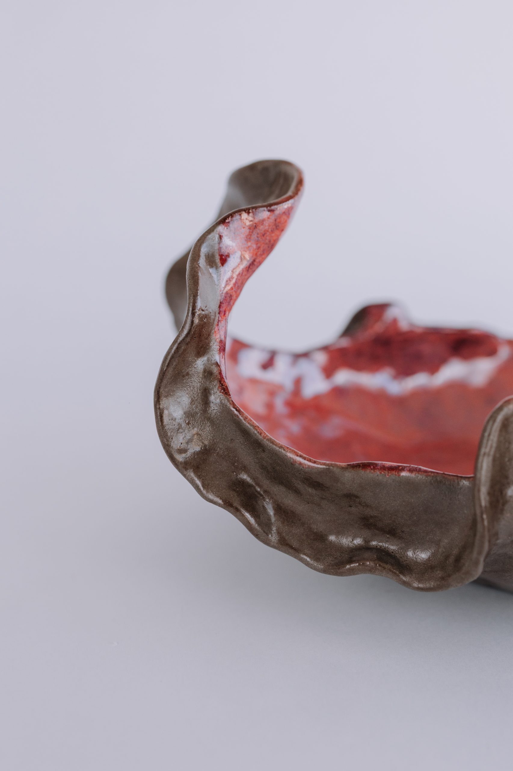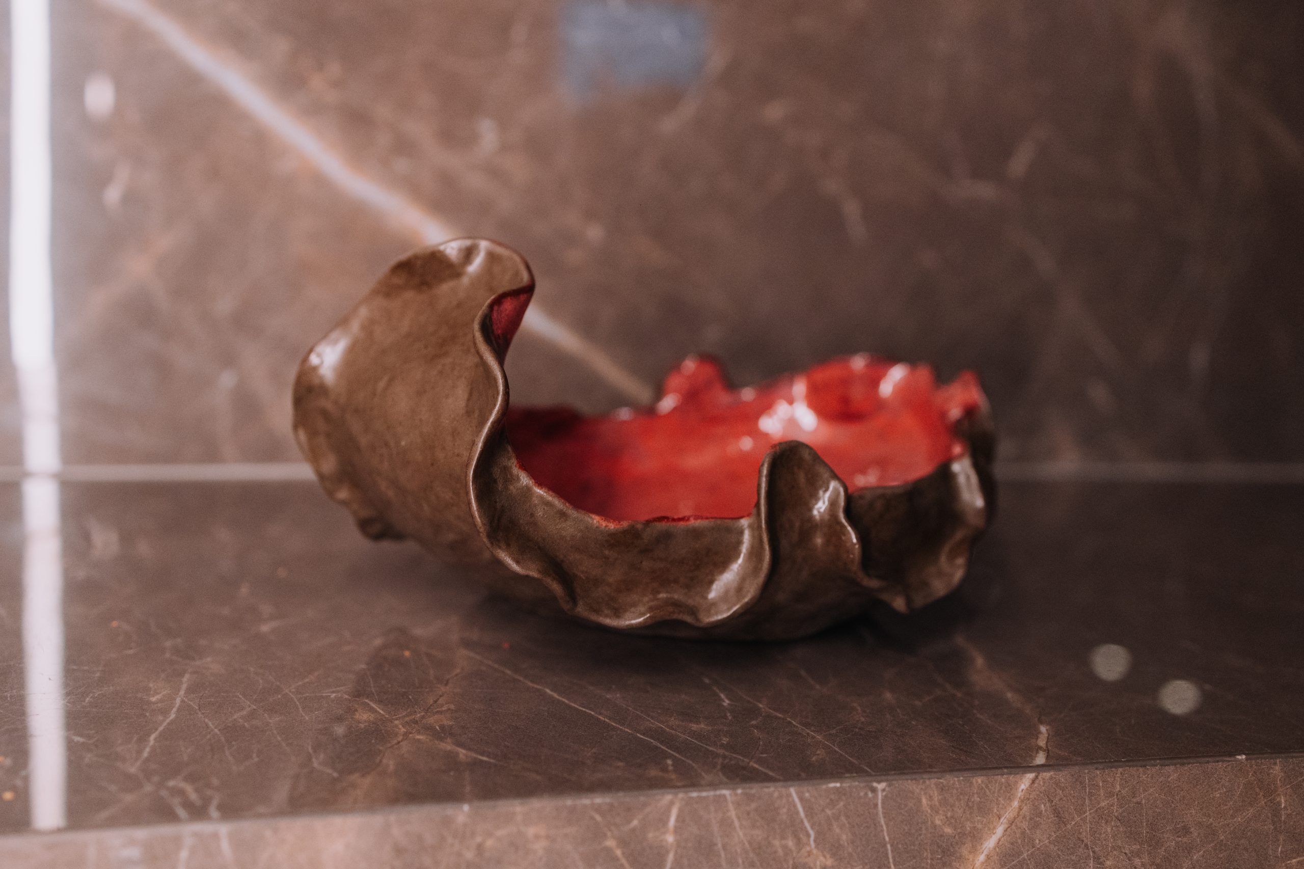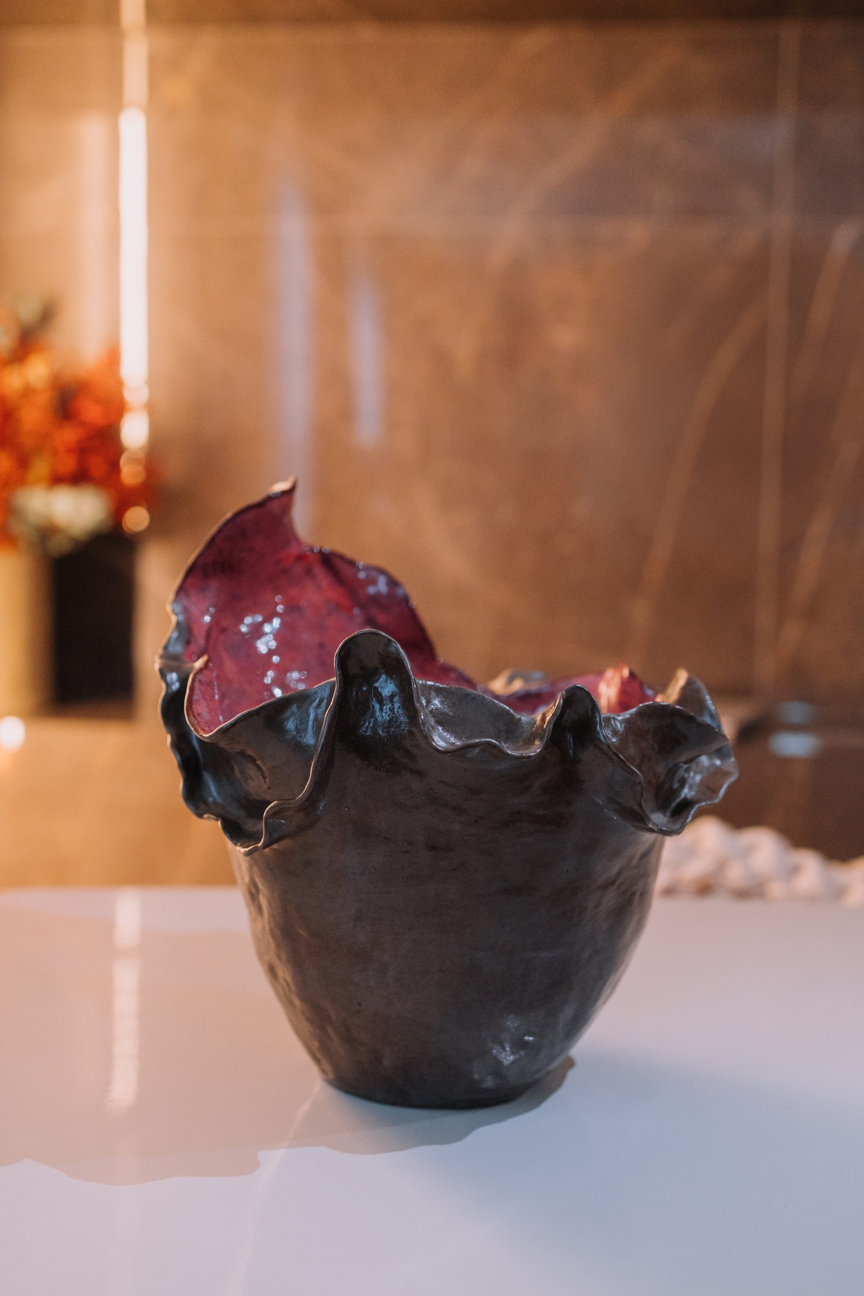 Modelada com argila de alta qualidade, a peça apresenta acabamento em esmalte nas tonalidades preto grafite e sangria, resultando em um contraste sofisticado entre profundidade e intensidade.