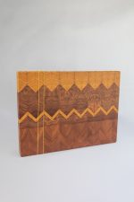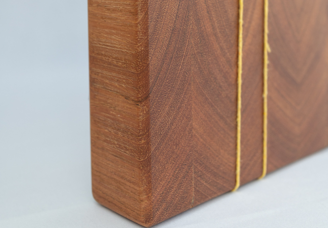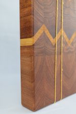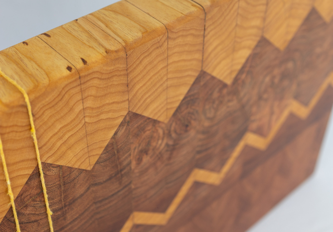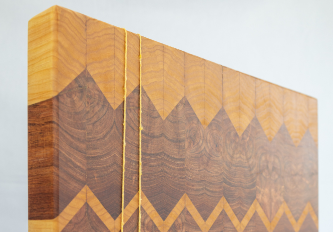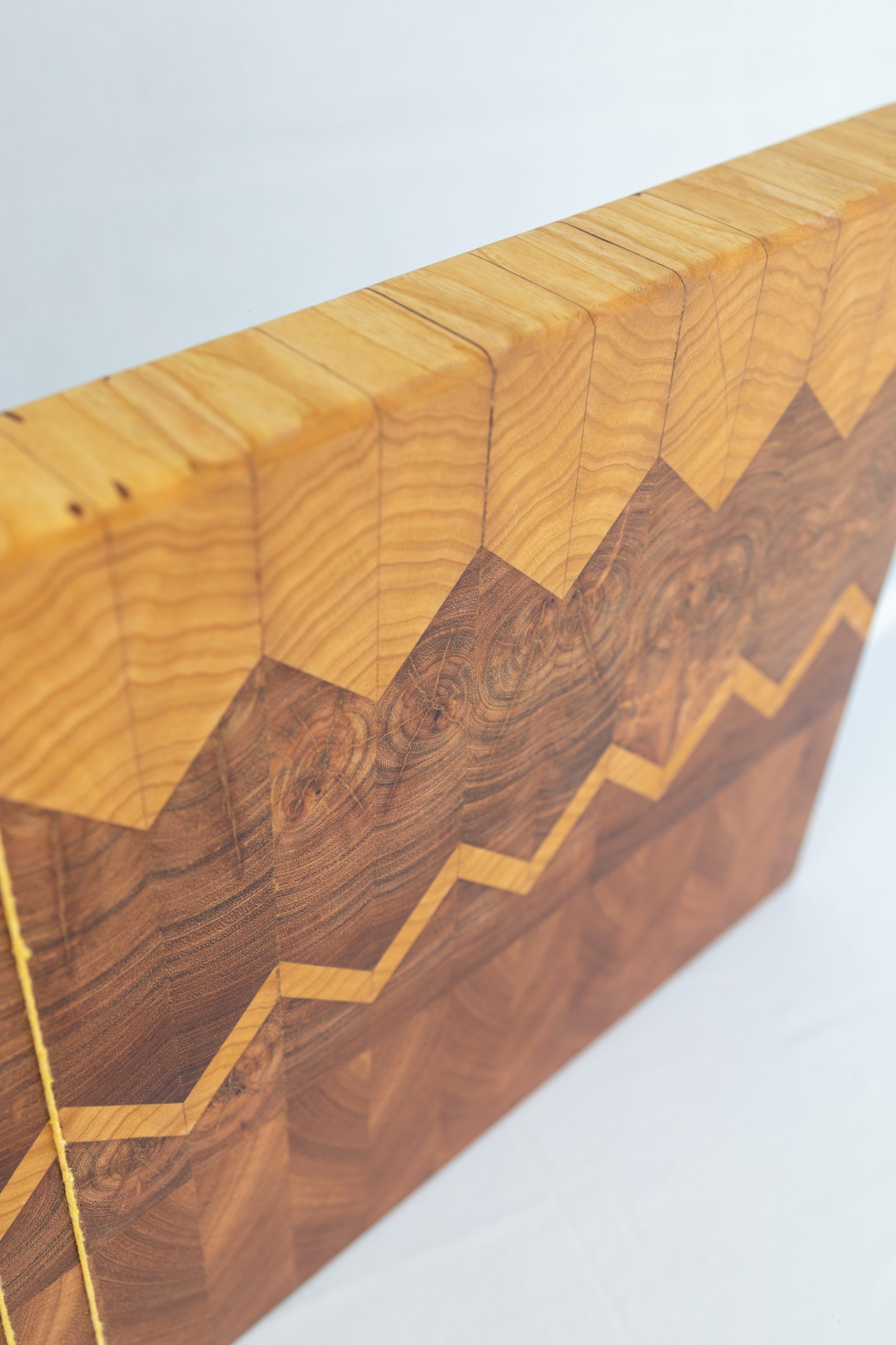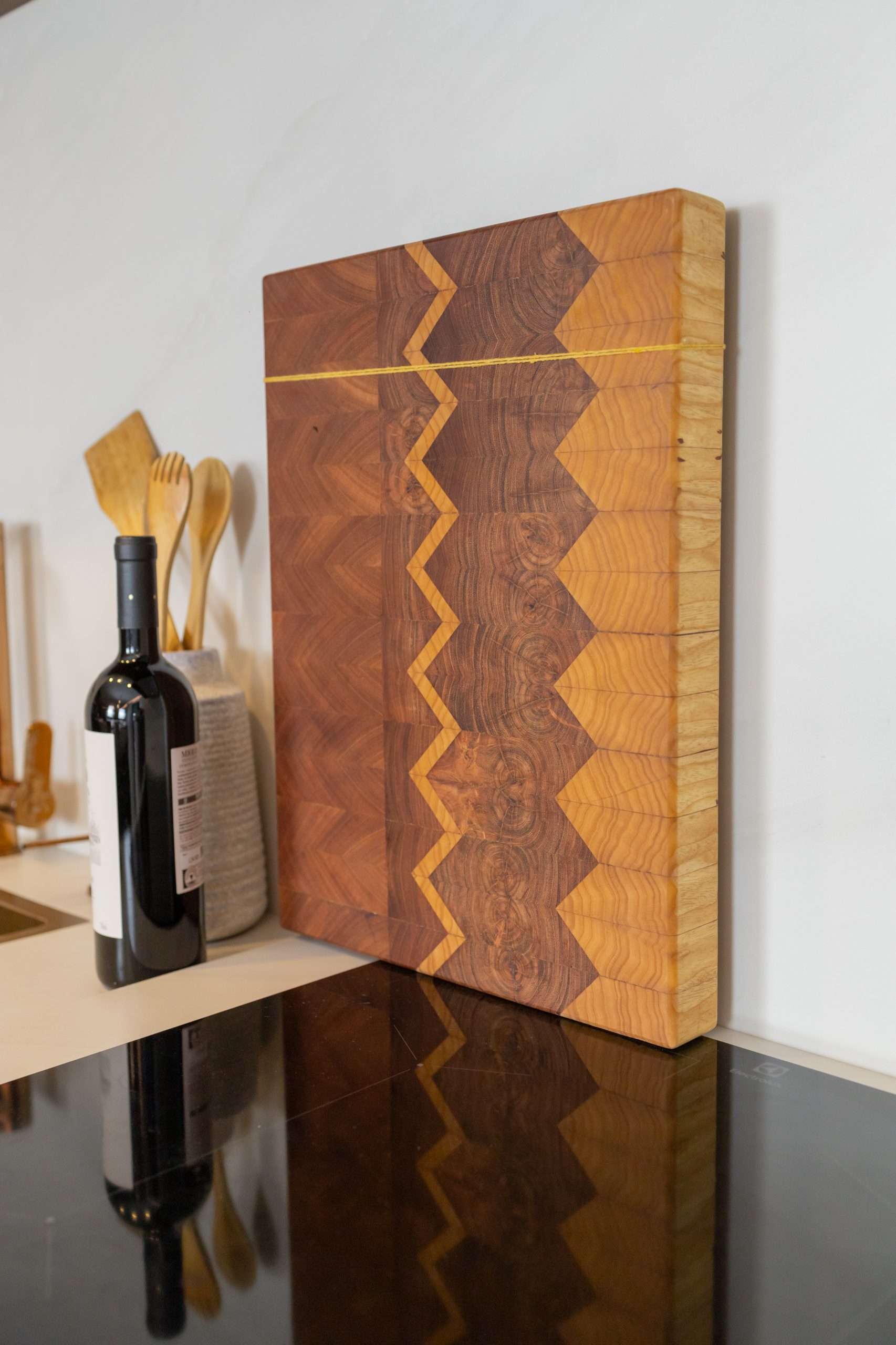 Antonio, com um olhar atento aos detalhes e a técnica end grain, compôs uma peça que não apenas exibe as nuances da madeira, mas sugere que essas linhas e texturas estão ali para nos contar histórias e, talvez, até nos observar de volta. Os veios marcam um ritmo, revelando camadas da natureza e de suas marcas escondidas. **Zig Zag** é um testemunho das voltas e reviravoltas que percorremos, onde cada fio e linha contêm memórias, força e a beleza de algo que é ao mesmo tempo simples e complexo, pronto para ser sentido e vivido em cada uso.