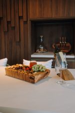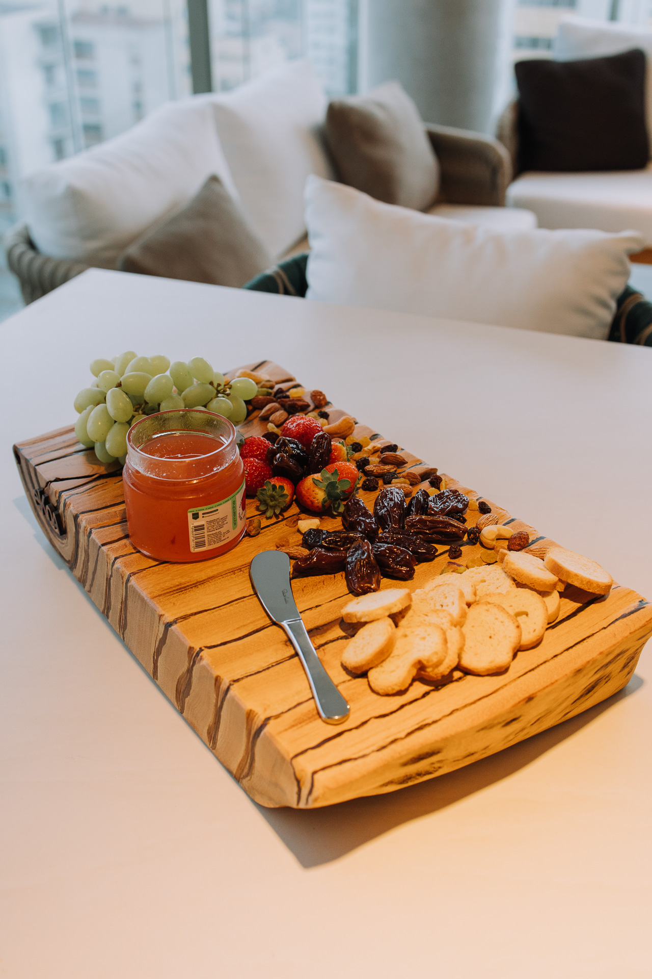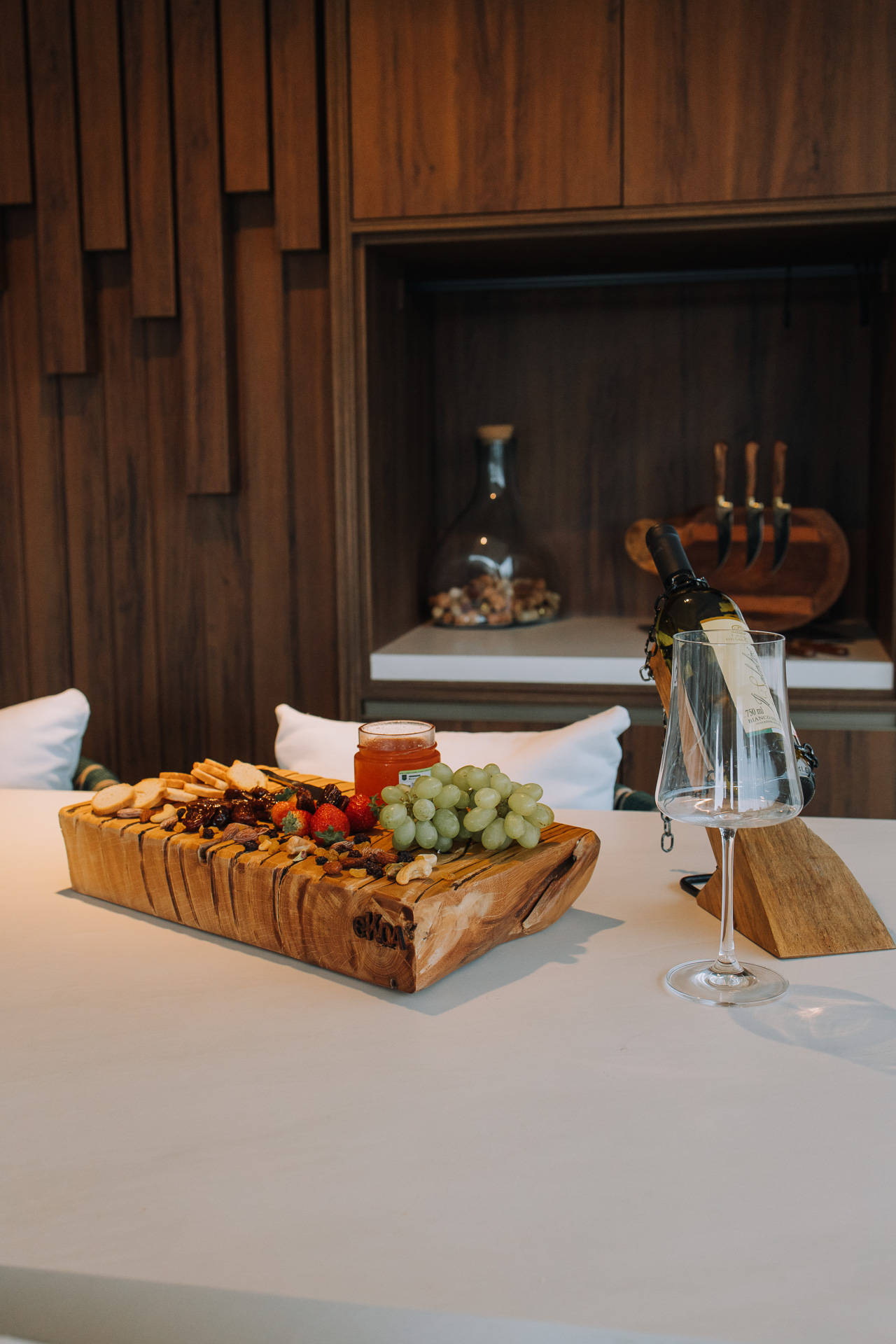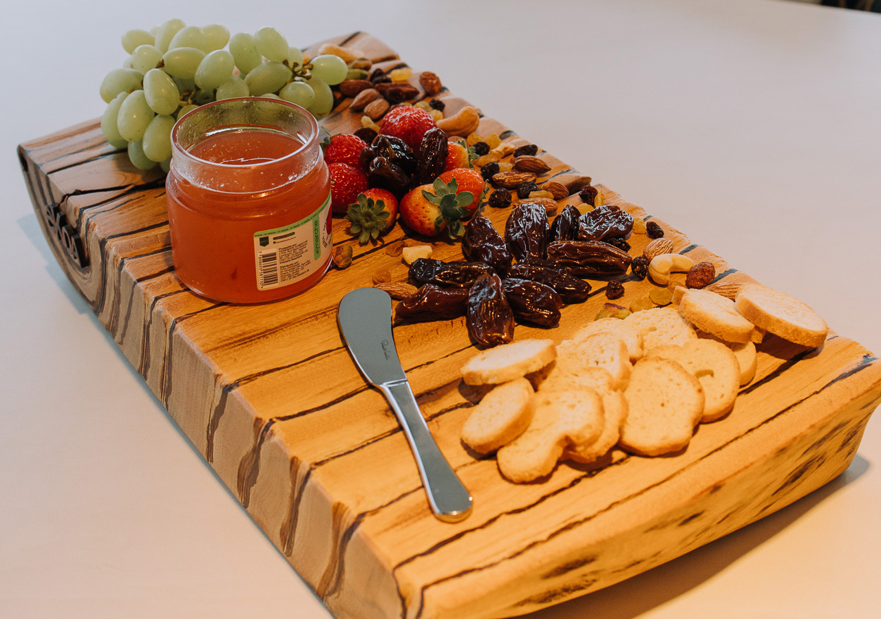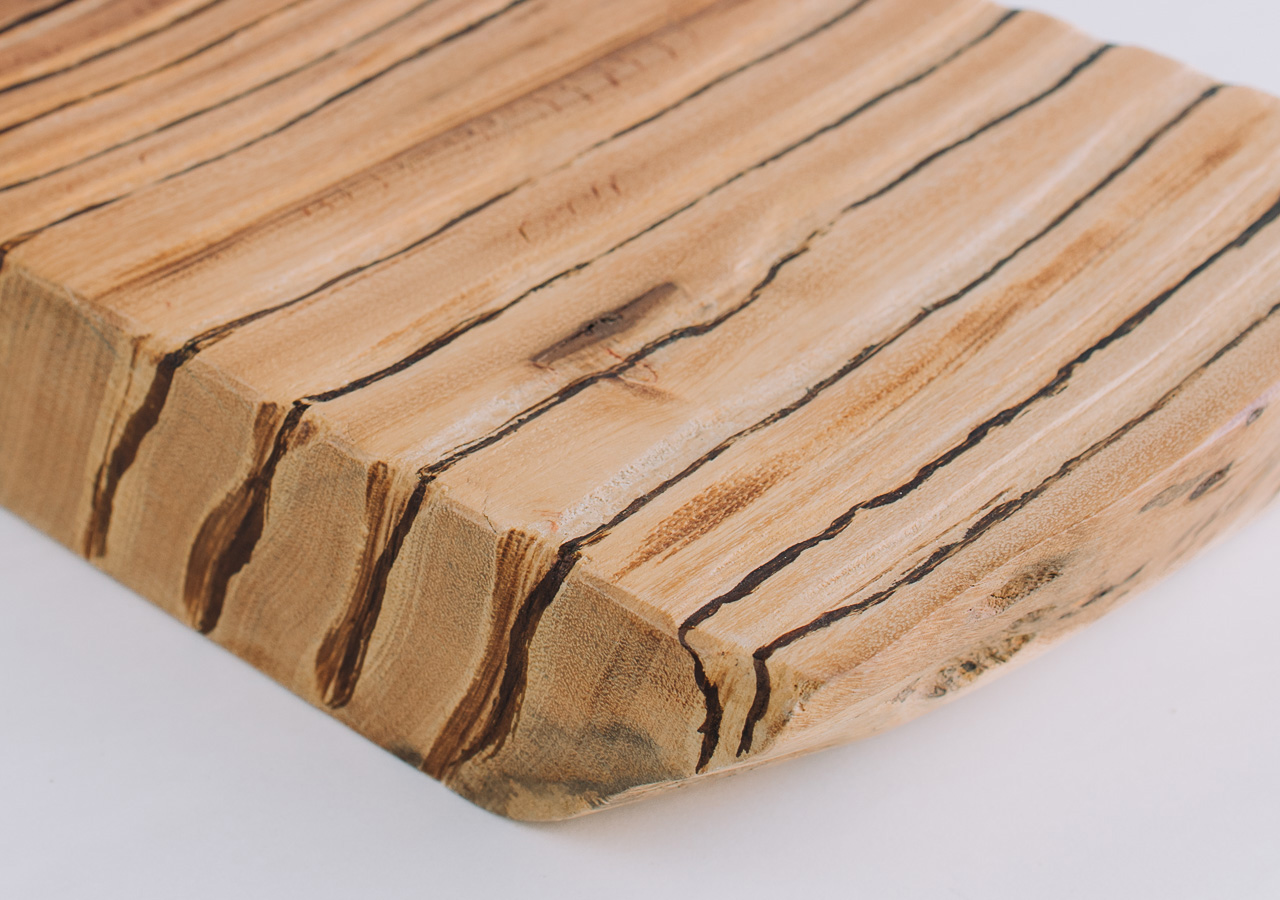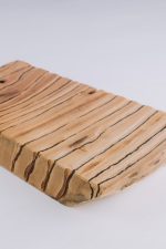 A madeira maciça de Pequiá, com seus tons de amarelo pardo e veios marcantes, inspirou a criação de Anajás, uma tábua de servir que combina robustez e elegância.