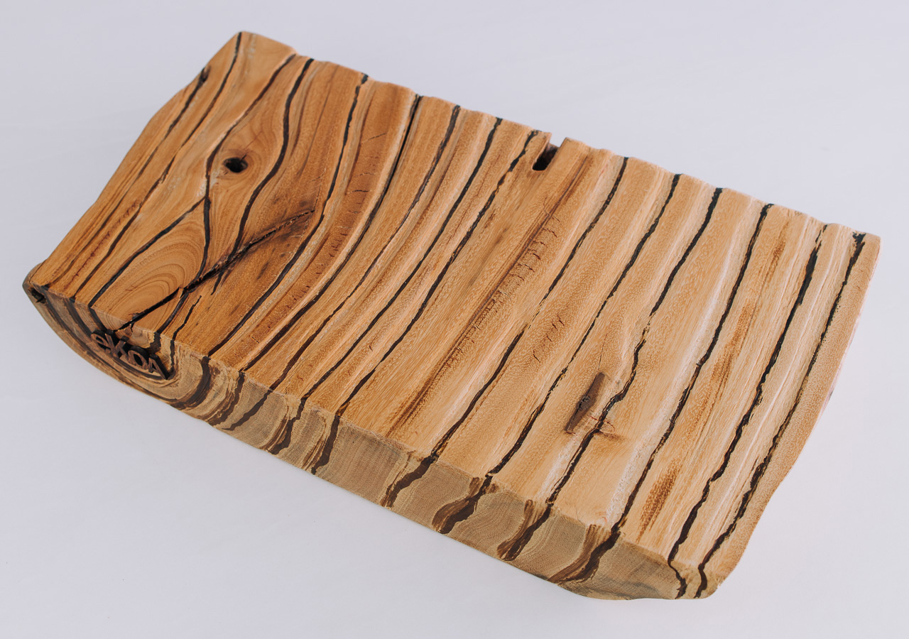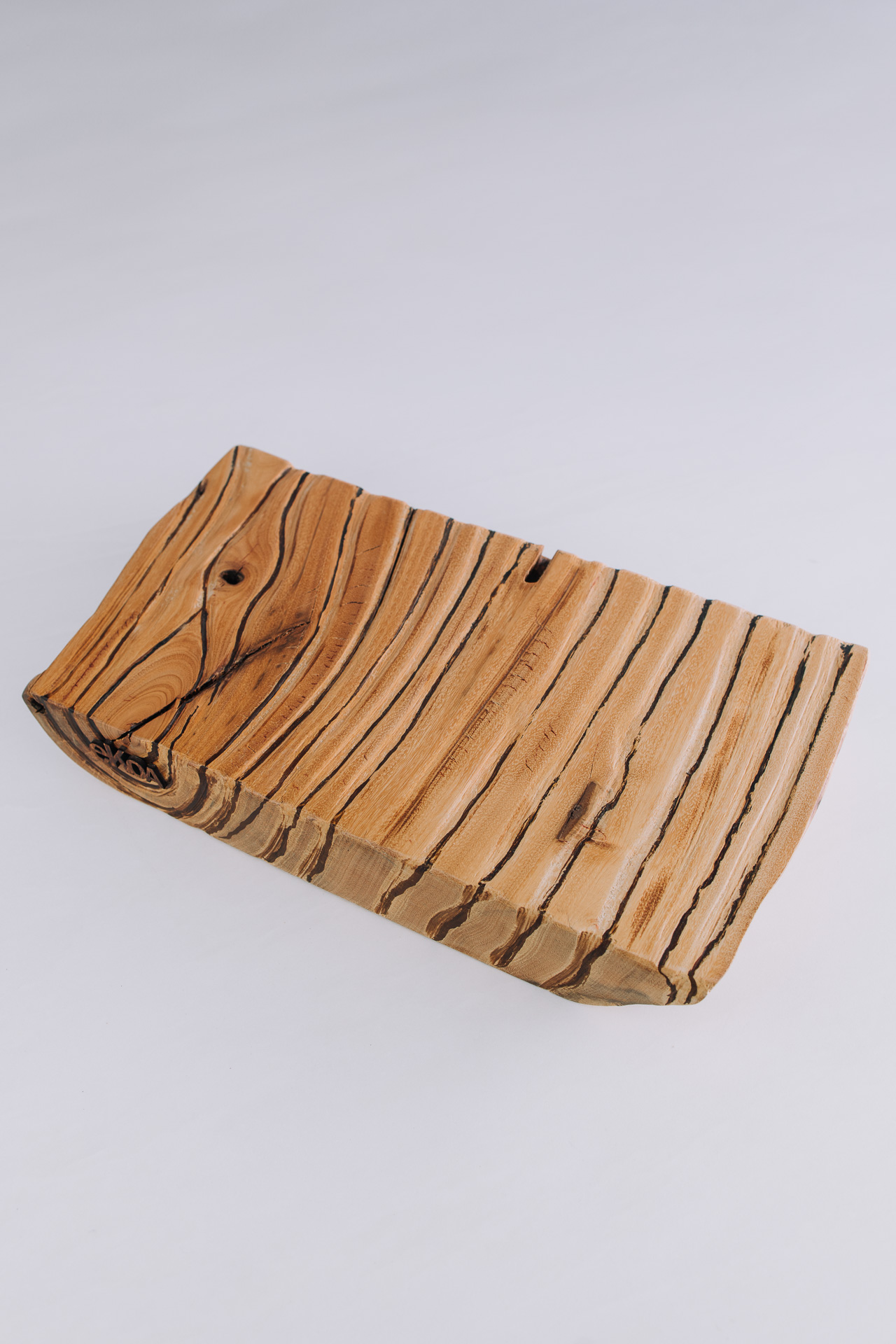 Esculpida à mão, sua forma valoriza a beleza natural das pranchas de Pequiá, transformando o que antes era matéria-prima em um objeto funcional e sofisticado.