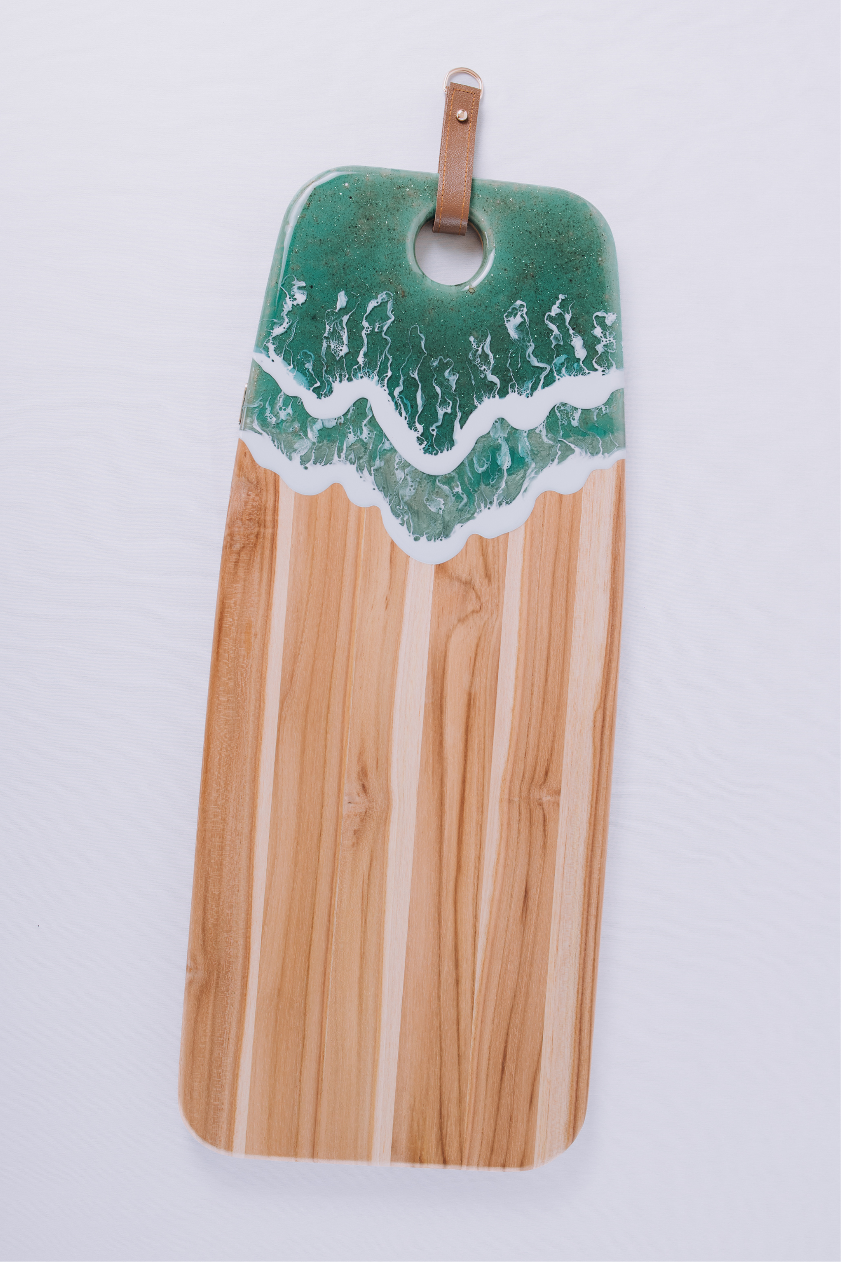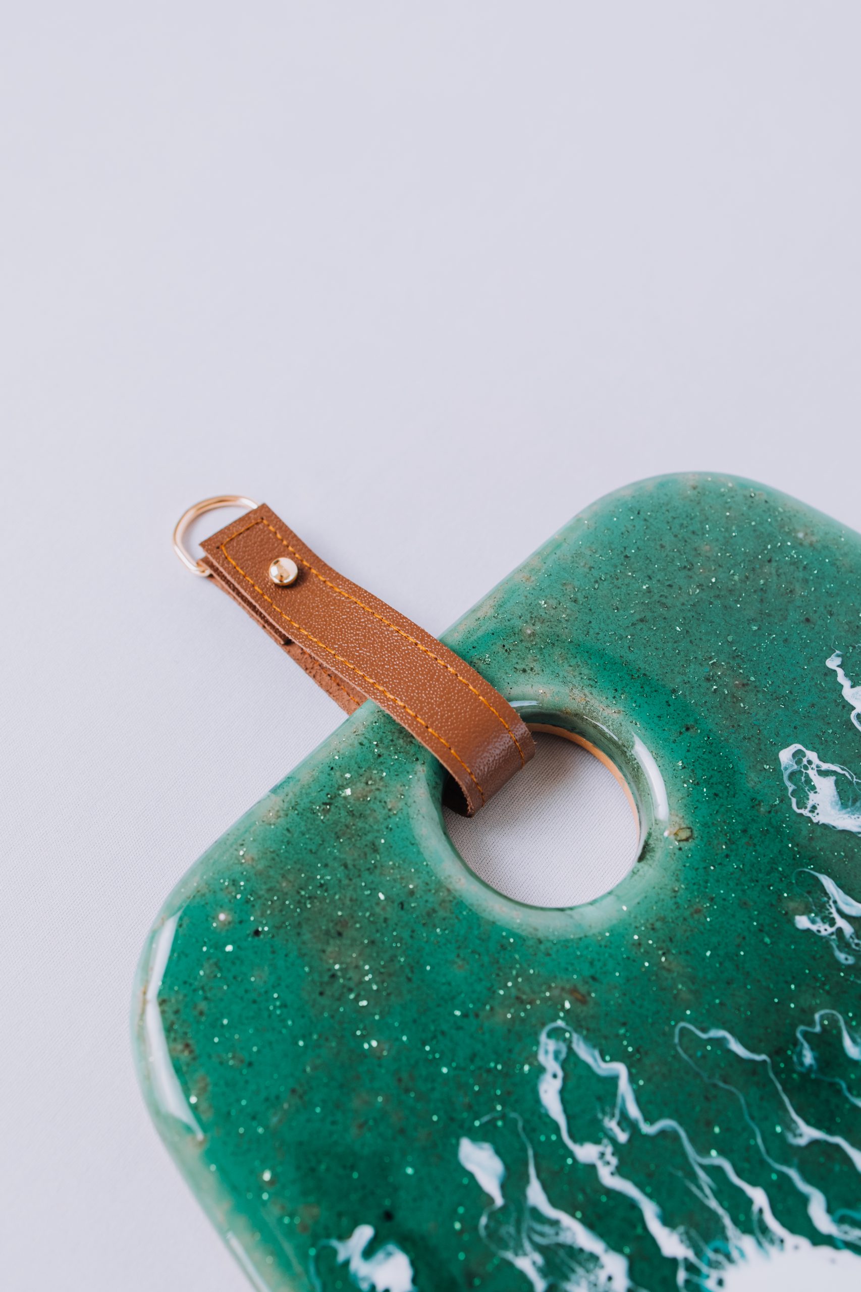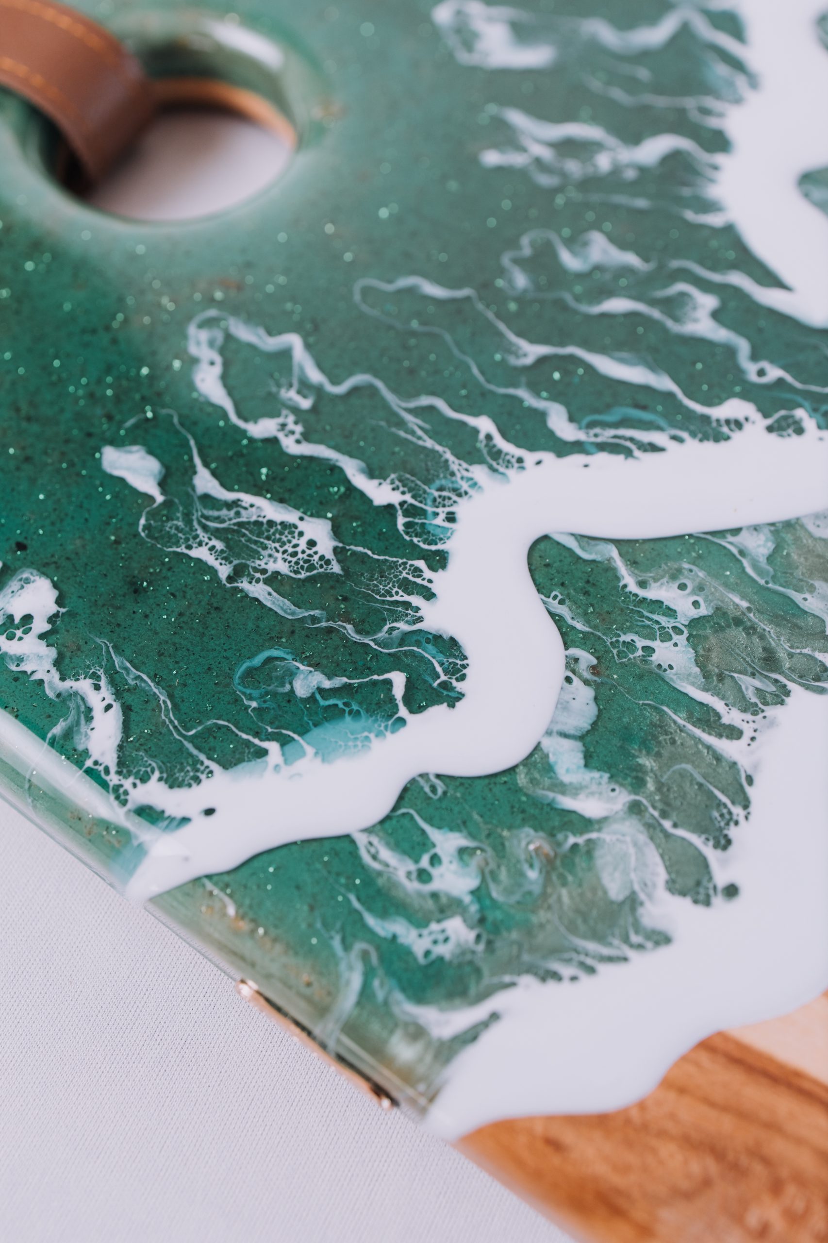 Hoje, Luciana se dedica às criações em madeira, bambu e resina epóxi. Materiais que, em suas mãos, deixam de ser comuns e tornam-se telas de pintura onde as cores ganham movimento, profundidade e poesia. Suas peças transitam entre o abstrato e o realismo, evocando, por exemplo, a fluidez do mar em composições que unem beleza e funcionalidade. São tábuas, objetos decorativos e utilitários que transformam a mesa posta em uma experiência sensorial e estética.