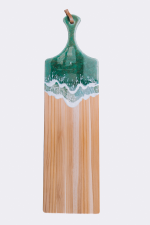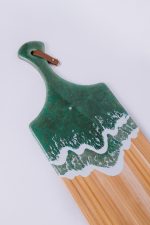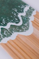 Hoje, Luciana se dedica às criações em madeira, bambu e resina epóxi. Materiais que, em suas mãos, deixam de ser comuns e tornam-se telas de pintura onde as cores ganham movimento, profundidade e poesia. Suas peças transitam entre o abstrato e o realismo, evocando, por exemplo, a fluidez do mar em composições que unem beleza e funcionalidade. São tábuas, objetos decorativos e utilitários que transformam a mesa posta em uma experiência sensorial e estética.