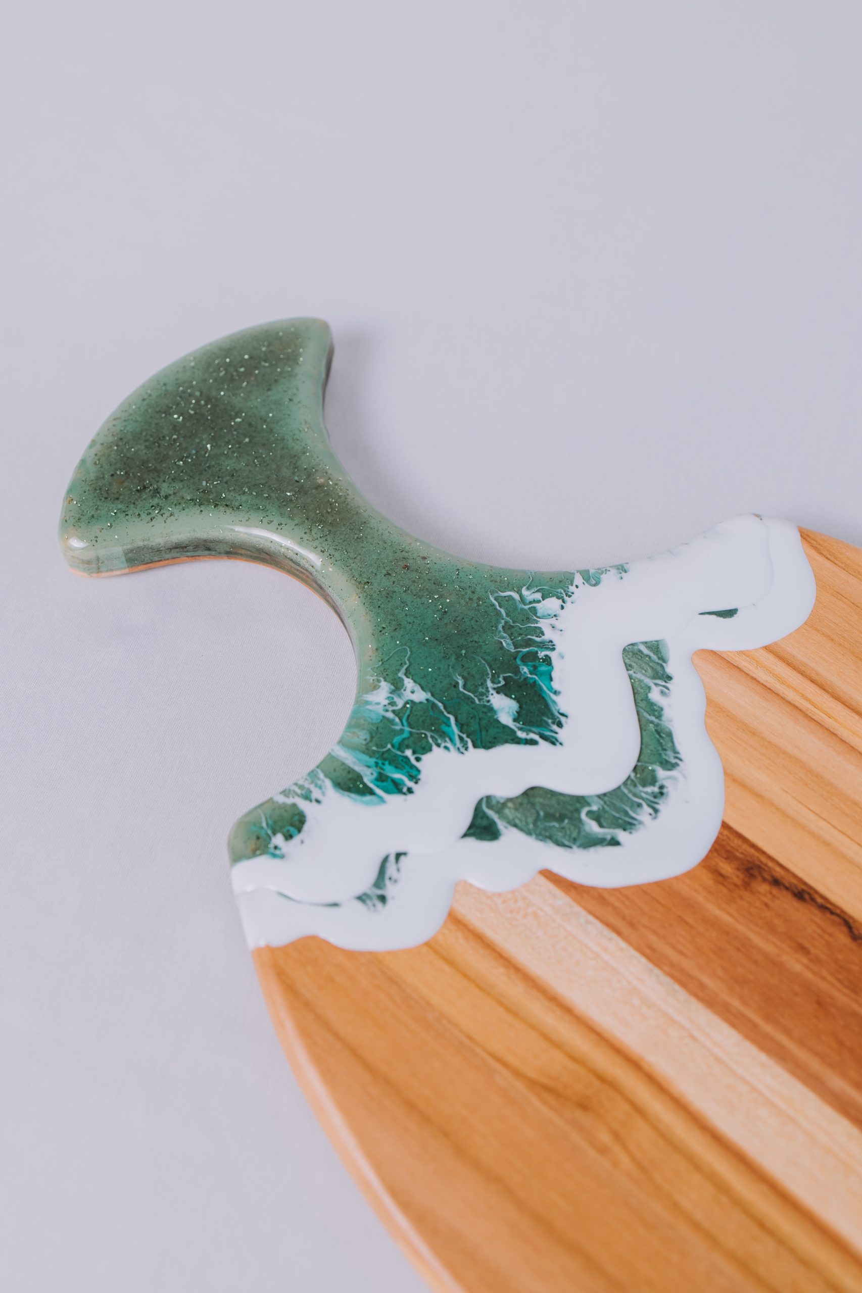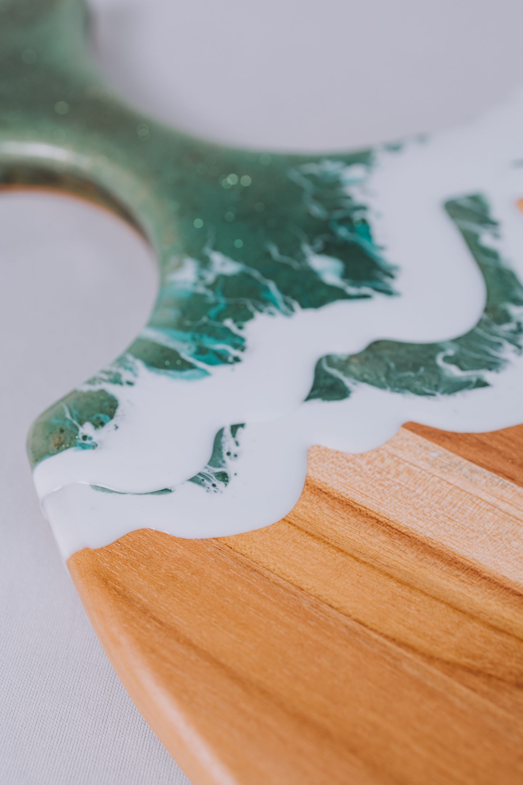 Hoje, Luciana se dedica às criações em madeira, bambu e resina epóxi. Materiais que, em suas mãos, deixam de ser comuns e tornam-se telas de pintura onde as cores ganham movimento, profundidade e poesia. Suas peças transitam entre o abstrato e o realismo, evocando, por exemplo, a fluidez do mar em composições que unem beleza e funcionalidade. São tábuas, objetos decorativos e utilitários que transformam a mesa posta em uma experiência sensorial e estética.