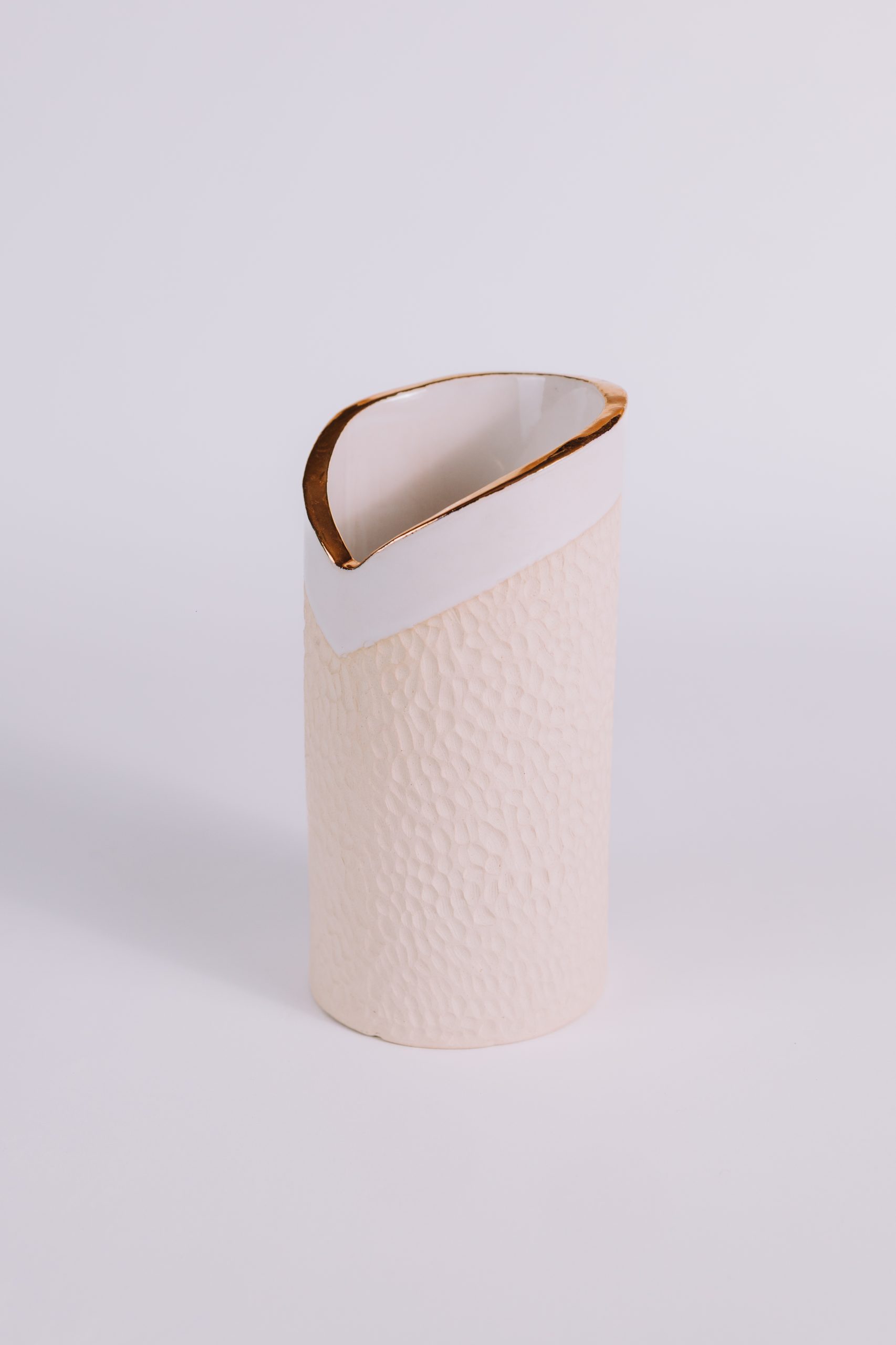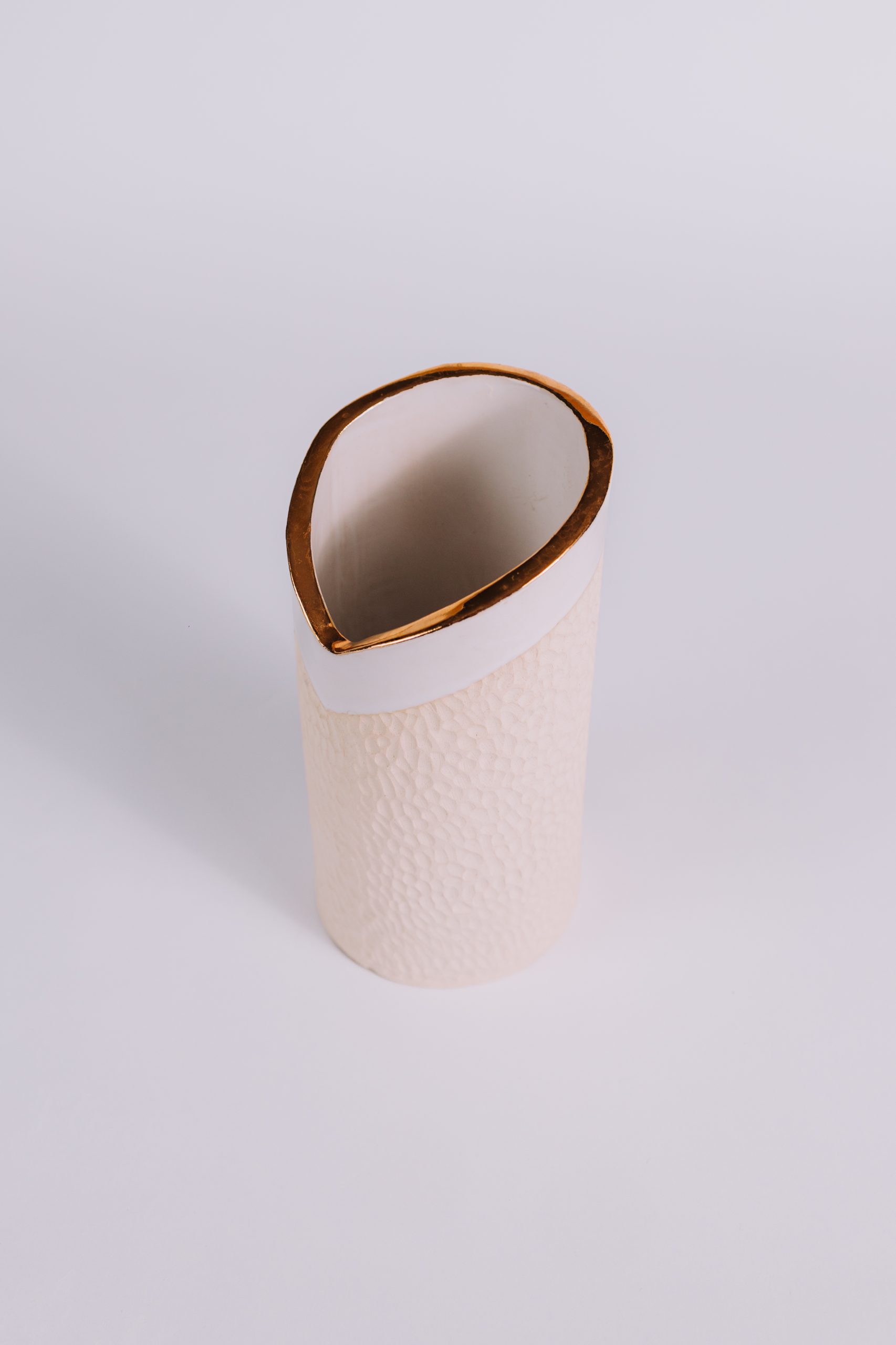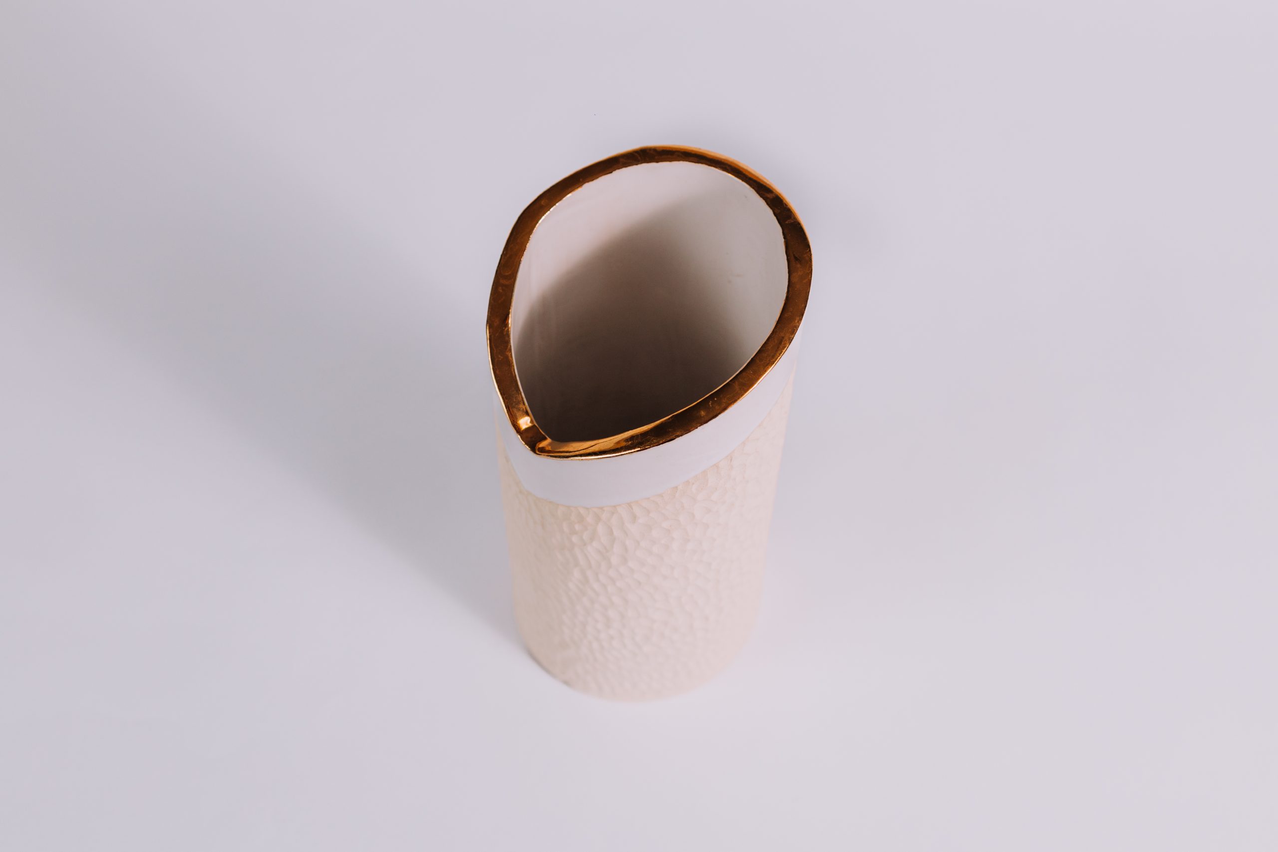 Assim como seu par da mesma linha, este vaso é moldado em paperclay e queimado a 1240oC, alcançando a nobreza do grés. O interior esmaltado em branco maiólica recebe delicada aplicação de ouro líquido, que adiciona sofisticação e brilho sutil. No exterior, a argila natural sem esmalte, com textura esculpida à mão, revela autenticidade e caráter artesanal.