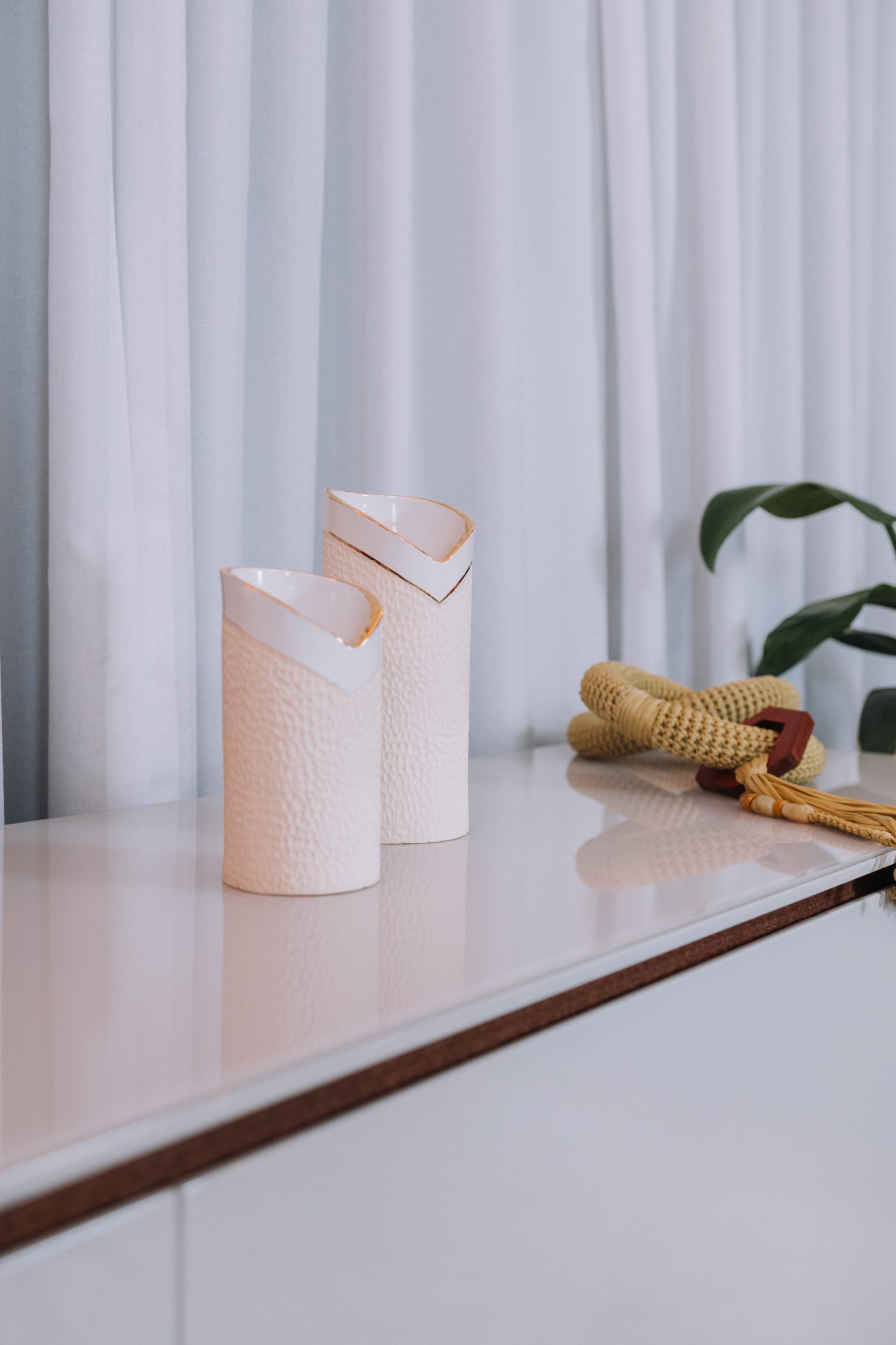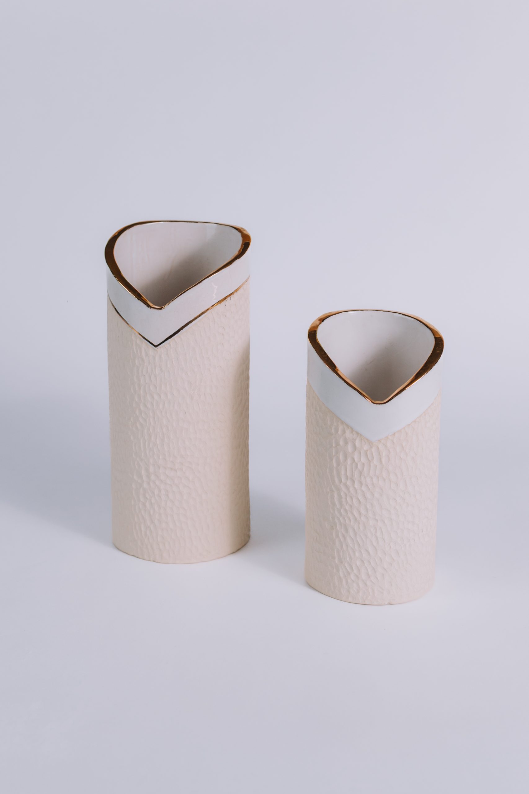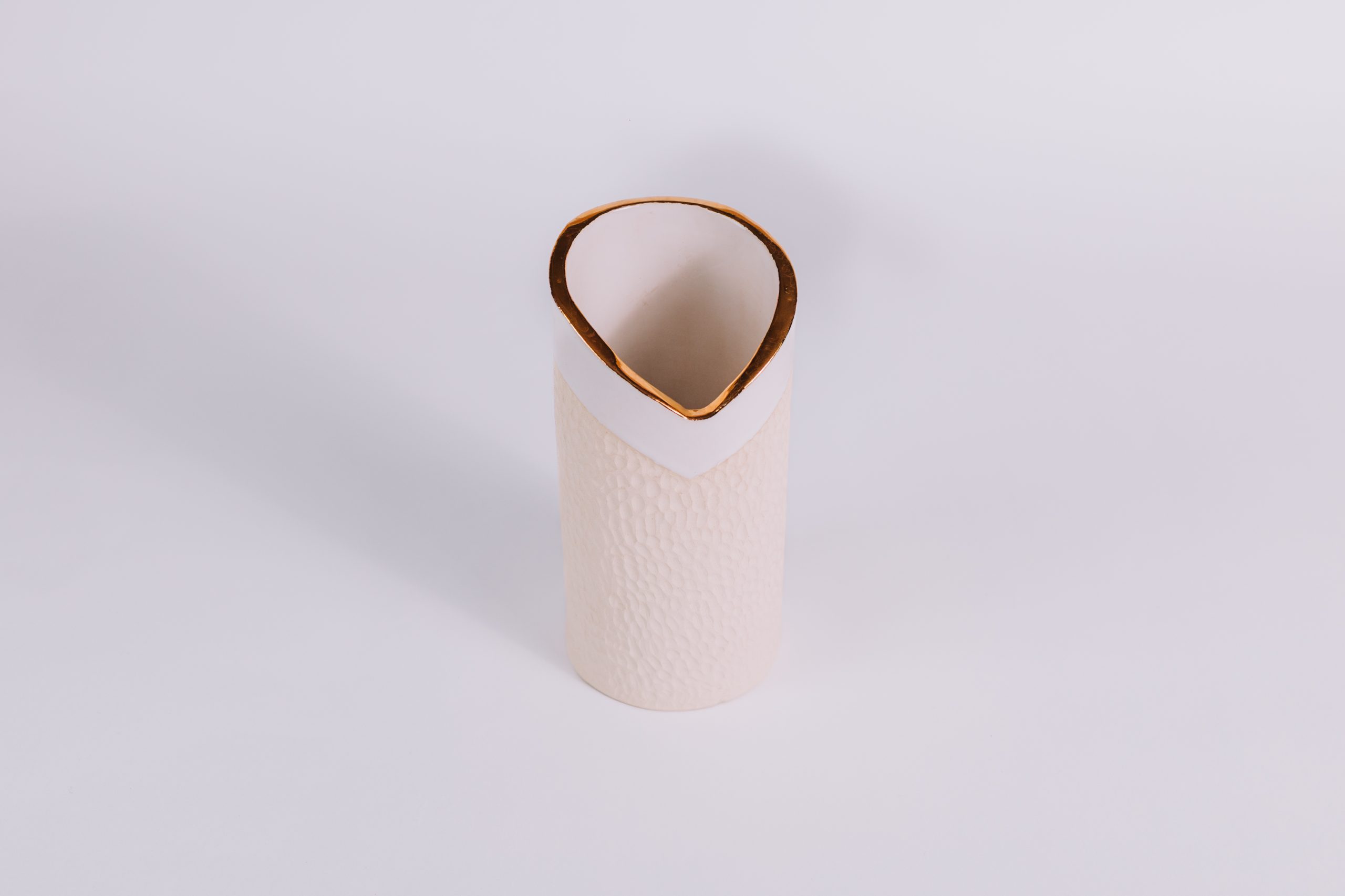 Assim como seu par da mesma linha, este vaso é moldado em paperclay e queimado a 1240oC, alcançando a nobreza do grés. O interior esmaltado em branco maiólica recebe delicada aplicação de ouro líquido, que adiciona sofisticação e brilho sutil. No exterior, a argila natural sem esmalte, com textura esculpida à mão, revela autenticidade e caráter artesanal.