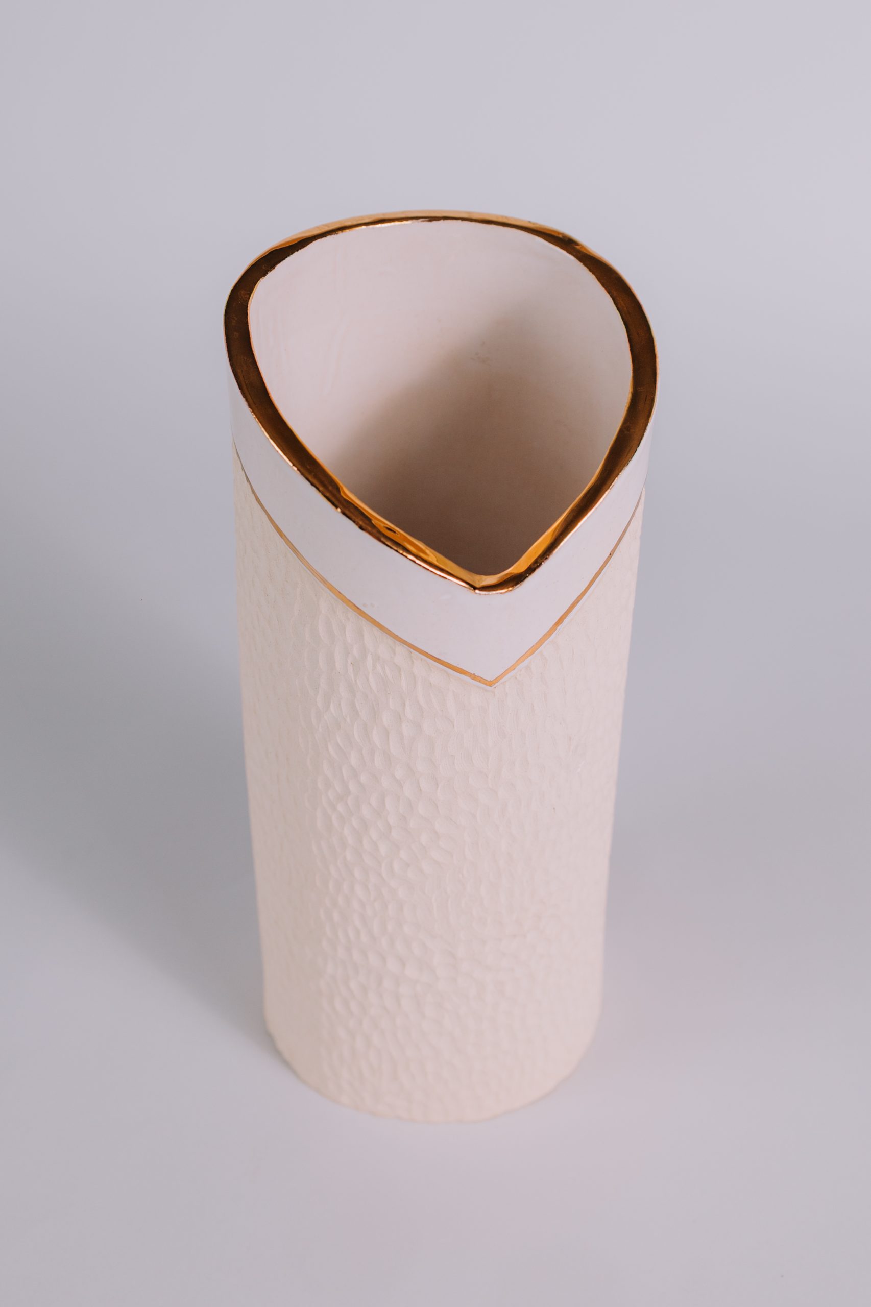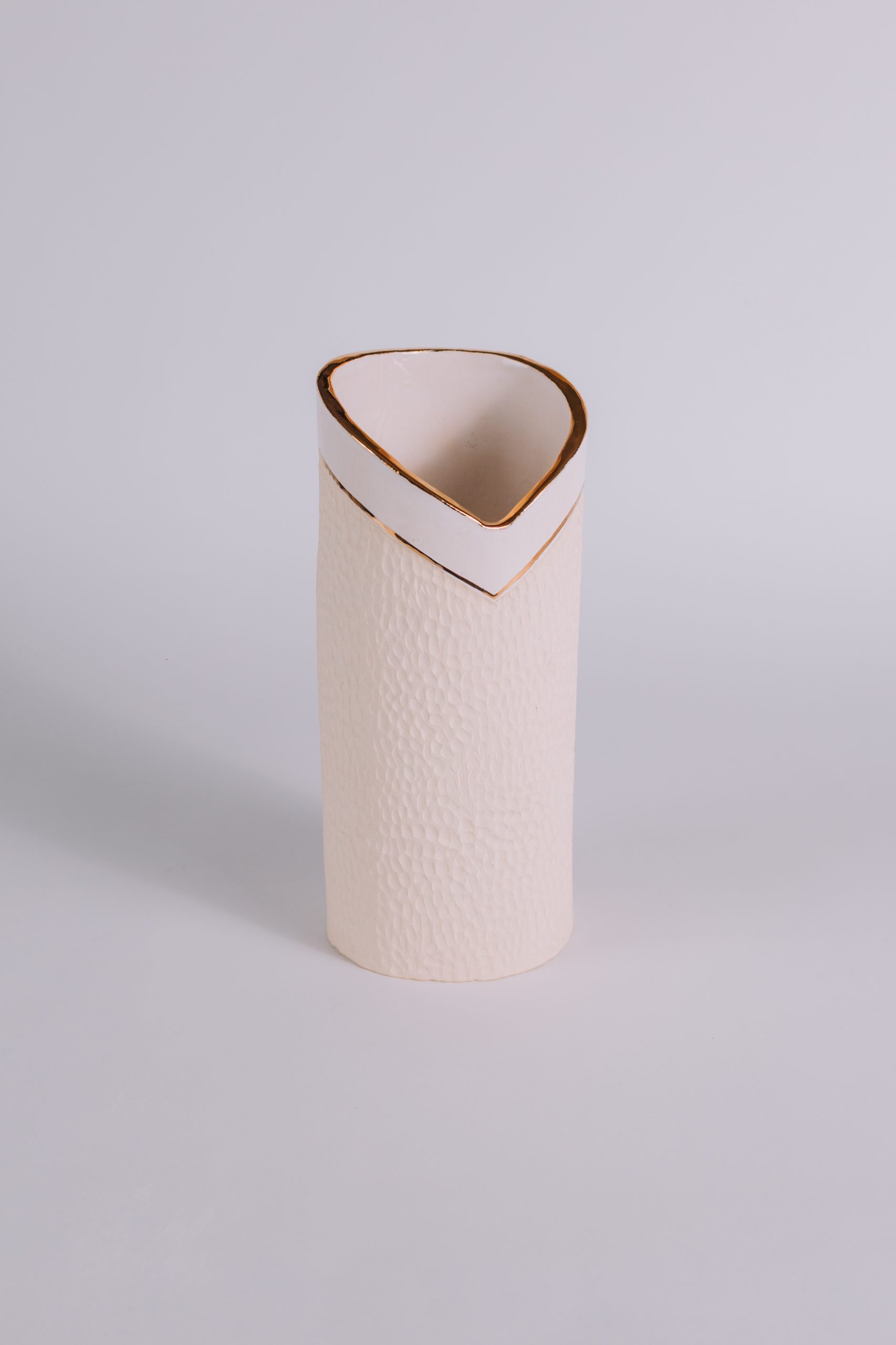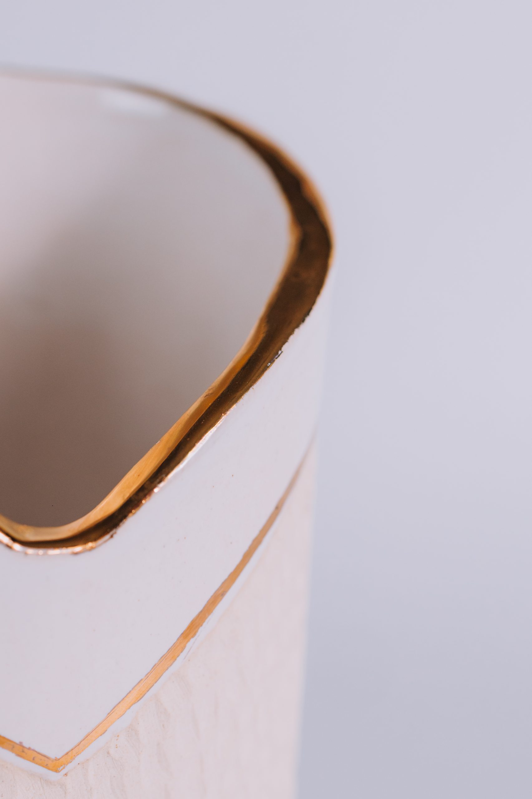 Modelado em paperclay e queimado a 1240oC, este vaso atinge a nobreza do grés, revelando resistência e elegância em cada detalhe. O interior esmaltado em branco maiólica, com delicada aplicação de ouro líquido, traz um brilho refinado que contrasta com o corpo externo em argila natural, onde a textura esculpida confere personalidade única à peça.