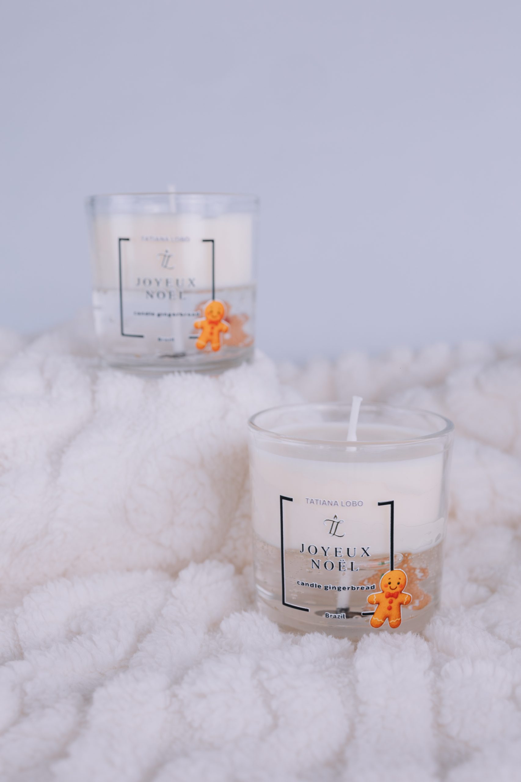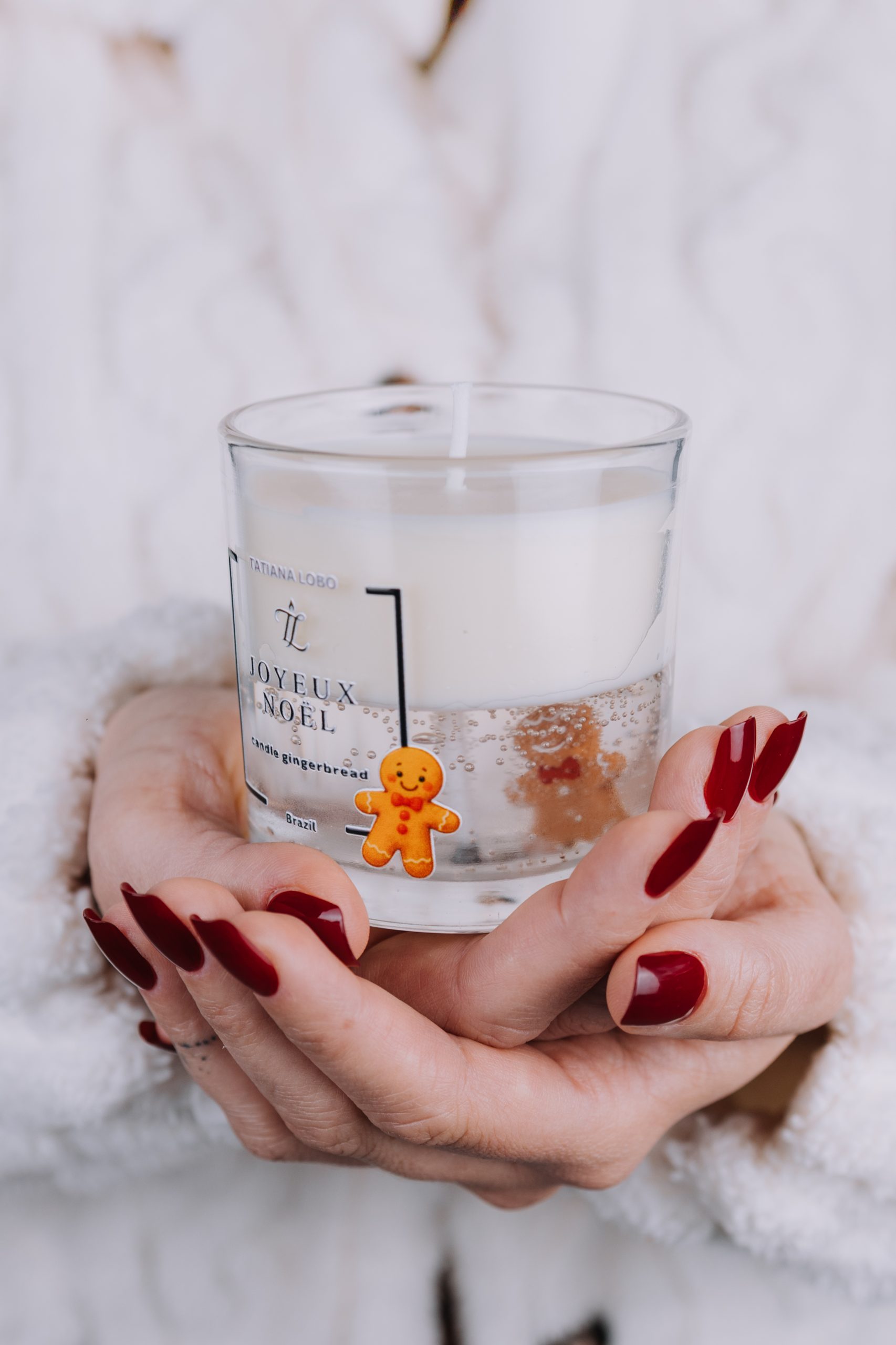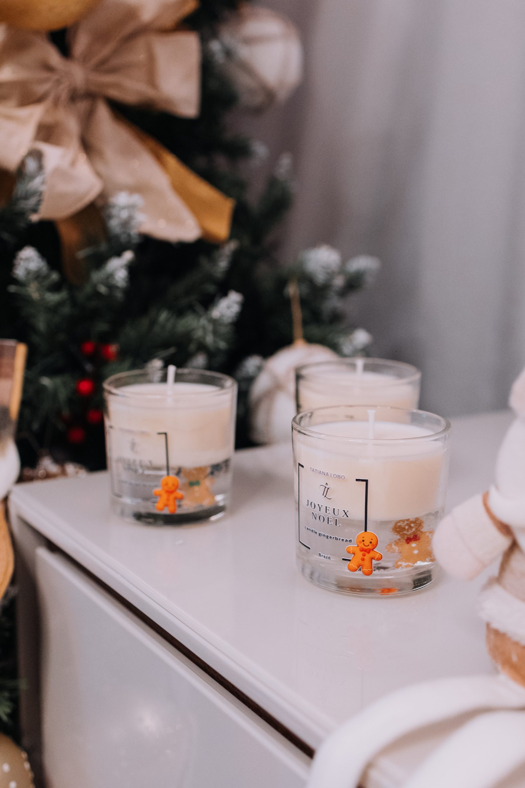 A vela Joyeux Noël é uma peça natalina produzida artesanalmente com blend de cera vegetal natural e cera parafina gel cristal, acondicionada em pote de vidro e com pavio de algodão. Cada vela é enriquecida com essências de gingerbread e apple cinnamon, além de pequenos biscoitos de gengibre açucarados e adesivos decorativos, resultando em uma experiência sensorial completa.