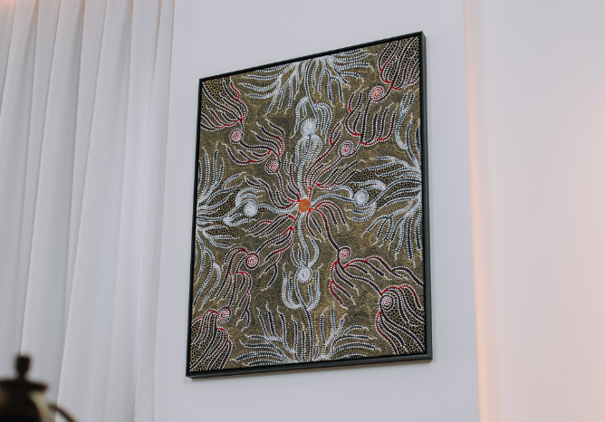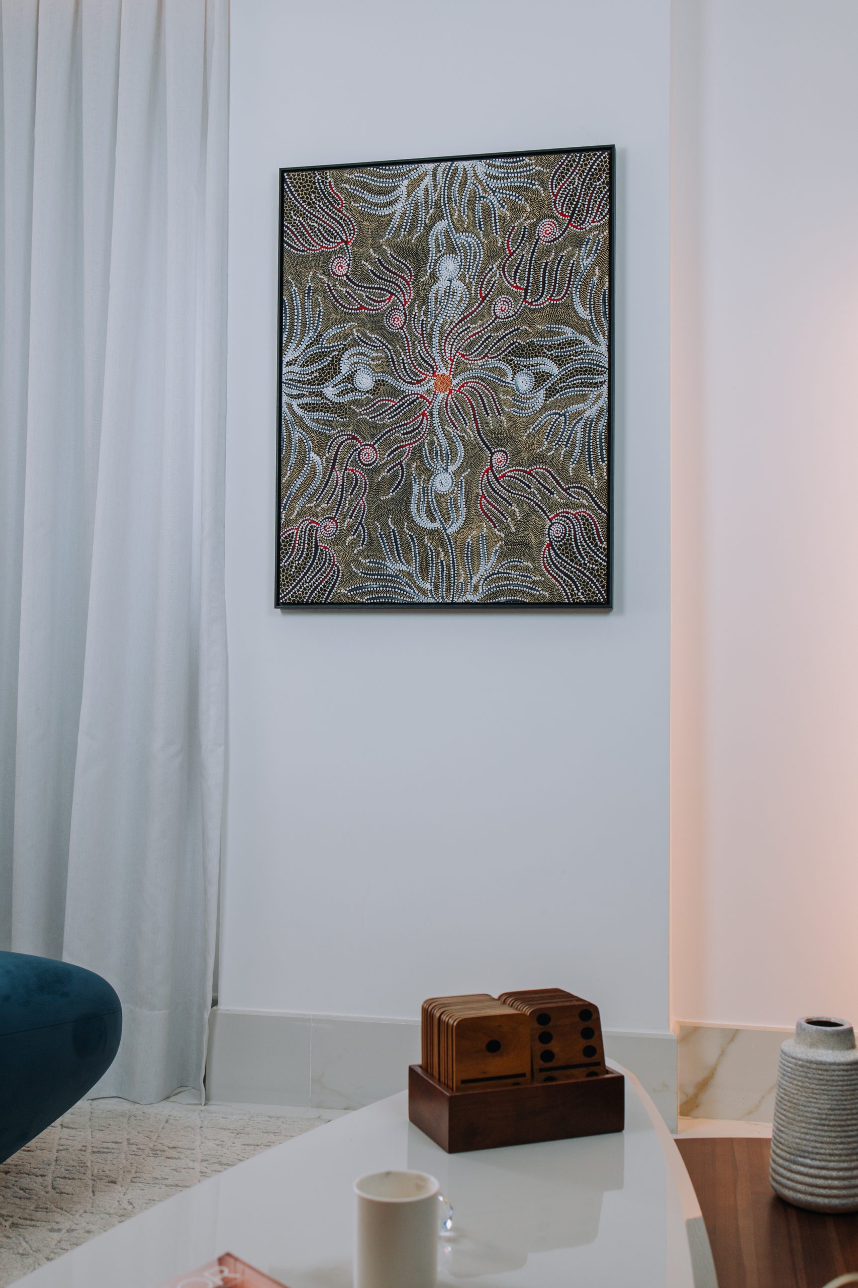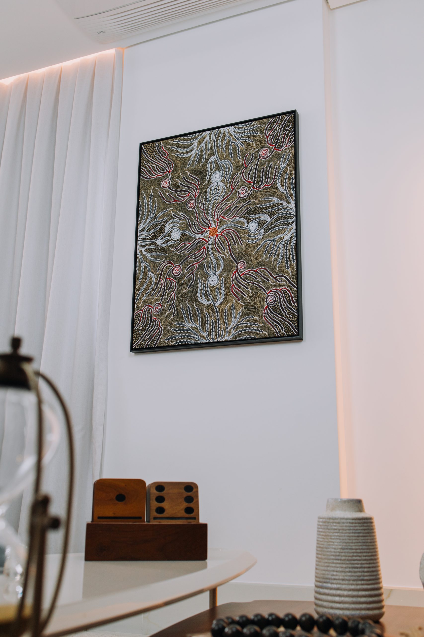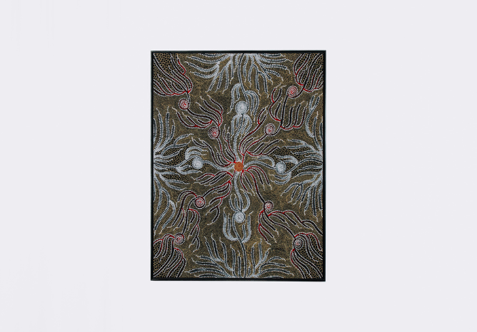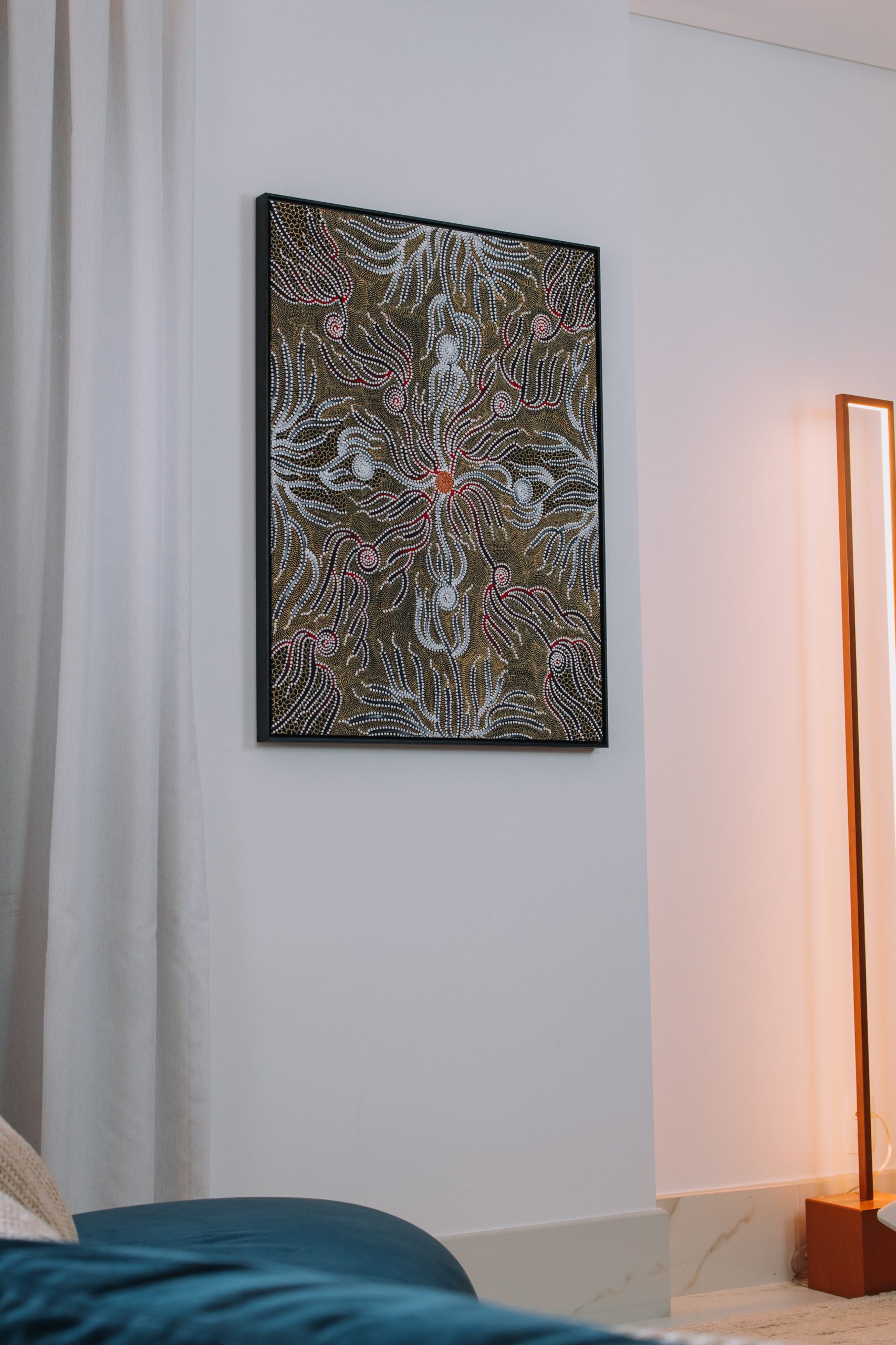 O quadro Water Dreaming, criado pela talentosa Janet Long Nakamarra, revela as profundas cerimônias tribais de invocação da chuva, além de retratar o espírito ancestral da água. Através dessa obra, Janet nos conecta com a arte, a espiritualidade e o rico conhecimento tradicional do povo Warlpiri, transmitindo histórias que atravessam gerações e ecoam além do tempo.
