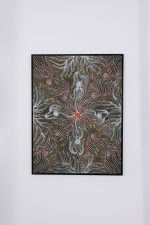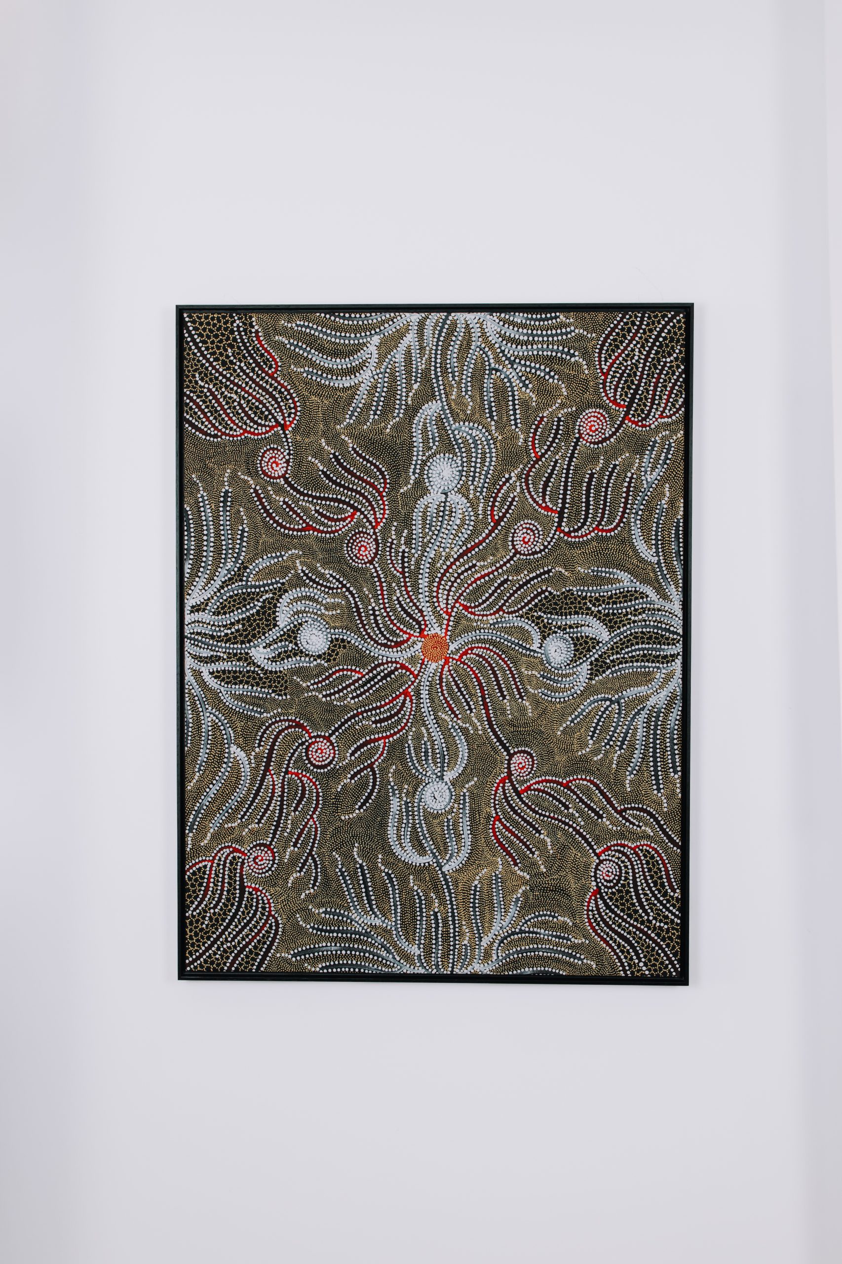 Com linhas sinuosas e formas meticulosamente detalhadas, Janet simboliza os caminhos da água subterrânea e o momento mágico da chegada da chuva. Cada traço e curva em sua pintura nos convida a refletir sobre a relação intrínseca entre terra e água, mostrando a importância vital dos rios e da chuva para a vida e para o povo Warlpiri.